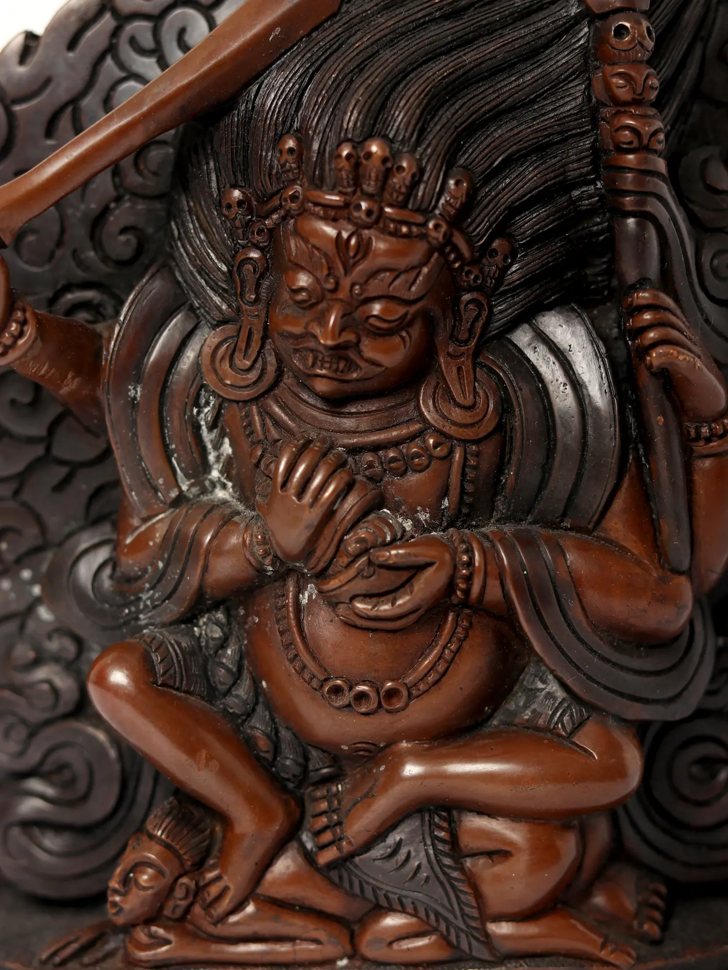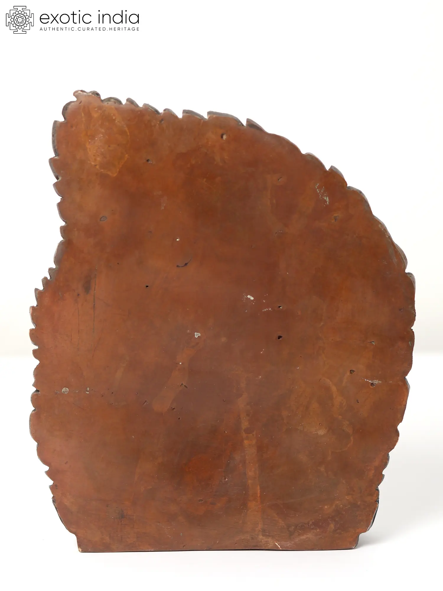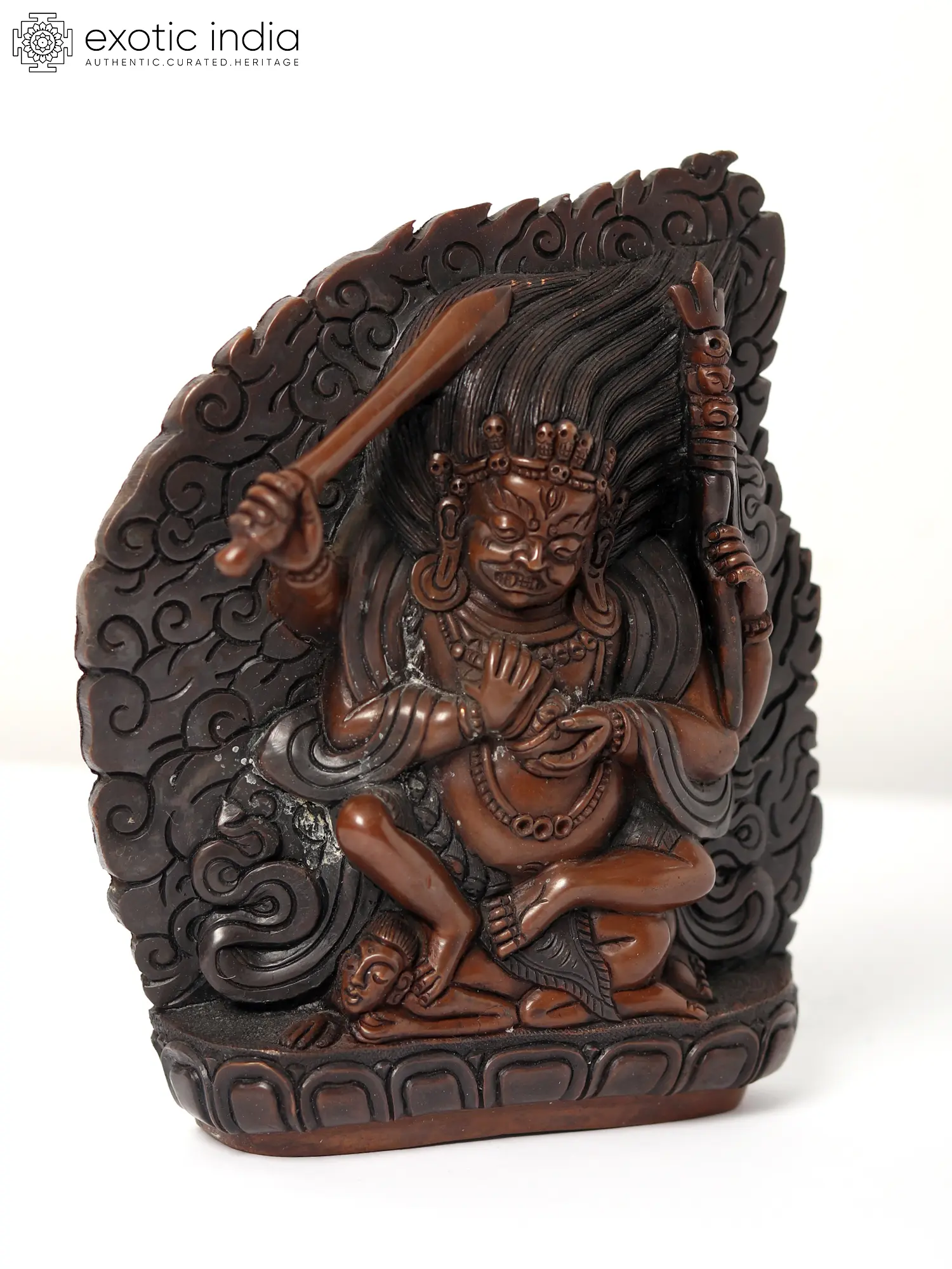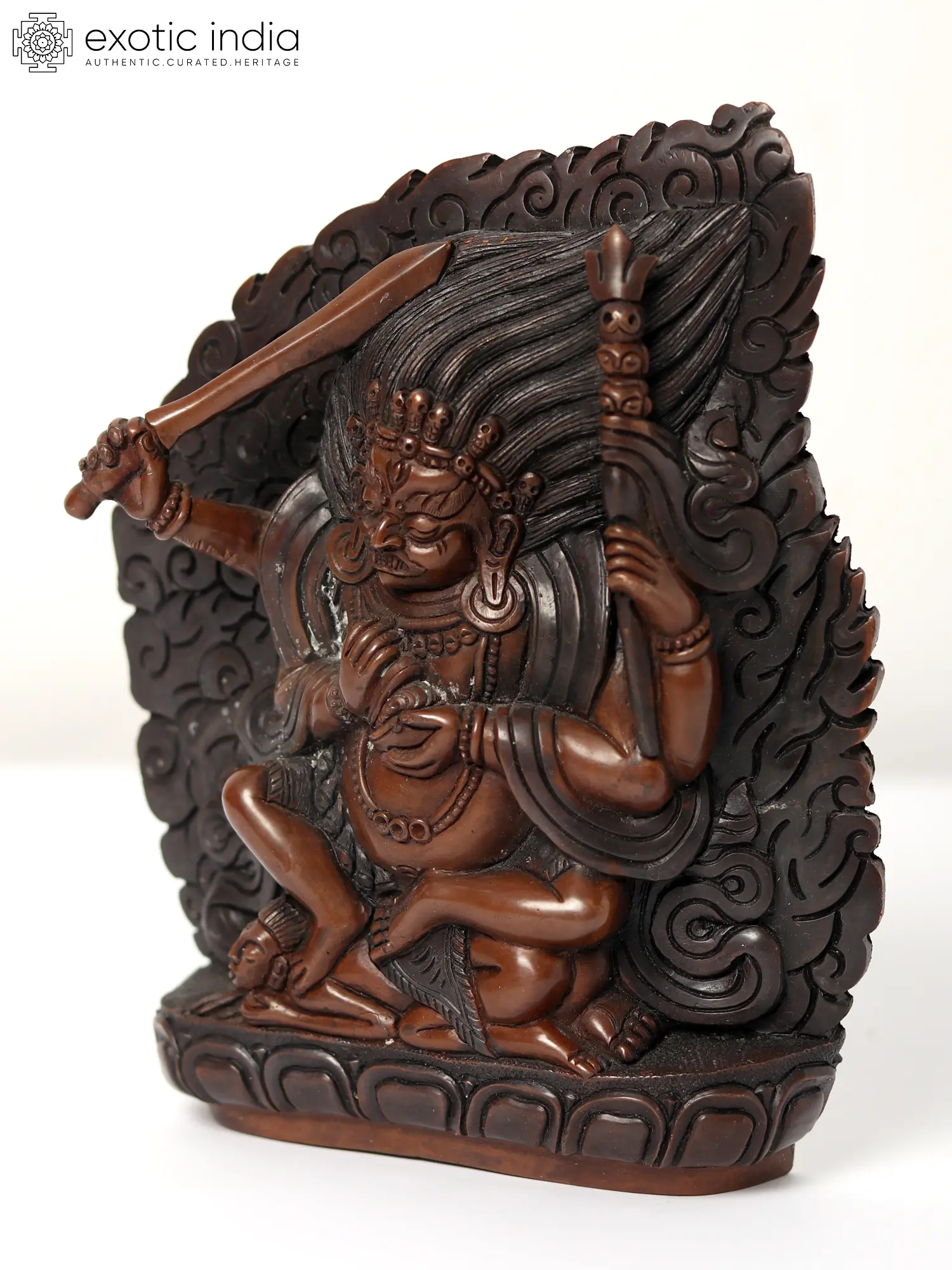 Mahakala- the mighty vanquisher of Kala or death, is a powerful Buddhist deity, revered amongst the Vajrayana as a protector and guide. In this copper icon from Nepal, Mahakala appears in an enchanting stance, his tresses swaying majestically as a halo around his invigorated countenance. Mahakala stands on his enemy, with his four-armed form radiating a splendor in the representation. With an artistic use of dual tone and perfected etched lines to delineate the scene, this artwork achieves a brilliant balance of aesthetics and sacred aura.