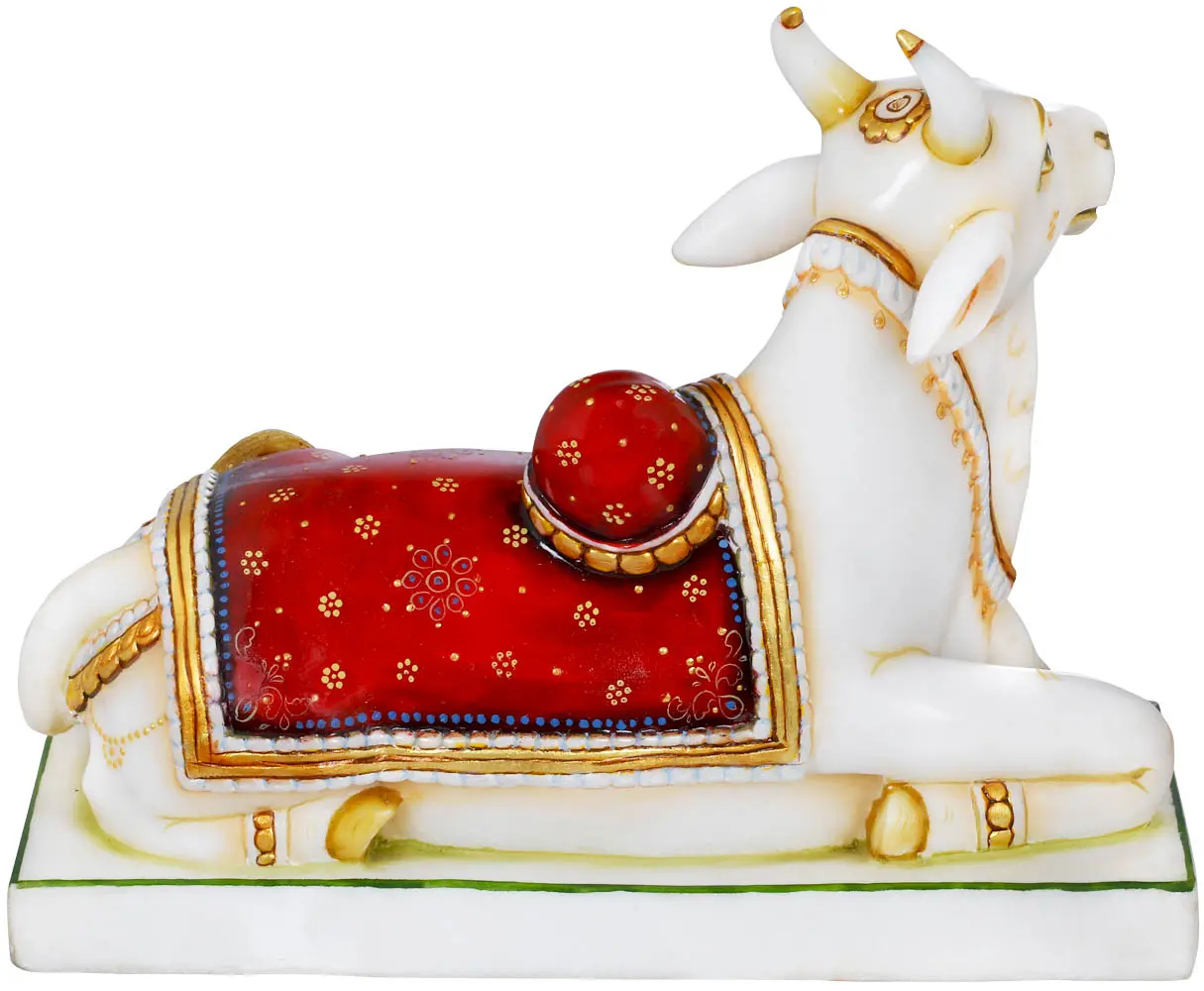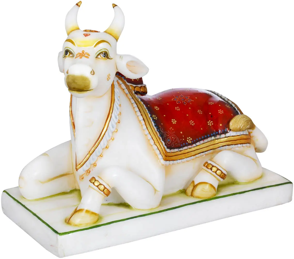 This exquisite sculpture captures the essence of Nandi, the revered Vahana, or divine vehicle, of Lord Shiva. Crafted from the finest white marble, each detail of this piece speaks of meticulous artistry and profound spiritual significance. Nandi, eternally devoted to Shiva, embodies loyalty, strength, and selfless service. His presence is a constant reminder of the unwavering faith and pure devotion that forms the bedrock of spiritual journeys. The white marble itself, with its inherent purity and luminosity, enhances the sacred aura of the sculpture. The smooth, cool surface invites a sense of tranquility, while the subtle veining within the stone hints at the natural beauty and earthbound origins of this sacred material. The sculptor's skillful hands have brought forth a lifelike representation, from the gentle curve of Nandi's horns, tipped with a hint of golden adornment, to the serene expression in his wide, attentive eyes.