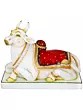 The ornate red blanket adorning Nandi's back is not merely decorative; it is a visual representation of the reverence and care with which he is traditionally depicted. The intricate gold detailing and delicate floral motifs painted upon the fabric further elevate this piece, signifying the opulence and divine grace associated with Lord Shiva and his celestial attendant. The blue border, punctuated by golden beads, adds another layer of visual richness, reminiscent of the celestial canopy or the vibrant colors often seen in sacred Indian textiles. In Hindu mythology, Nandi is more than just a mount; he is a guardian, a sage, and a symbol of Dharma, righteousness. It is said that Nandi was a great Rishi who performed intense penance and austerities, earning the favor of Lord Shiva, who then appointed him as his personal attendant and vehicle. His posture, elegantly seated and alert, signifies his readiness to serve and carry his master through the cosmic realms. The sculpture masterfully conveys this eternal vigilance and steadfast devotion, making it a powerful focal point for any sacred space.