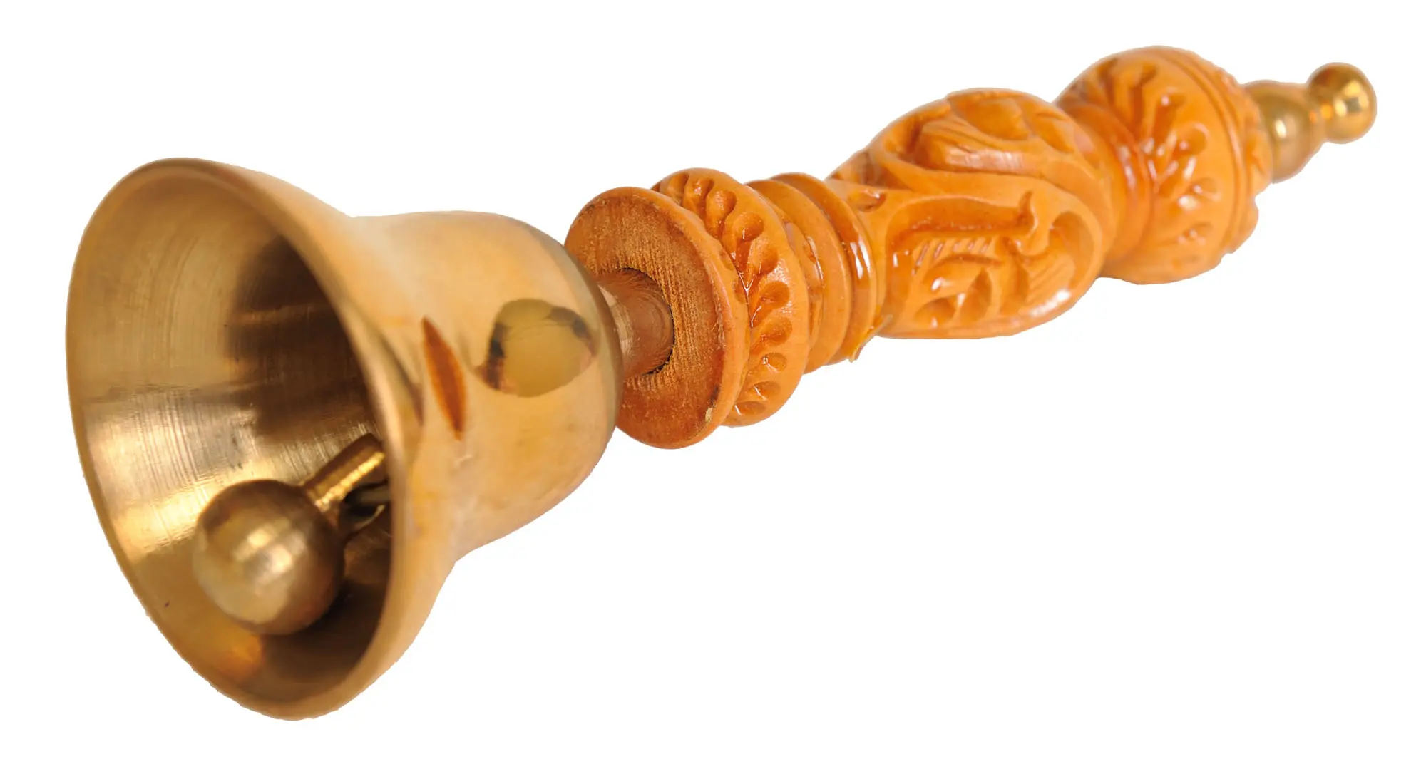 The union of polished bronze and richly detailed wood creates a visually striking and tactilely pleasing instrument. The bell itself, fashioned from durable bronze, promises a clear, sustaining tone that will fill your space with its sacred resonance. The handle, carved from wood, is a testament to the skill of the artisan. Each curve and detail is meticulously shaped, featuring ornate patterns that speak to a deep understanding of form and aesthetics. The warm hue of the wood and its smooth finish provide a comfortable and elegant grip, making the act of ringing the bell a serene and mindful experience. This harmonious blend of materials elevates the bell from a simple devotional tool to a piece of functional art, designed to be both spiritually uplifting and aesthetically pleasing.