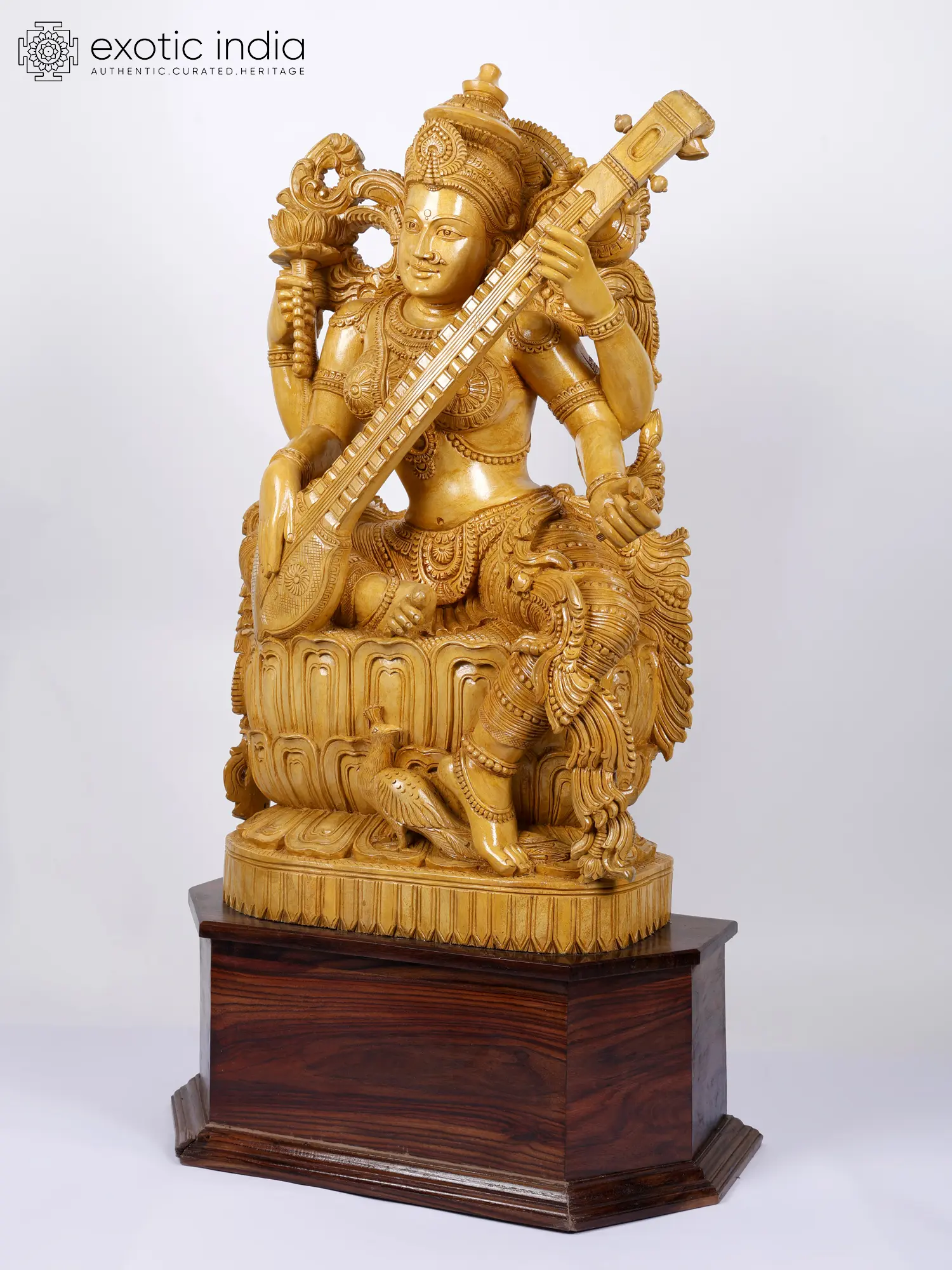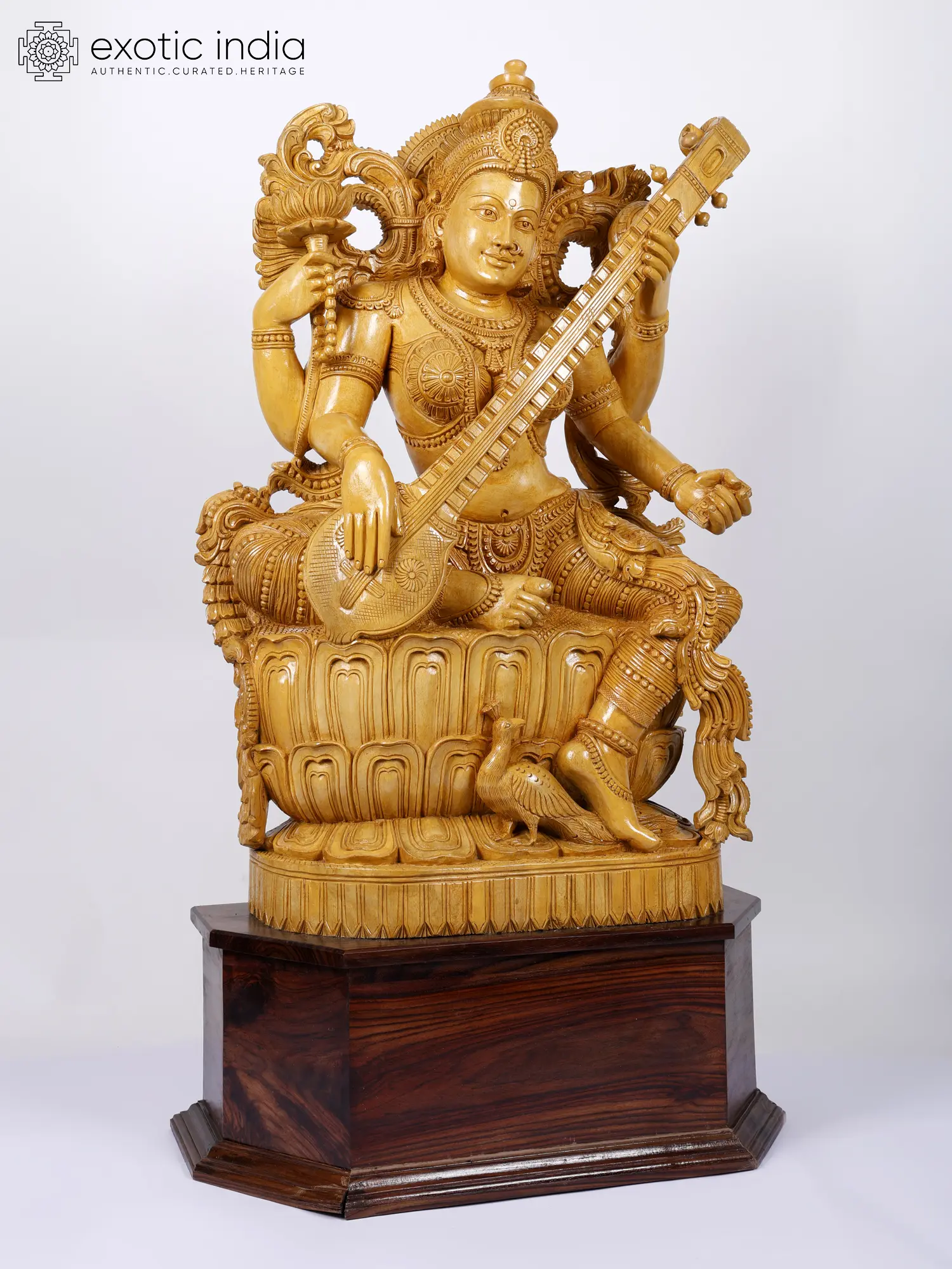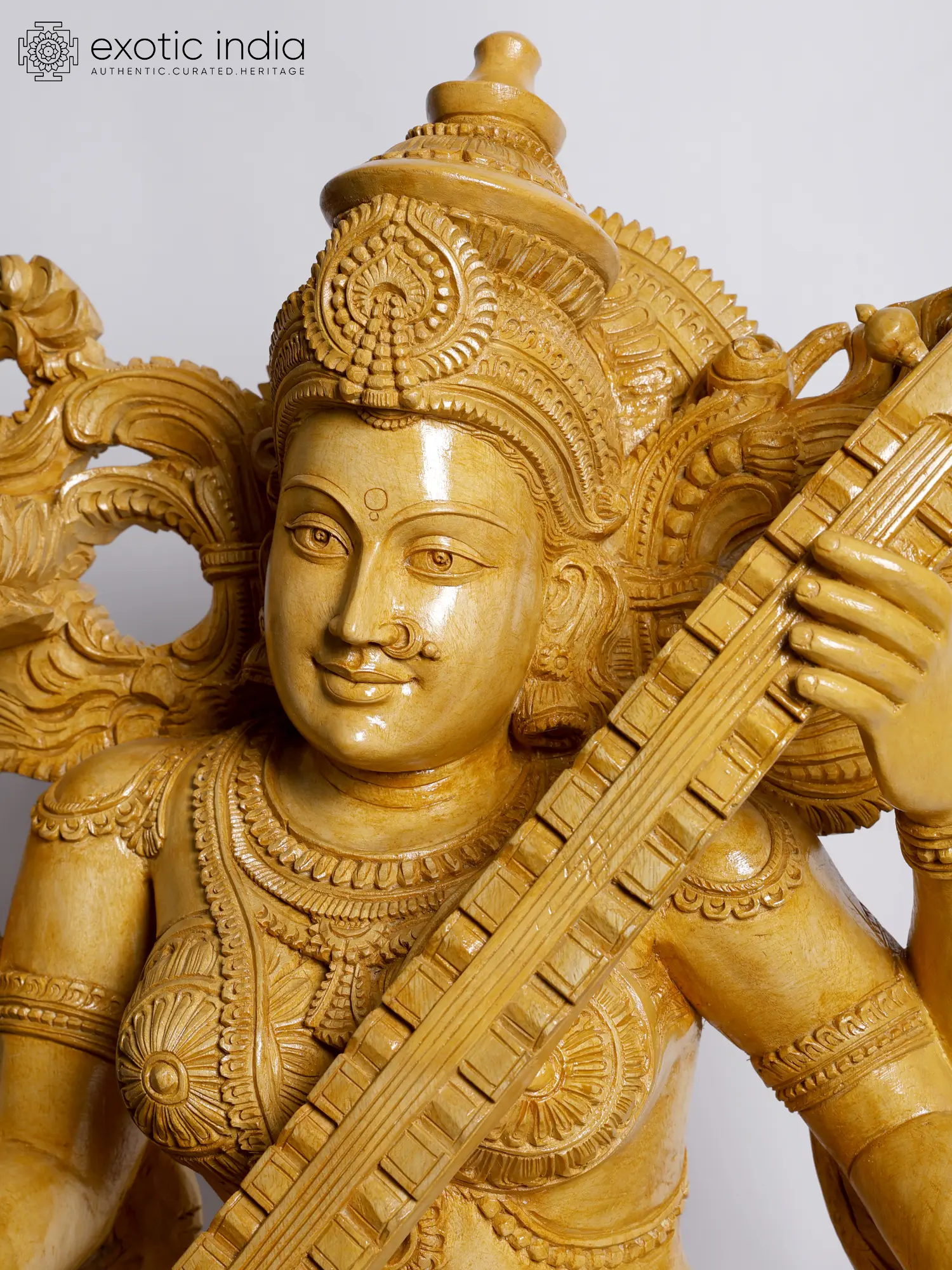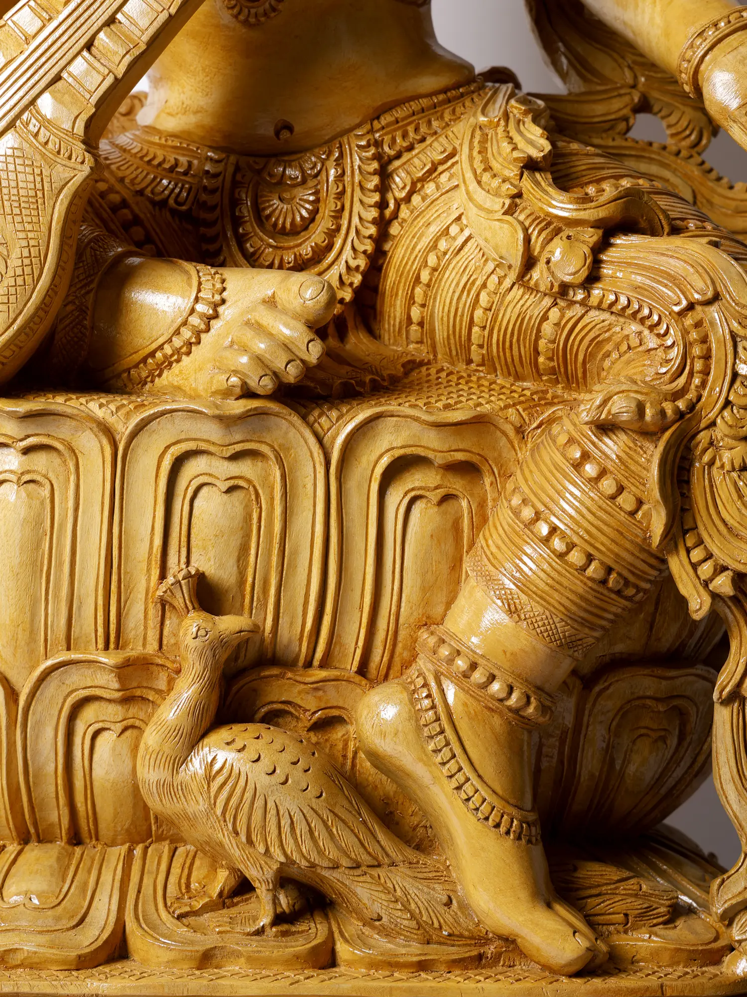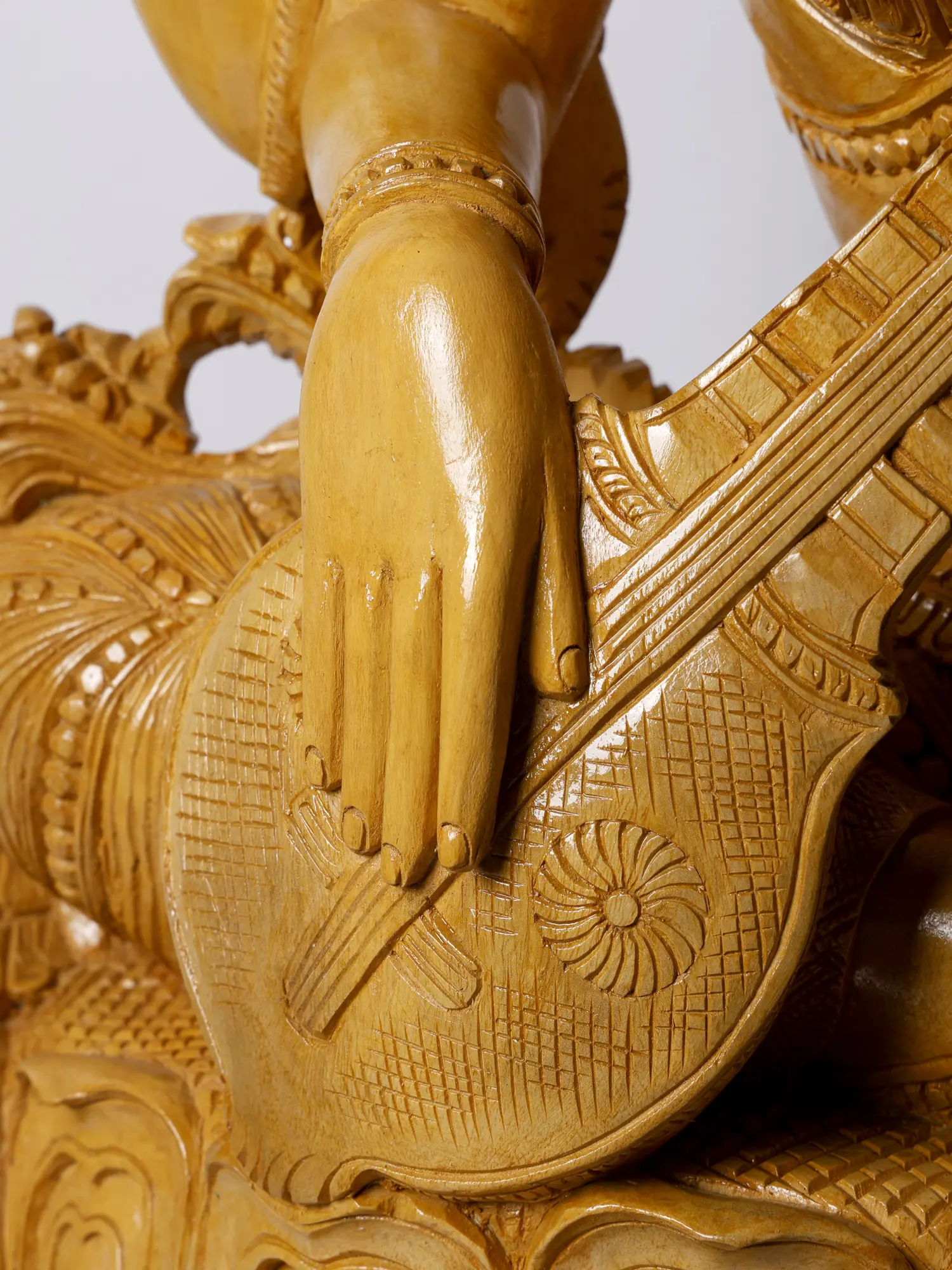 Her front right and back left hand play upon the Veena which is rendered with realistic details and is indeed the highlight of the statue.The other two hands of the goddess hold a book (symbolic of knowledge) and a rosary (symbol of concentration and meditation). Thus establishing Saraswati not only as the Goddess of Art but also the artistic process.This is a Shivani wood carving. It is a traditional craft that originated in the Shivani village, located in the Shimogga region of Karnataka. Such statues typically have a strong decorative element, materially highlighting the spiritual aspect of the divine personality.