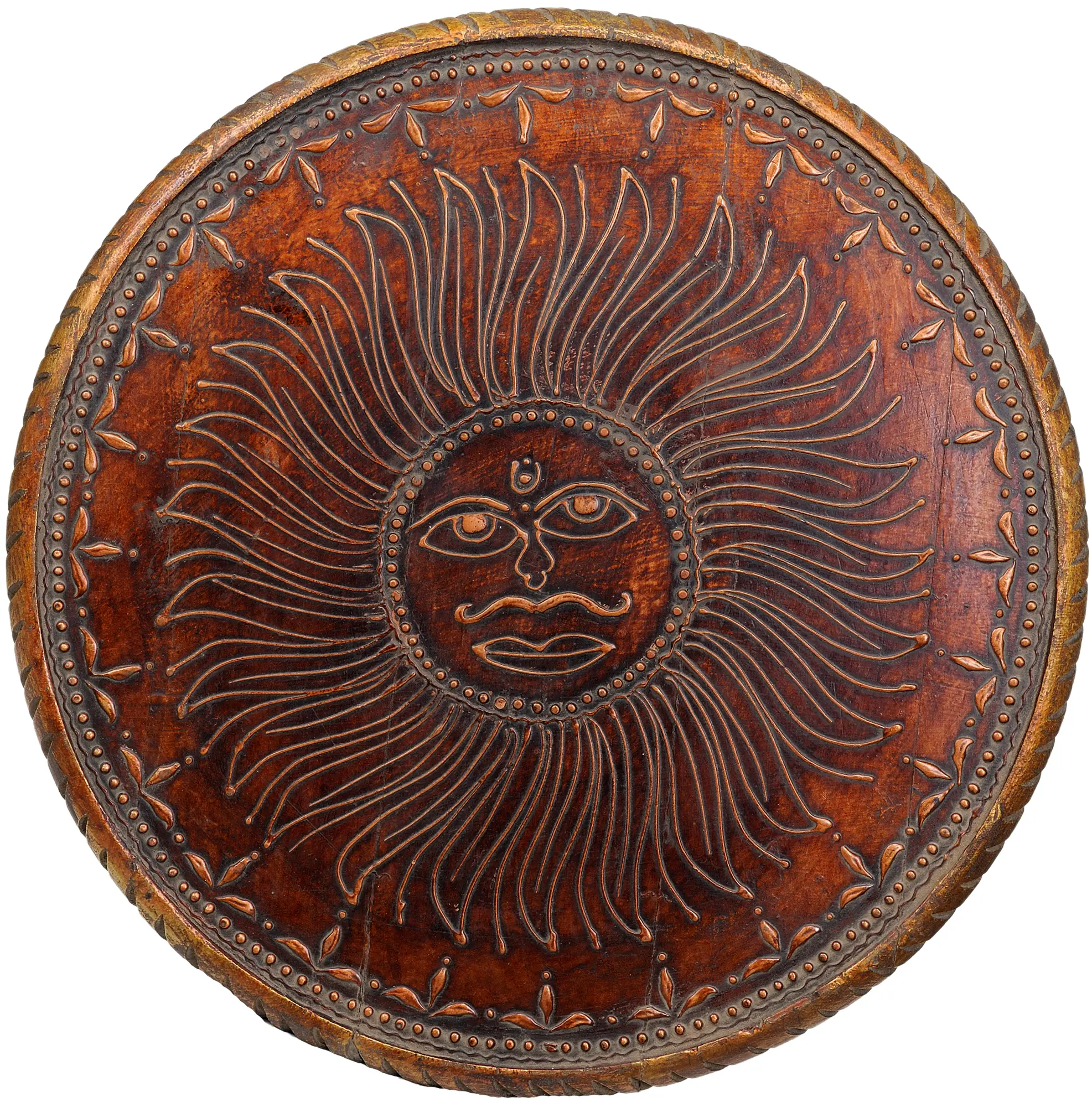 This exquisite wooden table is more than just a piece of furniture; it is a testament to the rich artistic heritage and spiritual devotion found in Indian craftsmanship. The circular top of the table is intricately carved with the radiant visage of Surya, the Hindu god of the sun. Surya, often depicted as a resplendent being riding a chariot pulled by seven horses, is a central deity in Vedic tradition, symbolizing light, energy, life, and the passage of time. His presence on this table evokes a sense of warmth, positivity, and divine illumination, bringing a touch of sacredness to your living space. The detailed carving of Surya's benevolent face, radiating outwards, is a masterpiece that speaks of skill passed down through generations. ––––––––––