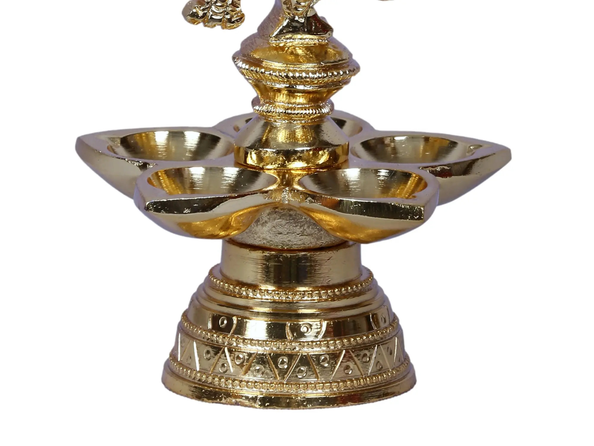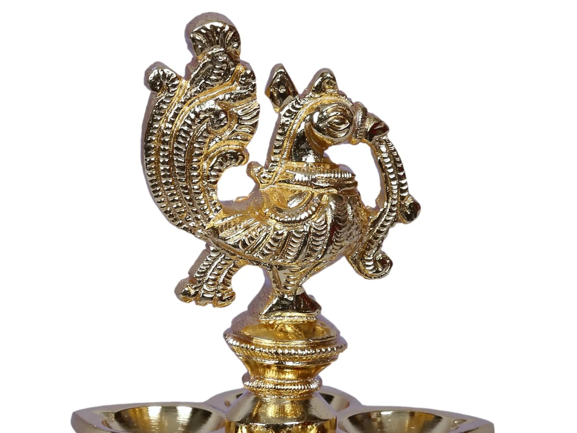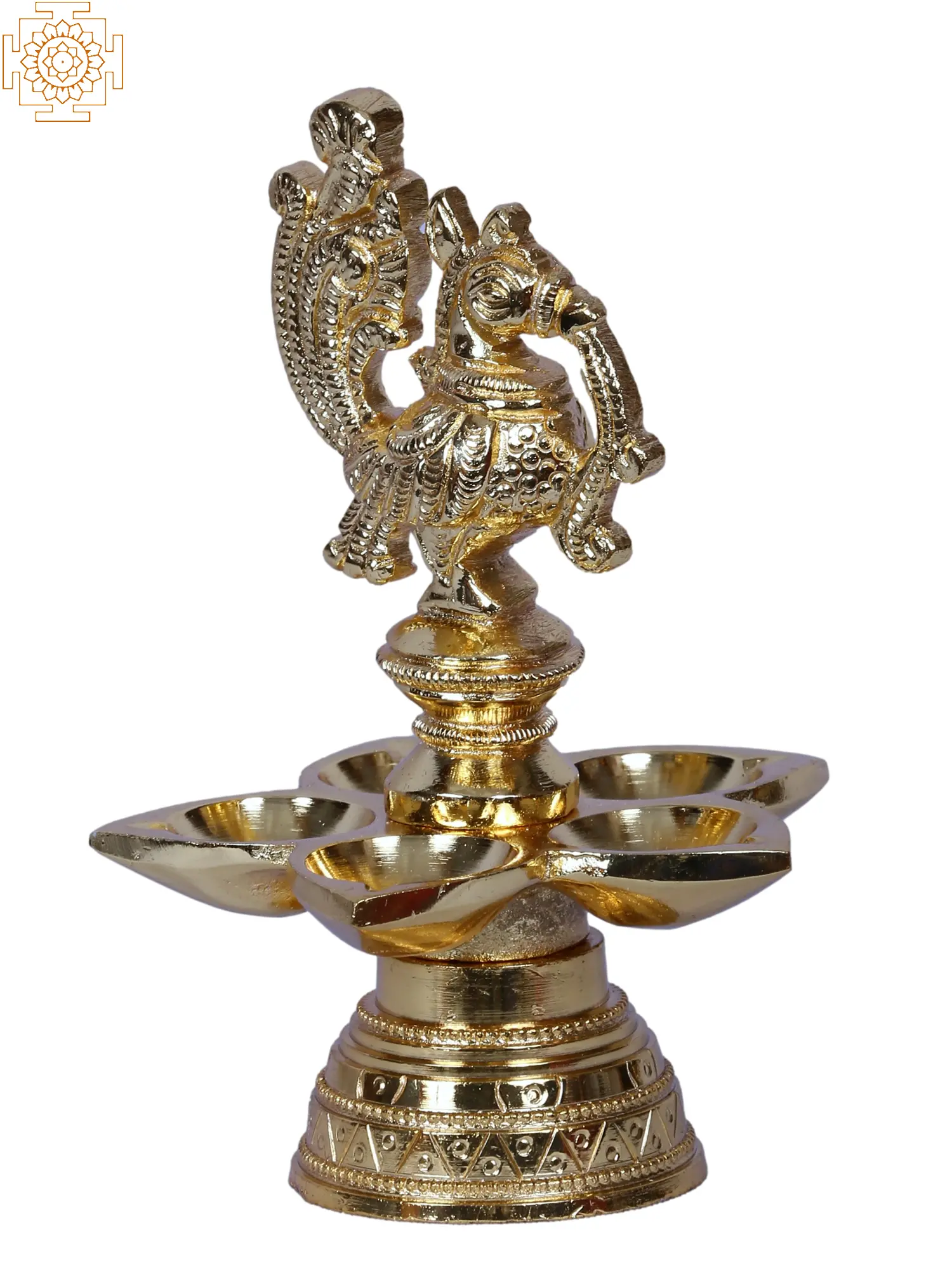 This five-wick lamp with a center peacock pattern is commonly referred to as a Mayil Vilakku. It is crafted of high-quality brass and gold-plated to give it a royal gleam. The lamp's five wicks are inspired by a Bhadradeepam. Each of these five flaming candles is thought to depict one of Lord Shiva's five faces. The auspicious five-wick light is said to bring success and fortune by lighting five directions.
