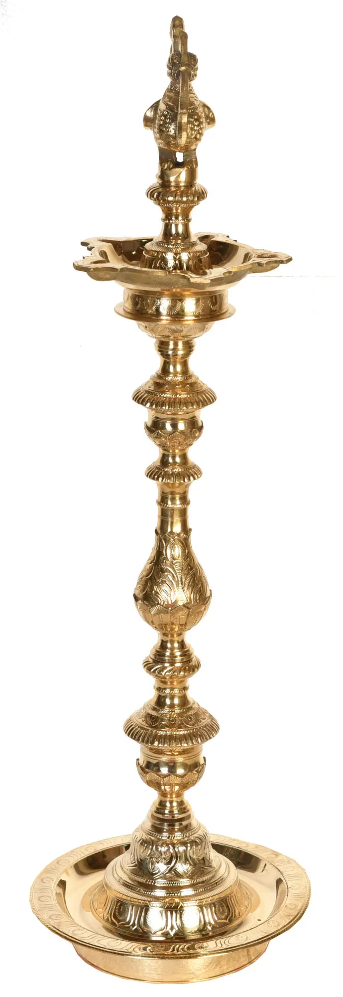 The lamp itself is a masterpiece of brass craftsmanship. Its tall, elegant stand is adorned with intricate carvings and layered moldings, reminiscent of temple architecture and the rich decorative traditions of the region. Each segment of the stand, from the broad, circular base designed to catch any stray drips of oil, to the central sculpted column and the elaborately tiered structure supporting the wicks, showcases meticulous attention to detail. The five wick holders are thoughtfully arranged, promising a generous and captivating display of flickering flames, symbolizing prosperity, knowledge, and the dispelling of darkness.