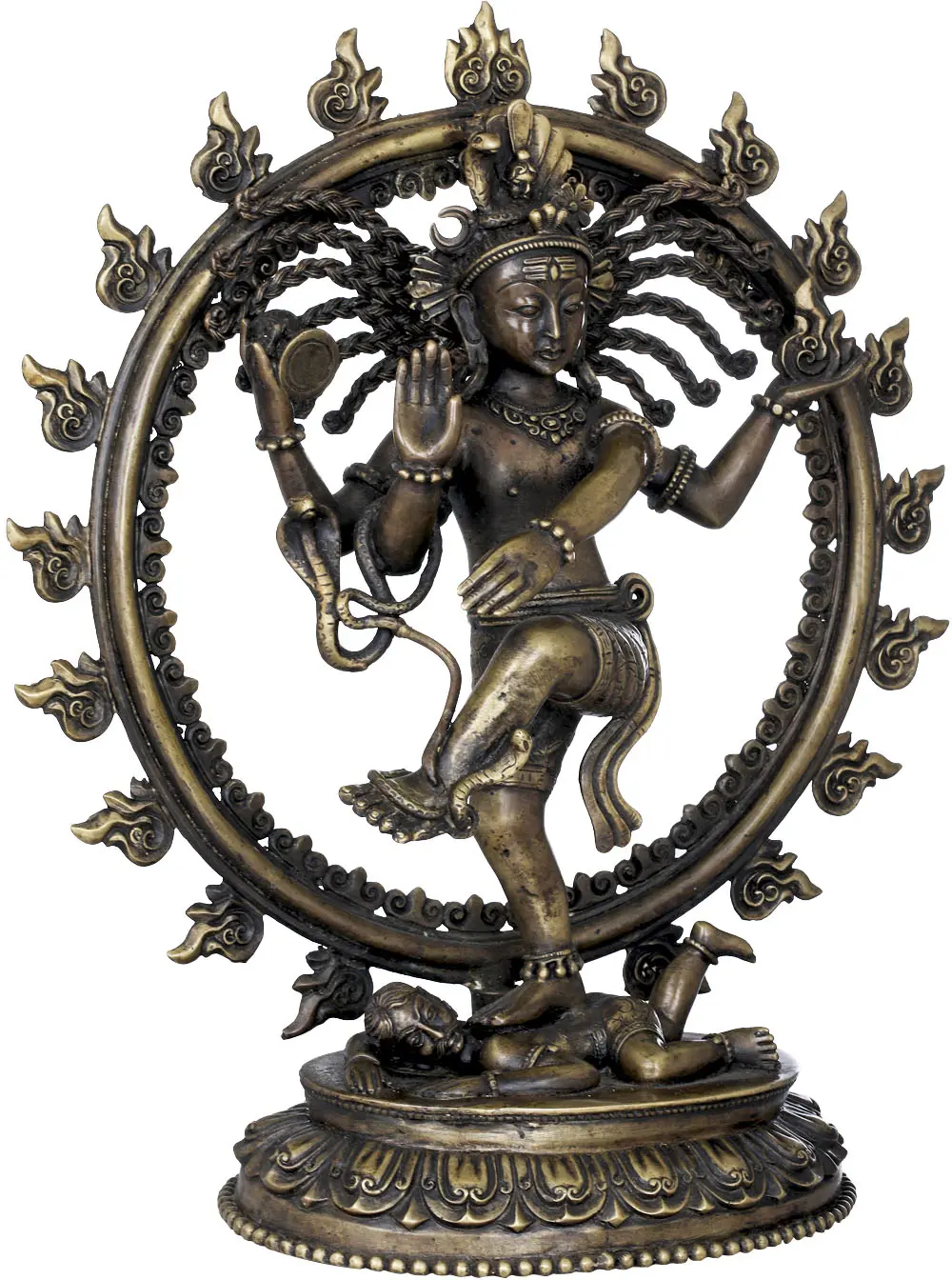 A number of aspects set this work apart from your run-of-the-mill Nataraja sculptures. It is a compact composition - the flame-spewing aureole is a perfect round, the asymmetrical dancing figure placed therein filling it up completely. The Lord’s hair is in a bunch of plaits that are flying about His face despite the weight, conveying the intensity of His divine motion. The shringar is minimal but substantial. A cobra dangles from one of His limbs, its hood raised, stance as dynamic is Lord Shiva’s itself.