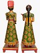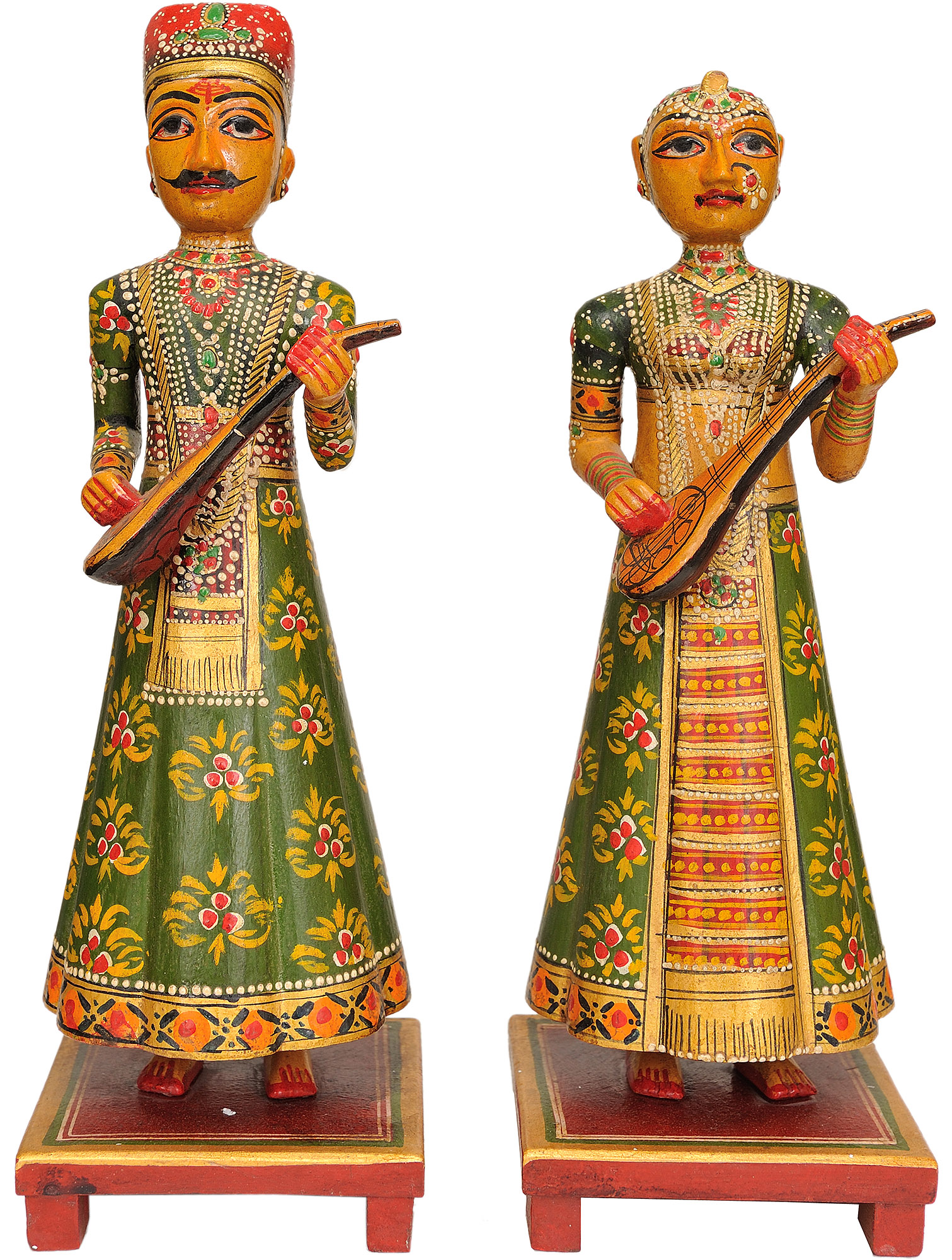 Infuse your space with the soul-stirring resonance of folk music and the rich tapestry of Indian artistry with this exquisite wooden figurine pair. These captivating figures embody the spirit of traditional musicians, their poised stances and the instruments in their hands hinting at melodies that have echoed through generations. Crafted from wood, each piece is a testament to skilled craftsmanship, meticulously hand-painted with vibrant colors and intricate details that tell a story of culture and heritage. The male figure, adorned in a regal turban and a flowing kurta, exudes a dignified presence. His eyes, accentuated with bold strokes, seem to gaze with a musician's focus, while his neatly trimmed mustache adds a touch of traditional charm. He cradles a stringed instrument, its form suggestive of the ancient tanpura or sitar, instruments that have been central to Indian classical and folk music for millennia. The intricate patterns on his attire, featuring floral motifs and geometric designs, speak of the opulence and artistic flair characteristic of royal courts and festive gatherings. Beside him stands his female counterpart, equally resplendent. Her headdress, decorated with pearls and subtle embellishments, frames a face that is both serene and expressive. Her attire mirrors the richness of the male figure, with a striking green ensemble embellished with floral designs, and a contrasting inner panel of vibrant stripes and delicate beadwork. The instruments they hold are not mere props but symbols of the harmonious interplay of melodies that have been passed down through oral traditions, often accompanying epic tales and devotional songs.