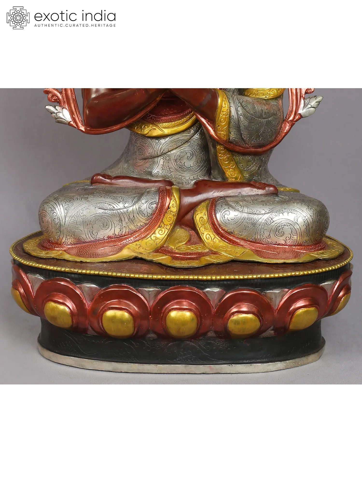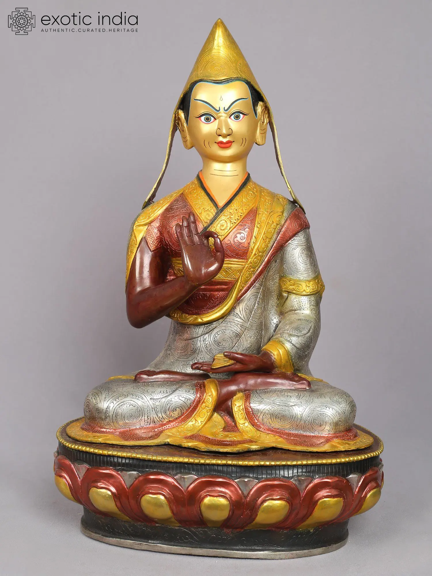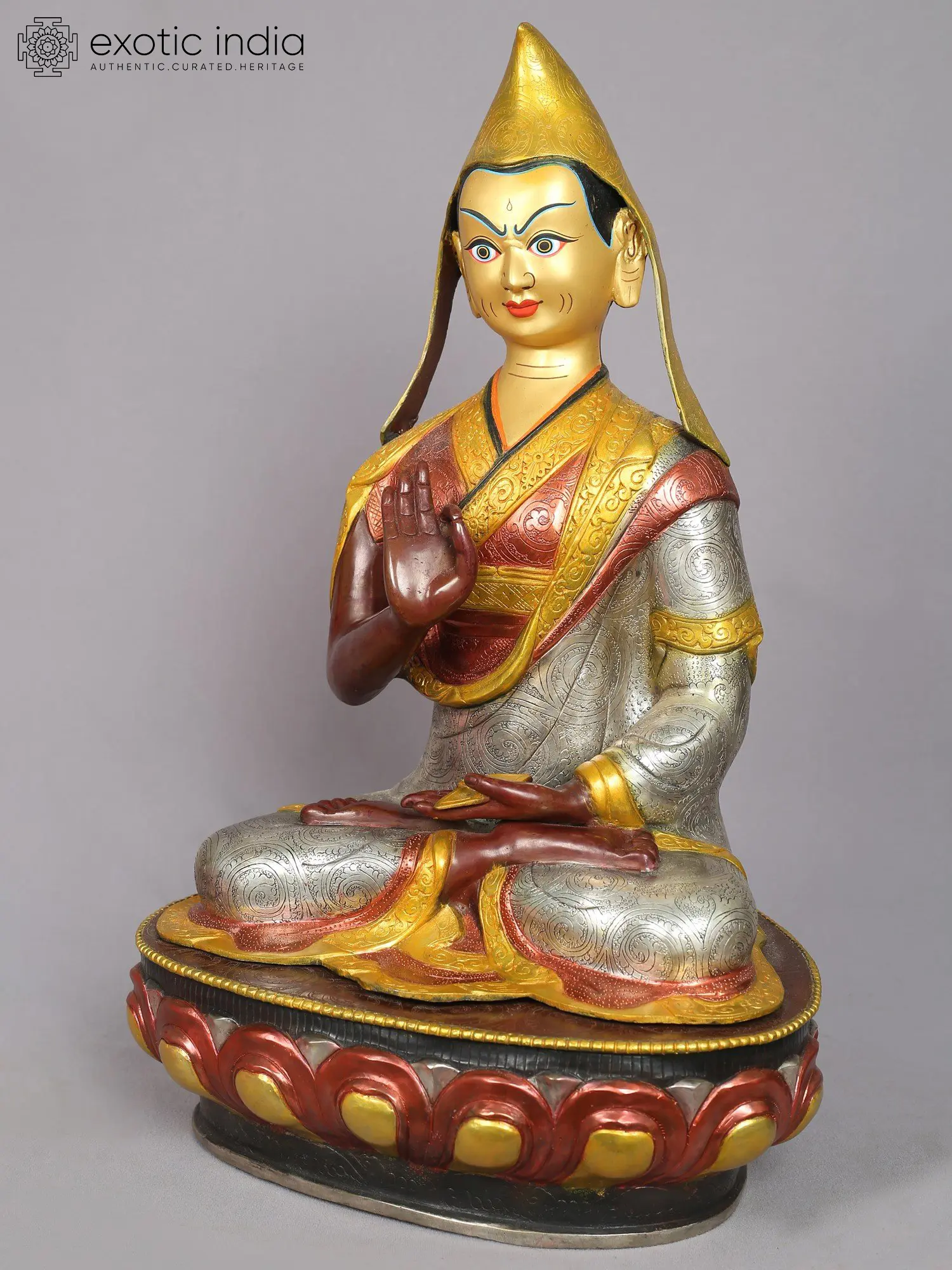 Tsongkhapa in Buddhist culture is the establisher of the Gelugpa sect, a prominent Vajrayana order to which belong the Dalai Lamas. The glistening golden cap of Tsongkhapa in these Nepalese gilded copper statues is symbolic of the order he founded, known as the Yellow Hats. The three statues from Nepal present the teacher in varied states of enlightened existence. One depicts him with the gesture of turning the wheel of Dhamma, while the other two belonging to his mature age, show him teaching the Dhamma, with the Vitarka Mudra and a book.
