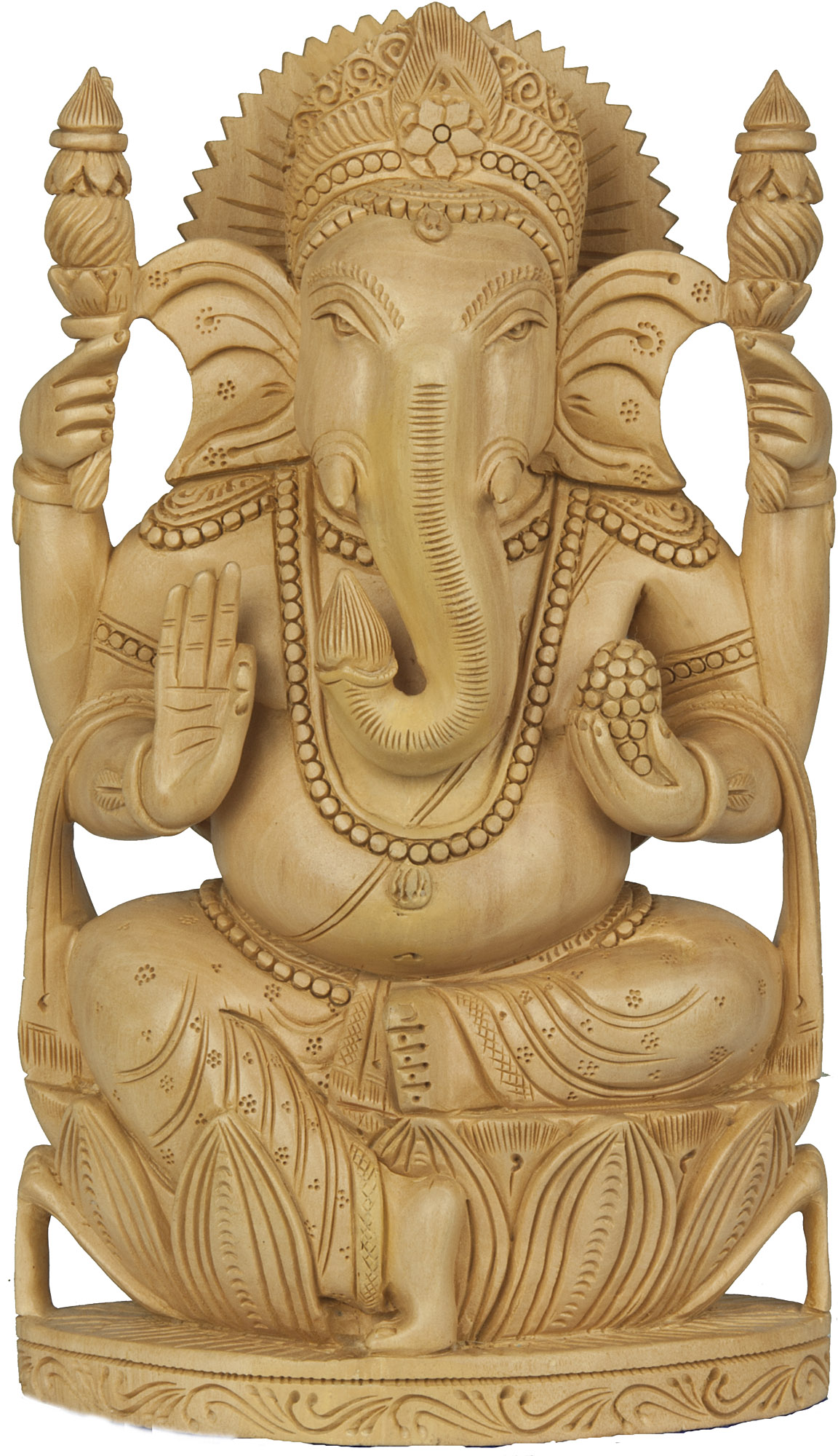 Seated in the Lalitasana posture, also known as the "royal ease" pose, Ganesha exudes a sense of tranquility and accessibility. This relaxed yet dignified posture symbolizes his approachability and the ease with which he can be called upon for assistance. The lotus upon which he sits represents purity, enlightenment, and spiritual awakening, reinforcing his role as a guide on the path to knowledge and self-discovery. The four arms of Ganesha are rich in symbolism. One hand is held in the Abhaya Mudra, the gesture of fearlessness and protection, offering reassurance to devotees. Another hand often holds sweets (modaks), representing the sweetness of realized knowledge and the rewards of spiritual practice. The other two hands, in this sculpture, hold symbols which reflect the prosperity and wisdom Ganesha bestows upon those who worship him.