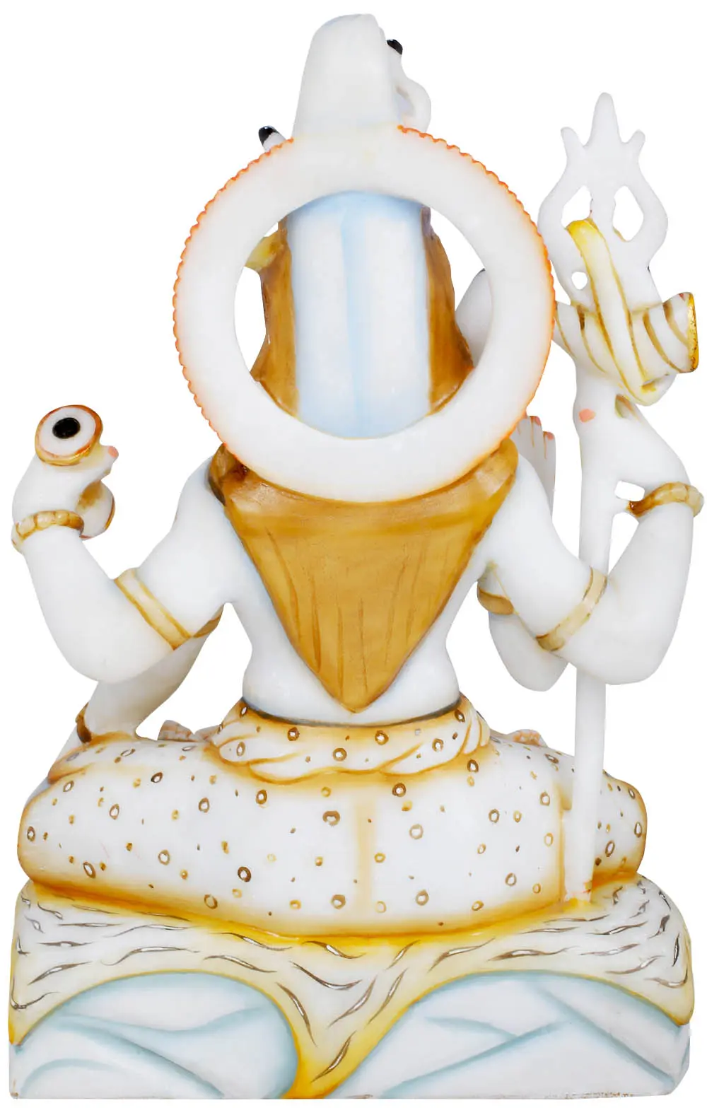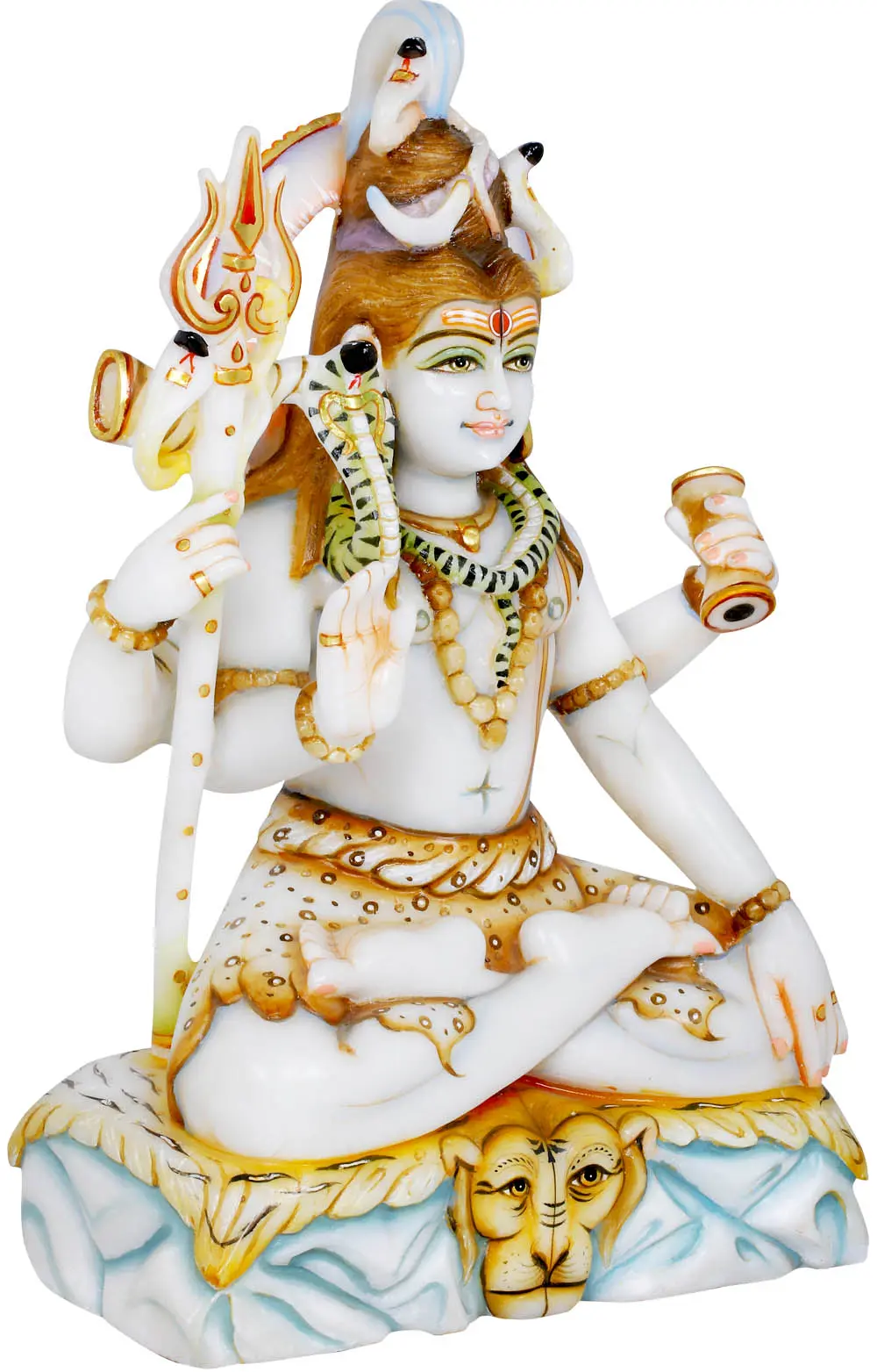 The meticulous detailing and polished finish of this white marble statue speak volumes about the skill of the artisan. The delicate brushstrokes that highlight the eyes, the intricate patterns on the garments, and the subtle rendering of the musculature all contribute to the lifelike and captivating presence of the deity. The gold accents add a touch of opulence and grandeur, further enhancing the divine aura of the sculpture. Each element is carefully rendered to honor the traditional iconography of Lord Shiva, making this piece a testament to both artistic mastery and deep devotion. This statue is not merely an object of art but a sacred representation that can bring a sense of peace, spirituality, and divine grace into any space.