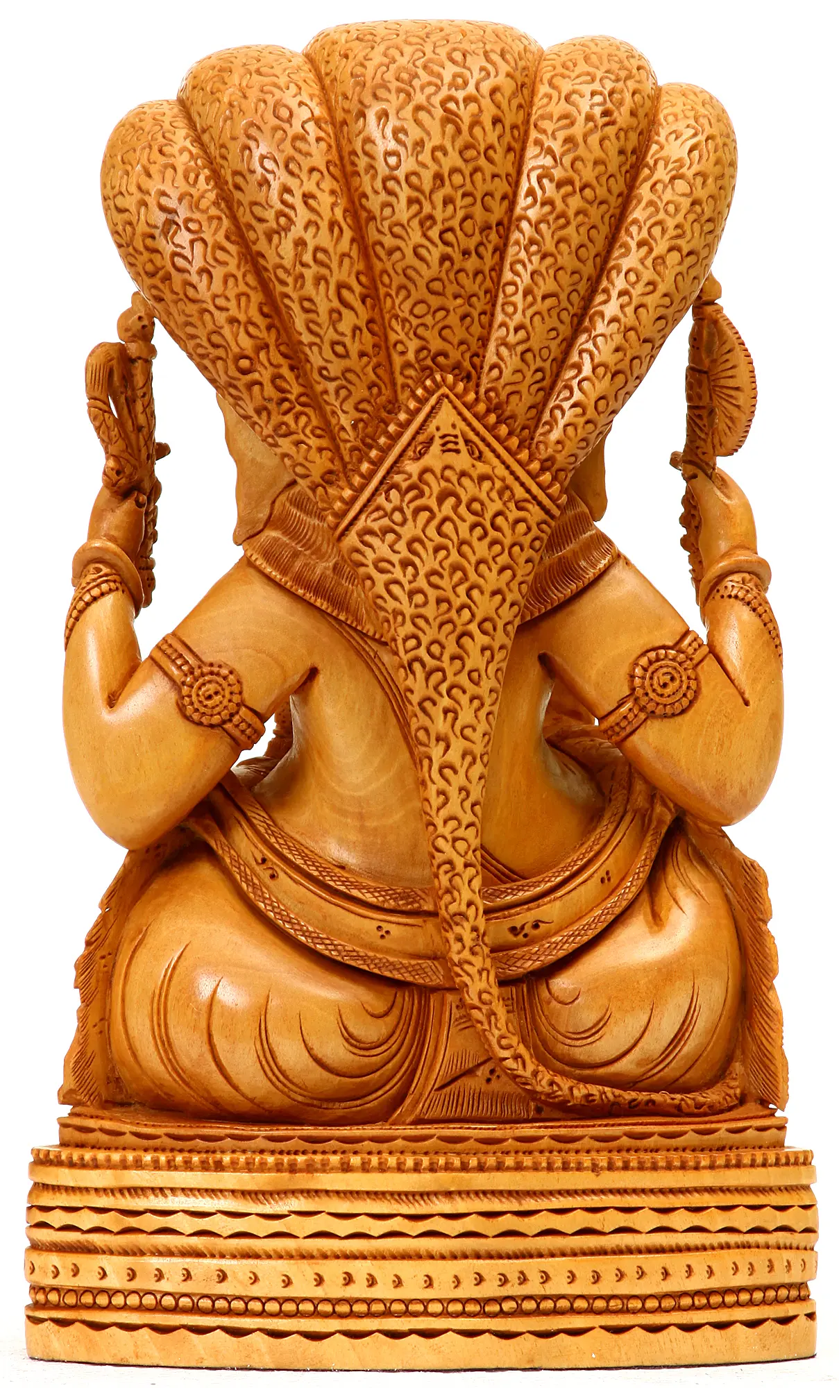 This exceptional piece is handcrafted from Kadamba wood, known for its smooth texture and light color, which beautifully highlights the intricate details of the carving. The artisans of Jaipur, India, are celebrated for their generations-old tradition of wood carving, mastering the art of transforming raw materials into sacred expressions. The sculpture showcases this mastery, capturing the deity’s divine essence. Notice the precision in the detailing of Ganesha's ornaments, the folds of his dhoti, and the delicate scales of the serpent. Even Ganesha’s vahana, the mouse, is meticulously carved near the base, representing humility and the ability to overcome any obstacle, no matter how small. Bring home the blessings of Ganesha, crafted with skill and devotion.