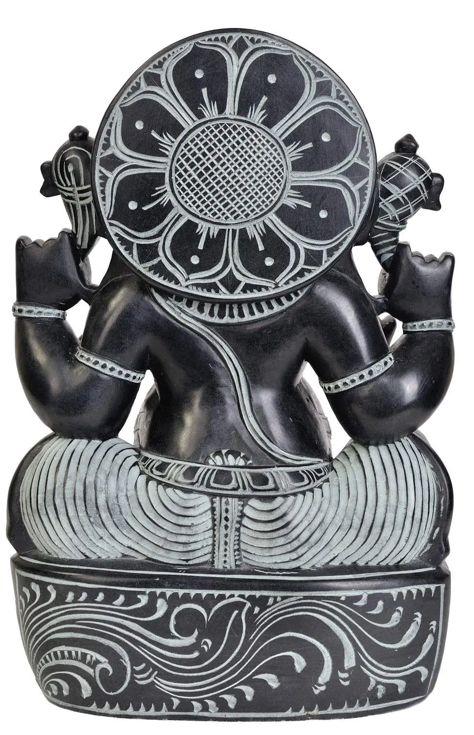 Ganesha, the elephant-headed god, is a central figure in Hindu mythology, revered as the remover of obstacles and the patron of arts and sciences. This particular depiction, with its seated posture and multiple arms, signifies his serene power and his capacity to manage various aspects of existence. The base of the sculpture, adorned with motifs reminiscent of sacred iconography, further anchors its spiritual significance and ancient heritage.