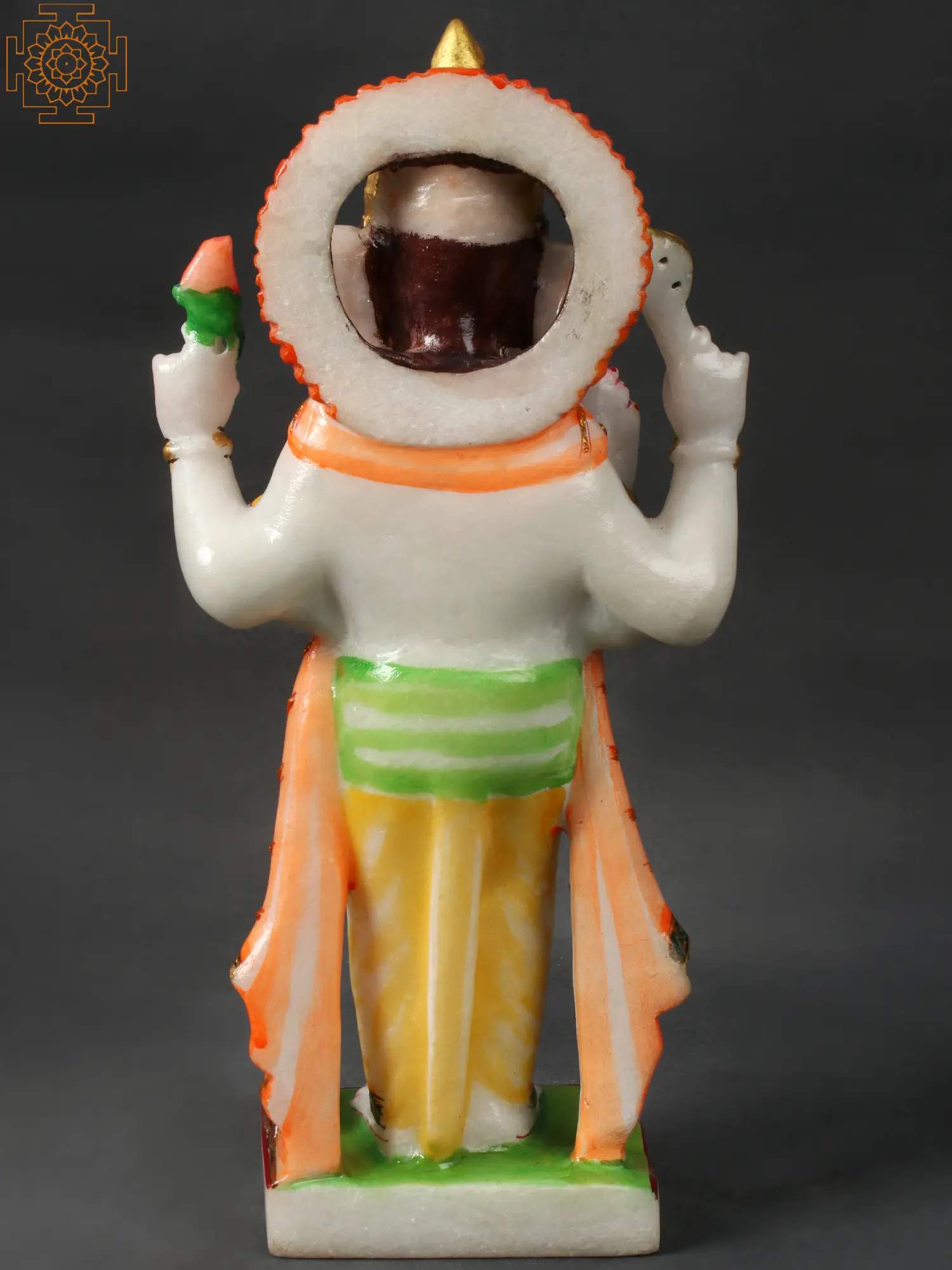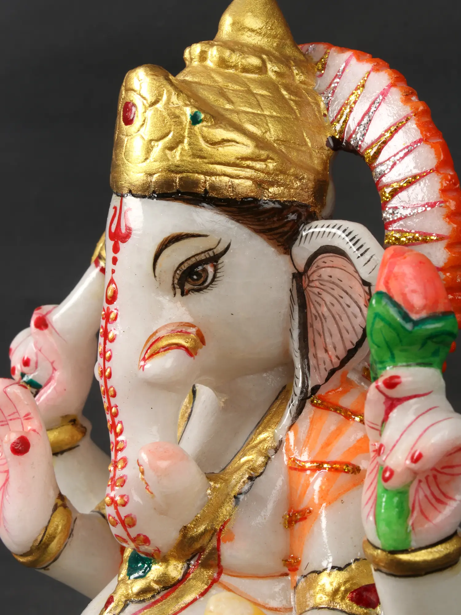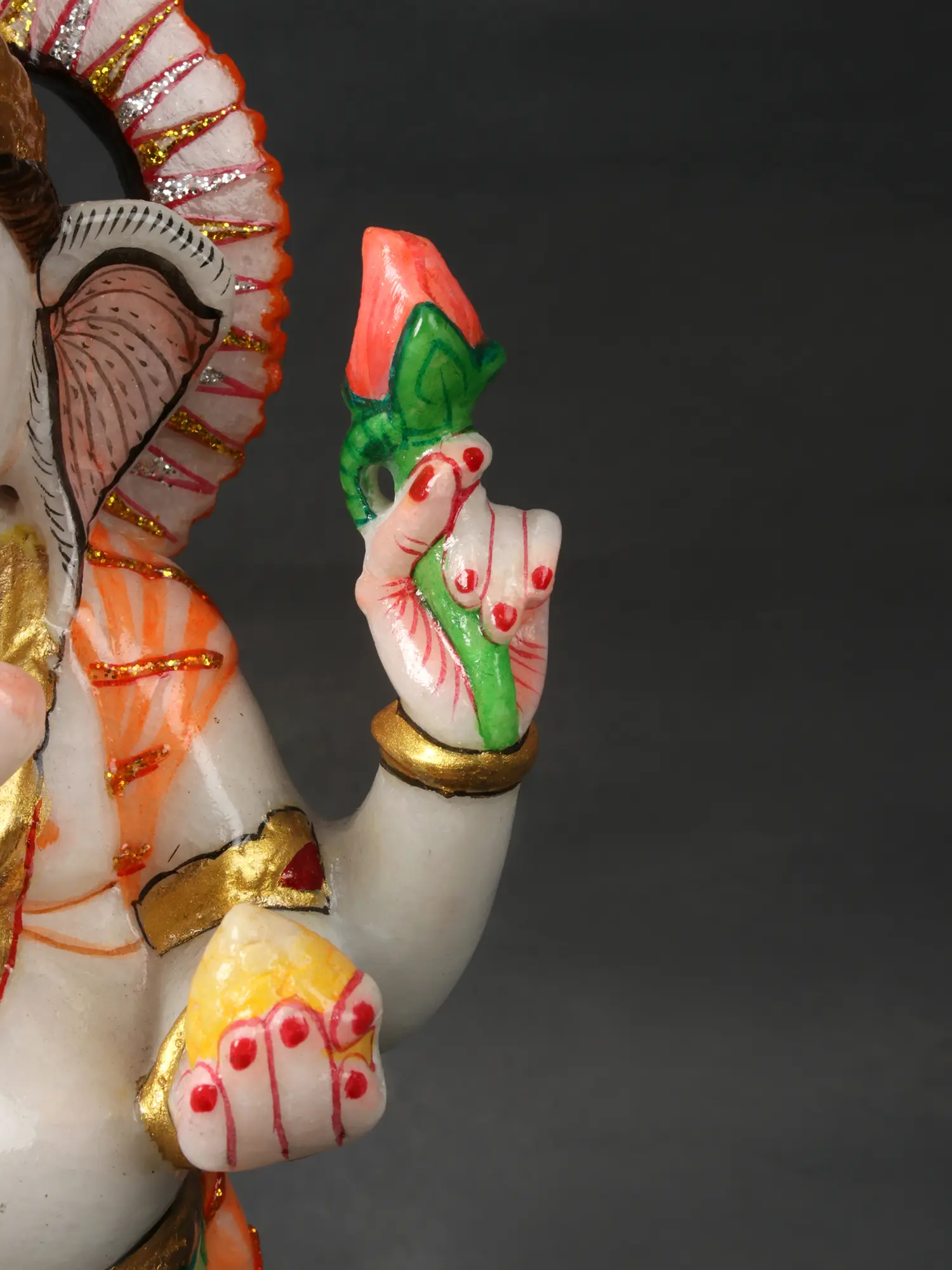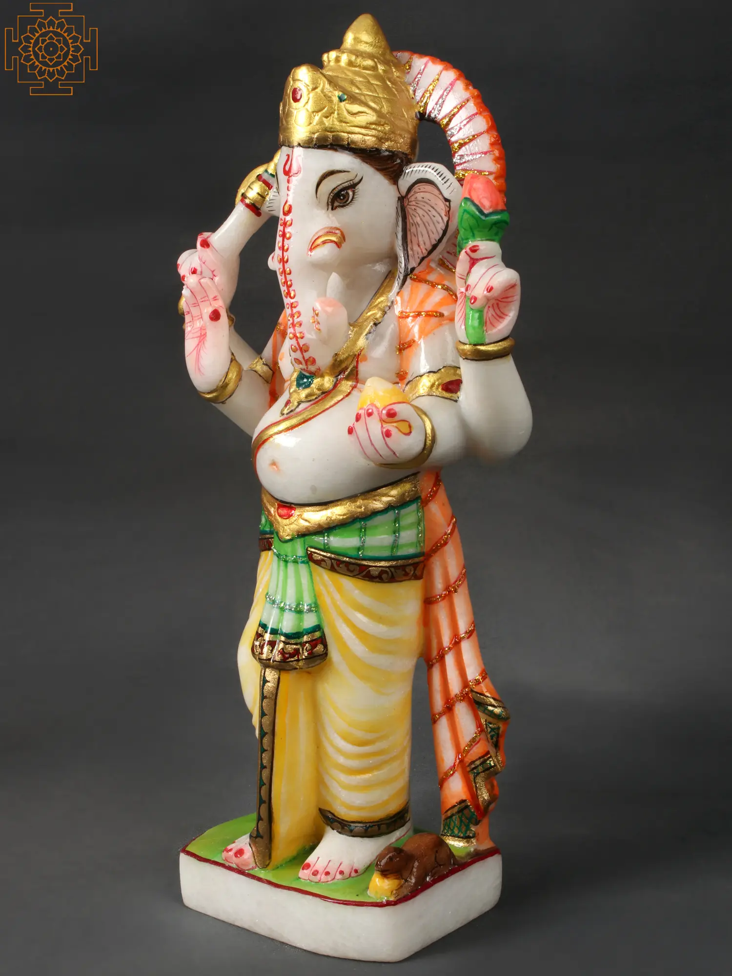 A standing Ganesha is one of the most rarely seen postures of Ganesha sculptures. Here he stands diligently on a thick pedestal having a green grassy platform with the mouse towards his left foot, busy eating modak. This sculpture is chiselled out of a single piece of white translucent marble that allows light to enter and produce a soft glow while retaining its high polish. Have a look at the beautifully decorated long trunk in red and gold along with the complementing tusks and a finite Shaivite tilak on his forehead.
