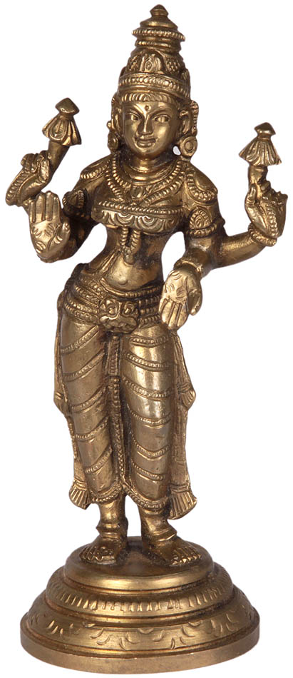 Iconographically, Goddess Lakshmi is described as a fair lady, generally with four arms, seated or standing on a lotus, dressed in fine garments and precious jewels. She has a benign countenance, is in her full youth and yet having a motherly appearance.