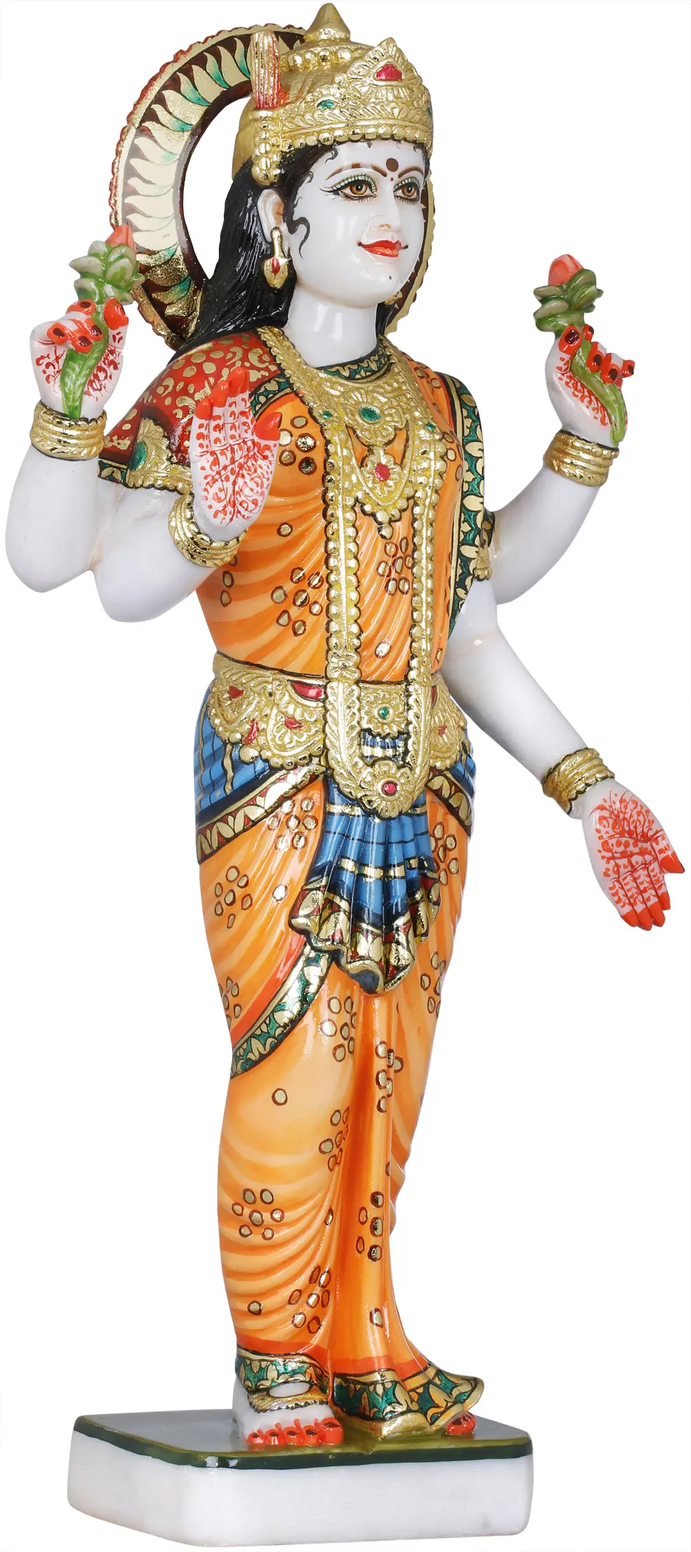 Her iconography is unmistakable. Chaturbhujadhari (four-armed), with the palms of the anterior hands turned outward in blessing. Zoom in on the same to take in the beauty of the vivid vermillion-coloured mehendi tattooed against her milk-white skin. Matching red mehendi is to be found on the precisely sculpted toes of Her delicate feet. In each of Her posterior hands She holds a pink, green-stemmed lotus, picked fresh off the waters.