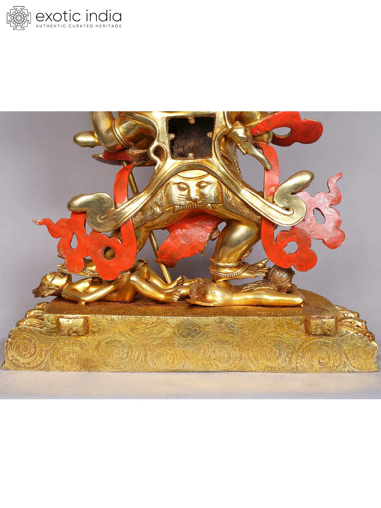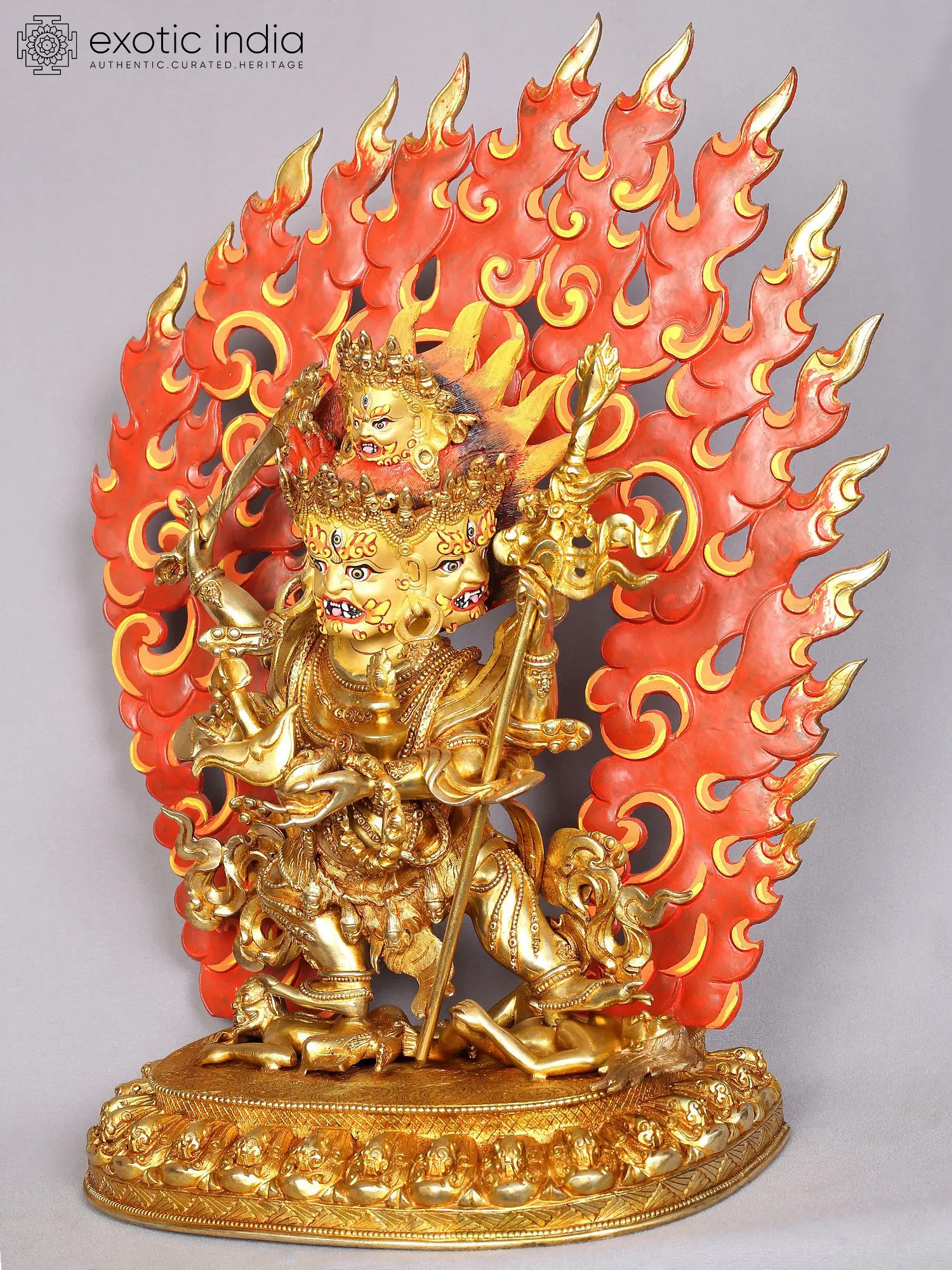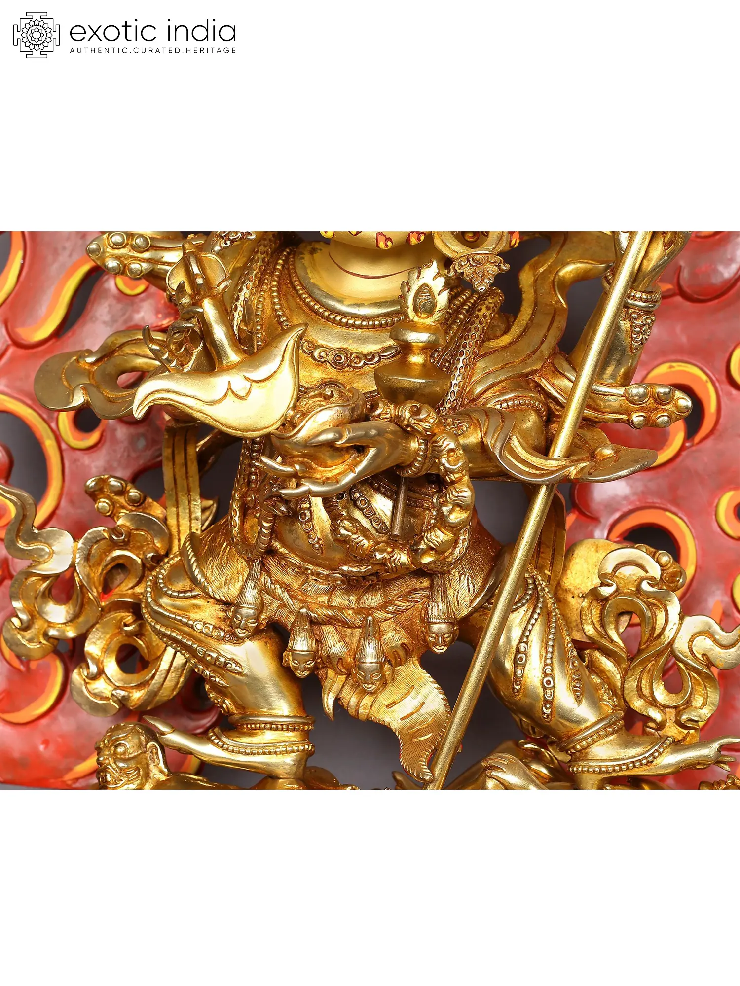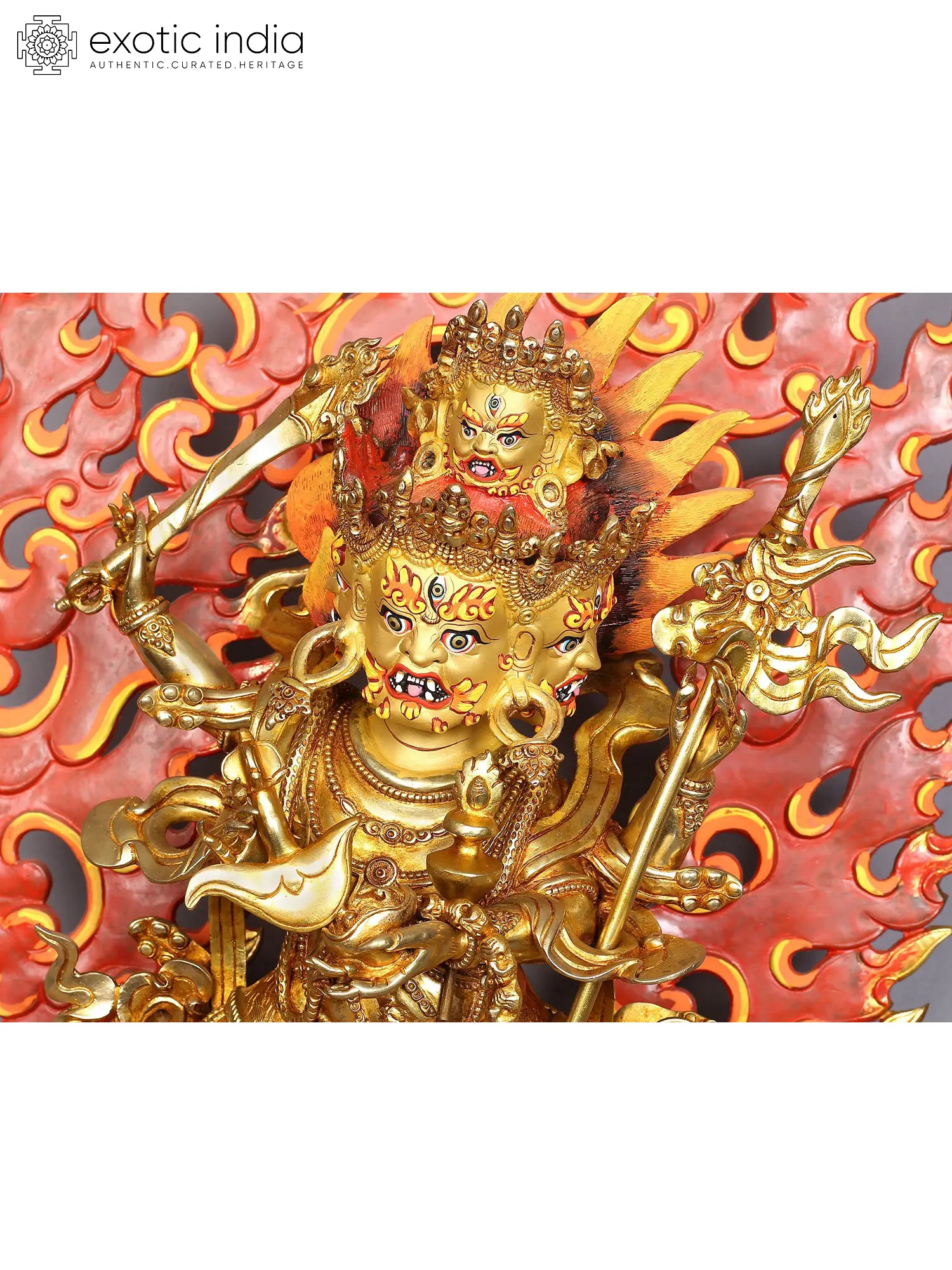 This Chaturmukha (four-headed) and Chaturbhuja (four-armed) Mahakala statue from Nepal is a potent manifestation of the Buddhist deity. The gilded copper icon is heavily ornamented with traditional jewelry and haloed by a stunning flaming aureole. Quelling the enemies of Dhamma with his massive legs, Mahakala in this form annihilates the fear of death (Kala) from the heart of his devotees, clearing their minds and path to attain the supreme wisdom.