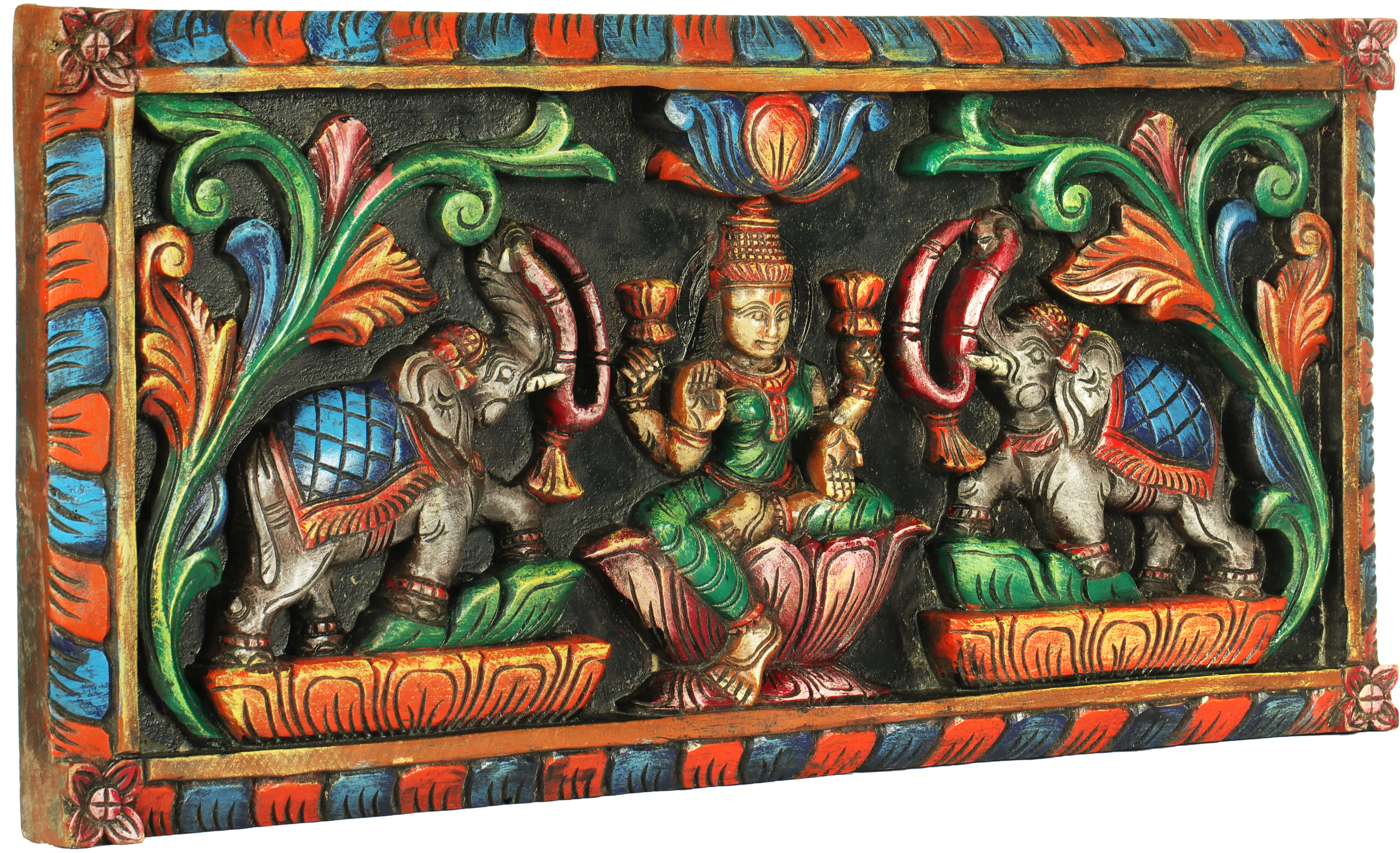 This wall hanging is a profound example of South Indian wood carving, a craft deeply rooted in the region's rich cultural and religious heritage. The intricate carvings are brought to life with a vibrant palette of colors, each hue carrying its own significance. The deep greens of the lotus petals symbolize growth and fertility, while the vibrant reds and oranges of the floral motifs evoke vitality and auspicious beginnings. The blues add a touch of divinity and vastness, complementing the overall rich composition. The contrast between the richly colored foreground and the textured black background further enhances the depth and dimensionality of the carving, making the divine figures and motifs truly stand out. The detailed floral patterns that adorn the border speak of nature's abundance and the cyclical nature of life and prosperity, echoing the presence of Lakshmi. The textured finish of the wood, combined with the skilled application of paint, gives this piece a tactile quality, inviting a closer appreciation of the artisan's skill. This Gajalakshmi wall hanging is not merely an artistic creation but a spiritual artifact, designed to invite blessings and cultivate an atmosphere of peace, prosperity, and divine grace within your home. It serves as a constant reminder of the Goddess's benevolent presence and the enduring power of devotion.