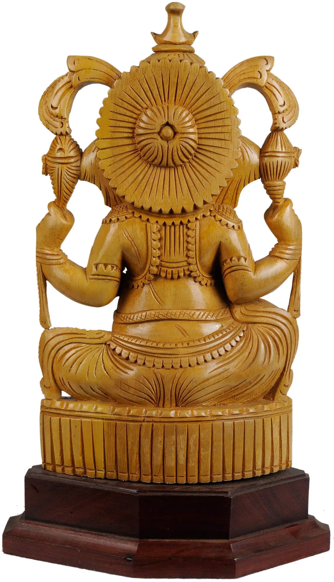 Behold a meticulously crafted representation of one of the most beloved deities in the Hindu pantheon. Every curve and contour of this handcrafted piece is a testament to the skill of artisans who draw inspiration from centuries of tradition. This wooden idol captures the essence of divinity, a tangible embodiment of wisdom, prosperity, and good fortune. His iconic elephant head, large ears, and endearing trunk are instantly recognizable. His eyes reflect intelligence and benevolence. The gentle curve of his mouth hints at a cosmic smile, promising blessings to all who seek his guidance. The intricate details adorning his form, from the elaborately carved crown to the delicate jewelry, speak to the reverence with which he is regarded. He is depicted in a seated posture, radiating serenity and accessibility. One hand extends in the Abhaya Mudra, a gesture of reassurance and protection, while the others hold significant symbols of his power and grace.