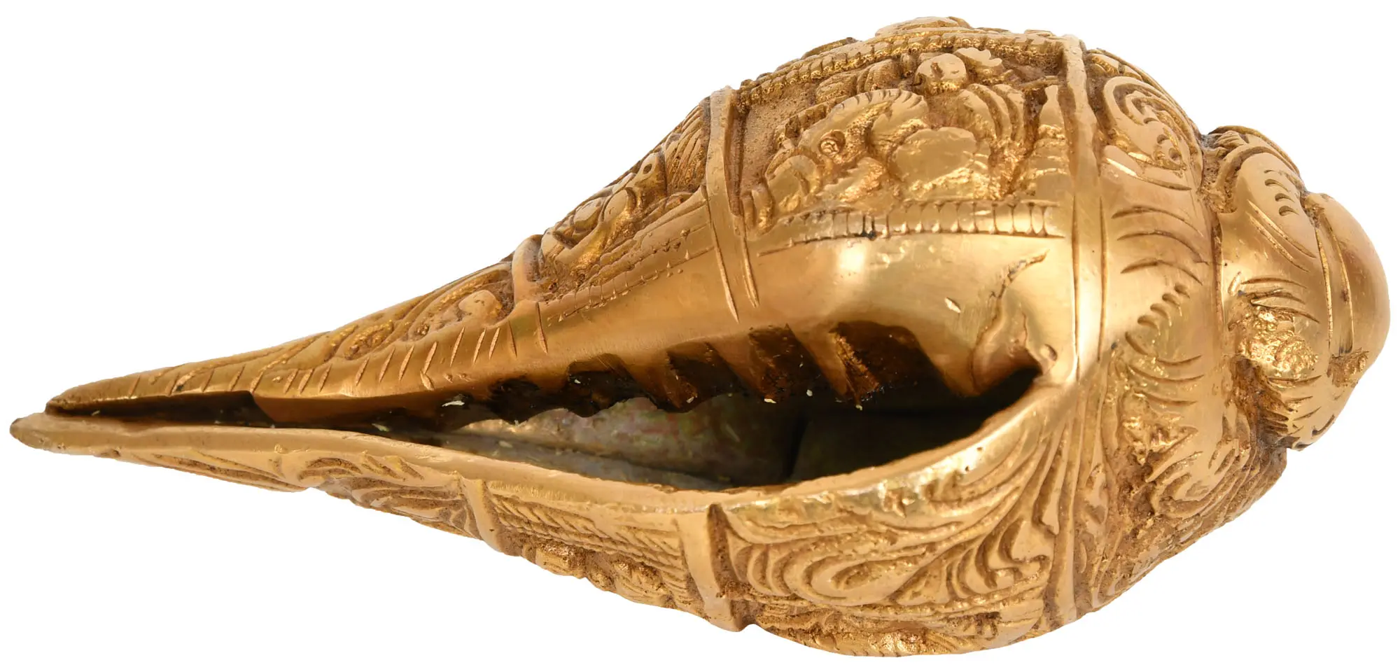 Meticulously crafted from high-quality brass, this conch shell showcases exceptional artistry. The warm, golden hue of the brass lends an aura of divinity and permanence to the piece. Every curve and contour of the conch is accentuated by the detailed relief work, revealing the skill of the artisans who brought this divine vision to life. The raised carvings are sharp and distinct, highlighting the textures and forms of the deities and decorative motifs. This piece is not merely an object but a miniature narrative, a fusion of the natural world's bounty and the divine realm's blessings, brought together through masterful craftsmanship.