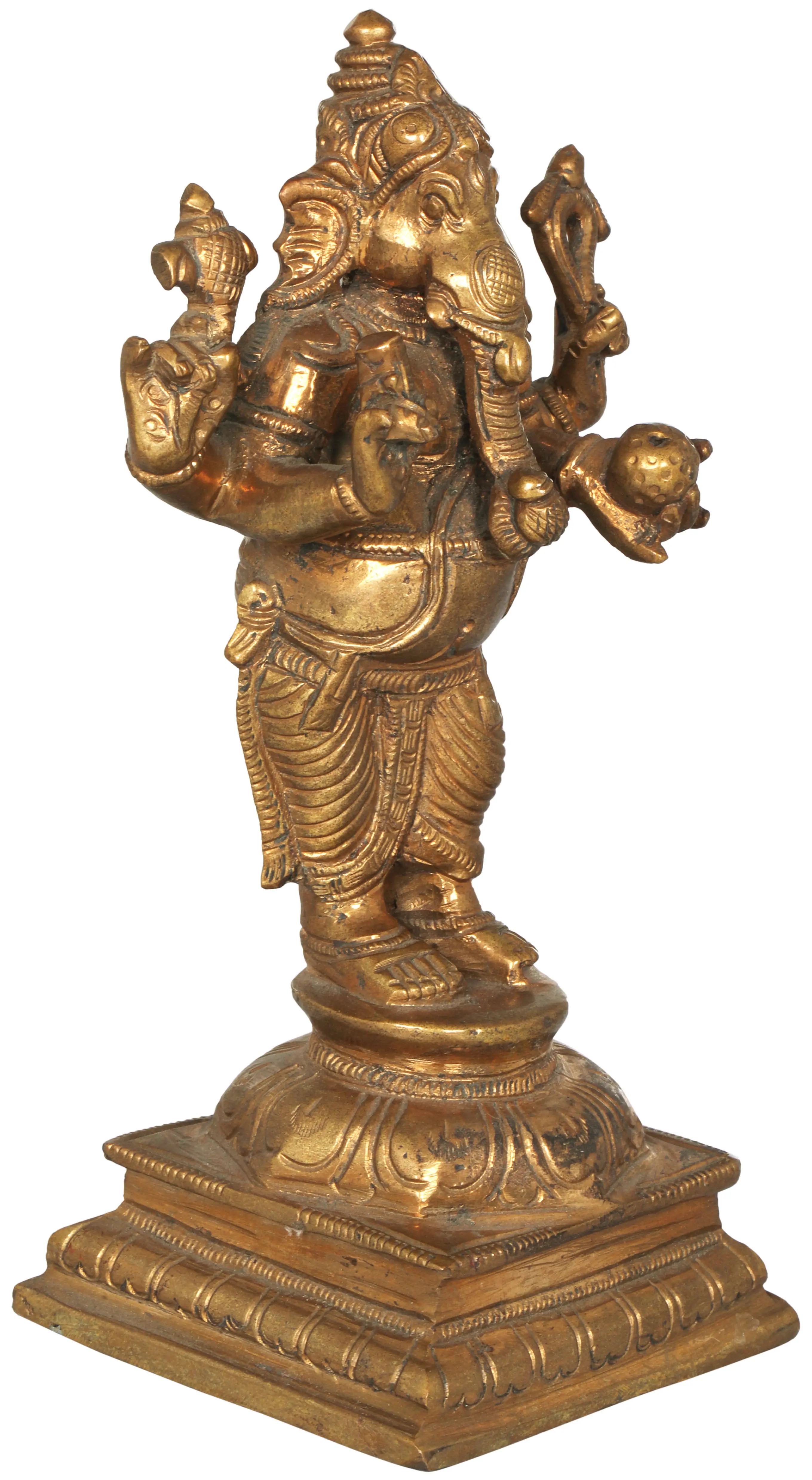 This exquisite bronze statue depicts Lord Ganesha, the beloved elephant-headed deity revered as the remover of obstacles, the patron of arts and sciences, and the deva of intellect and wisdom. Crafted with meticulous detail in Swamimalai, a renowned center for traditional South Indian bronze casting, this piece embodies centuries of artistic heritage. The patina of the bronze, a testament to its age and the skillful hands that shaped it, lends a deep sense of reverence and timeless beauty to the sculpture. The iconography of Ganesha is rich with meaning. His elephantine head symbolizes wisdom and strength, while his single tusk represents the renunciation of worldly desires. His large ears signify an attentive listener, and his broad belly suggests a calm and contented disposition. In this particular depiction, Ganesha holds a *kumbha*, a traditional vessel, in his trunk. The *kumbha* is an auspicious symbol in Hinduism, often representing abundance, fertility, and the womb of creation. Its presence here signifies Ganesha's role as a bestower of blessings and prosperity upon his devotees.