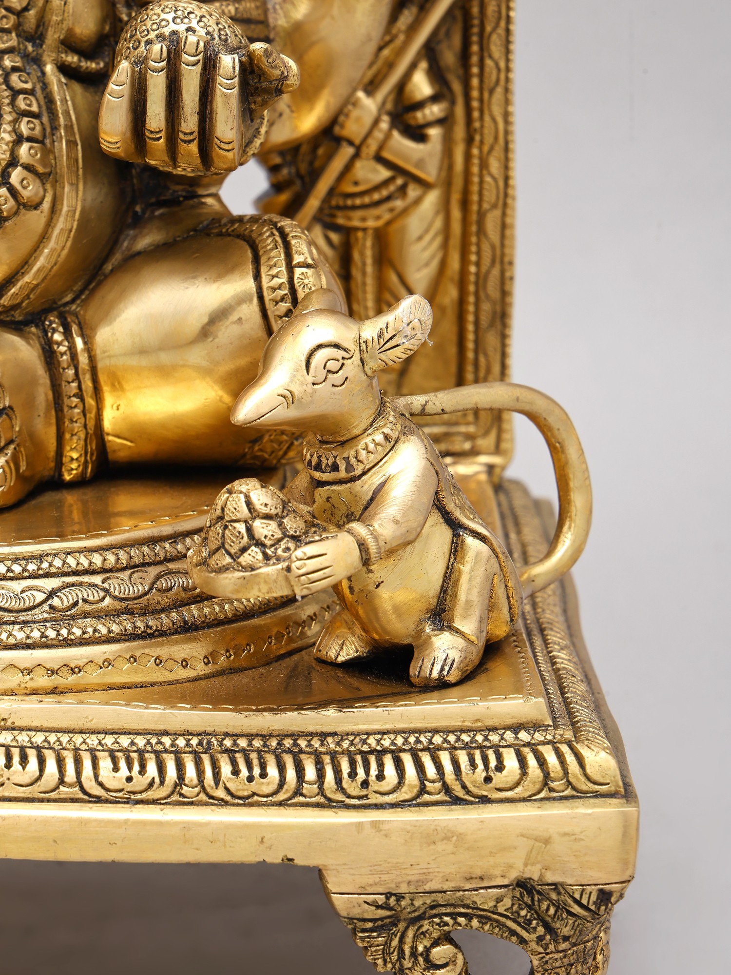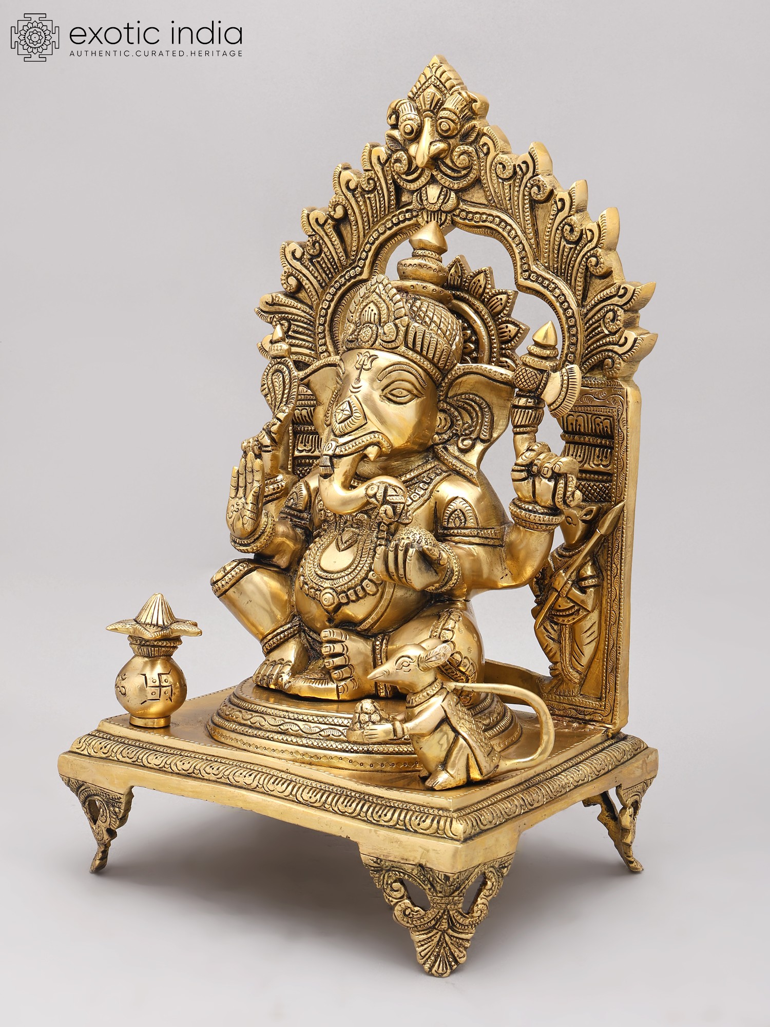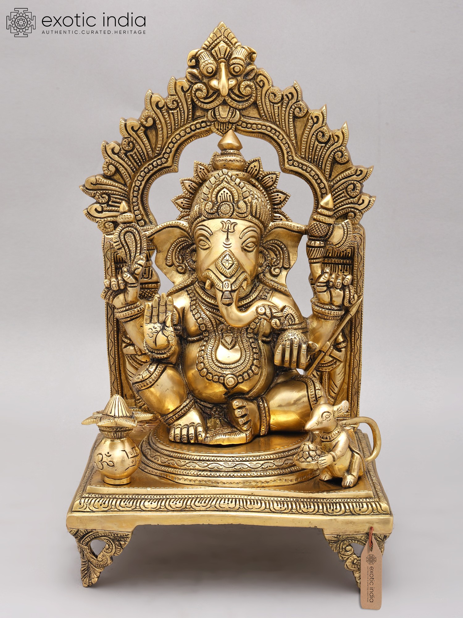 This magnificent handcrafted brass statue of Ganesha, the beloved Hindu deity, captures the essence of his benevolent nature. Seated in the *Ashirwad Mudra* (blessing gesture), Ganesha exudes an aura of serenity and wisdom, making this a powerful addition to any home or sacred space. The intricate detailing and imposing size (17.5 inches high!) command attention, drawing the eye to the richness of the craftsmanship and the spiritual symbolism embedded within. His gentle gaze and raised hand offer a silent blessing, promising prosperity and good fortune to all who behold him. The accompanying pot-bellied mouse, *Mushika*, his devoted mount, sits patiently at his side, a reminder of the importance of humility and acceptance even in the face of greatness.