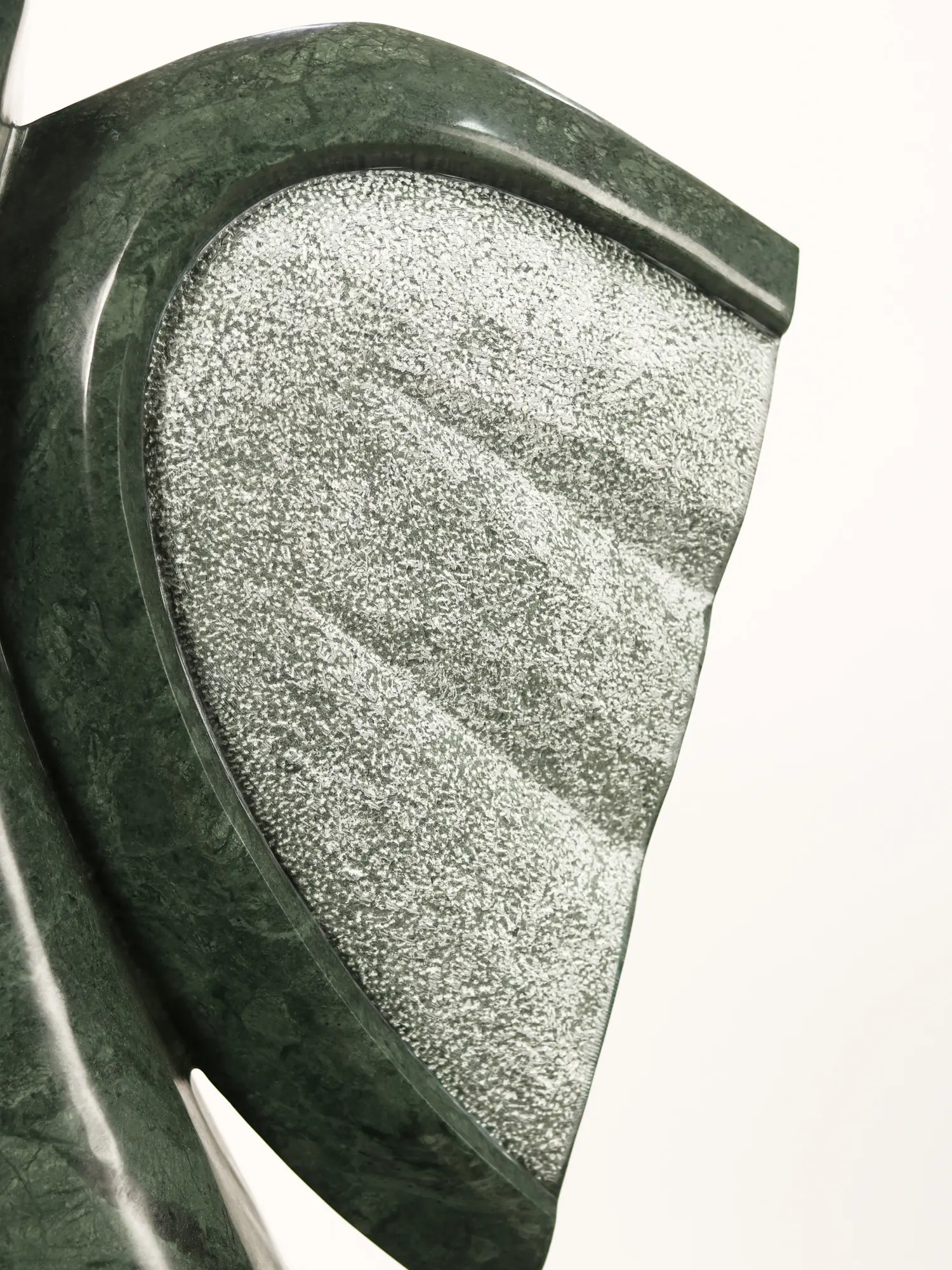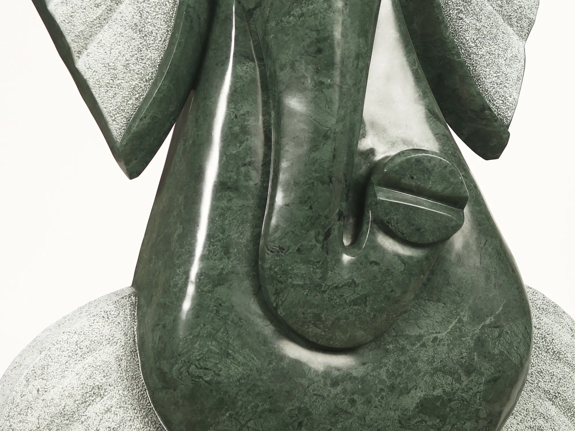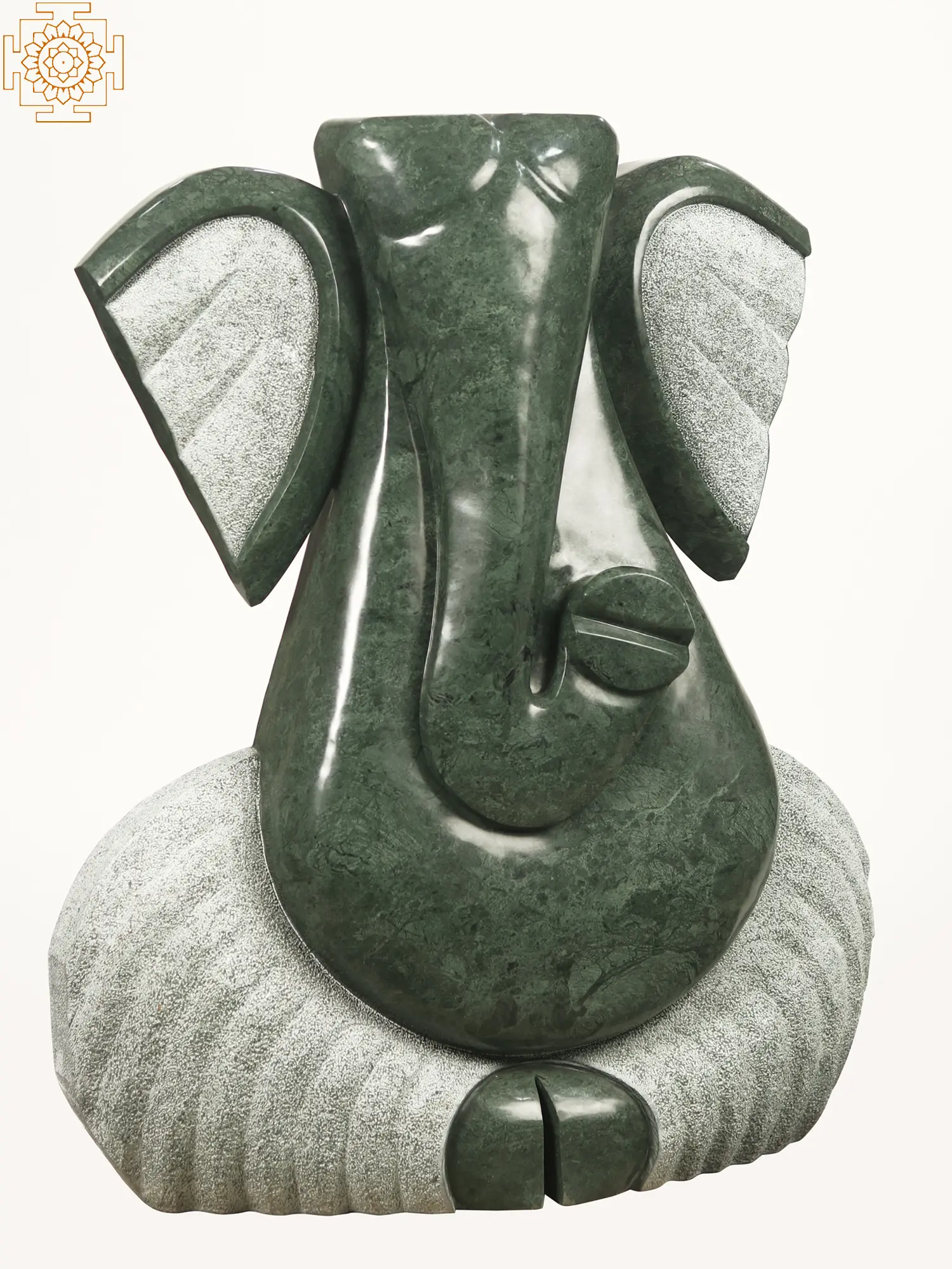 Carved from rich green natural stone and grounded in a bed of textured grey, this abstract Ganesha sculpture is a stunning union of serenity and sculpture. The deity's iconic features, broad ears, rounded trunk, and divine repose, are reimagined through minimalist lines and smooth curves, creating a presence that is both powerful and peaceful.