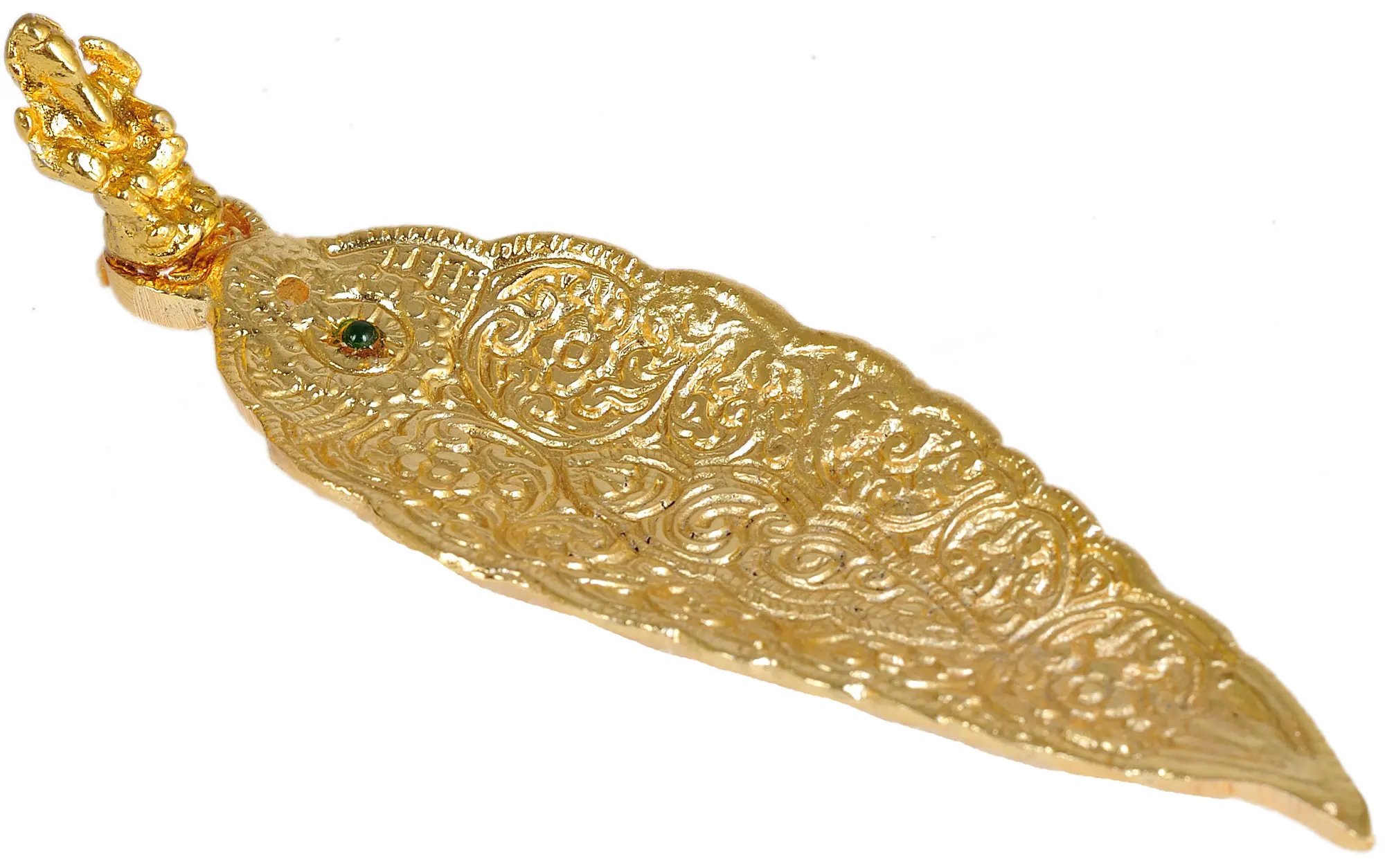 At the pinnacle of the Pipal leaf, a finely detailed representation of Lord Ganesha, the remover of obstacles and the patron of arts and sciences, graces this stand. Ganesha, with his elephantine form and serene countenance, is invoked at the commencement of any new venture to ensure success and remove impediments. His presence on this agarbatti stand serves as a constant reminder of his blessings, inviting him to bless your prayers and meditations. The rich, golden hue of the brass symbolizes wealth and purity, amplifying the auspicious aura of this sacred object.