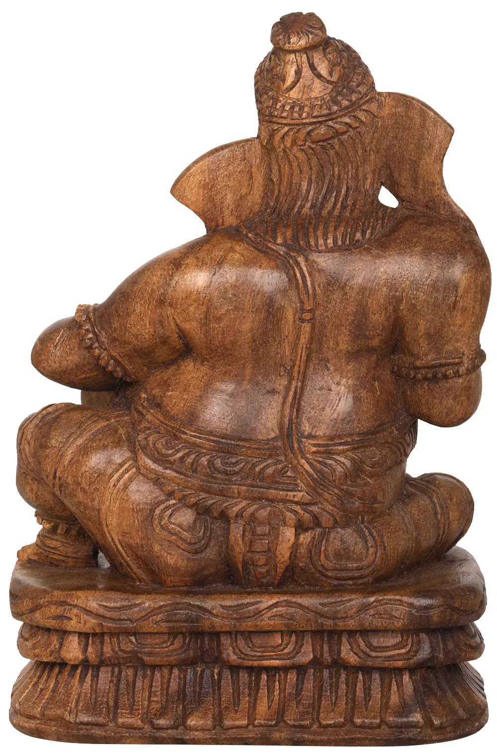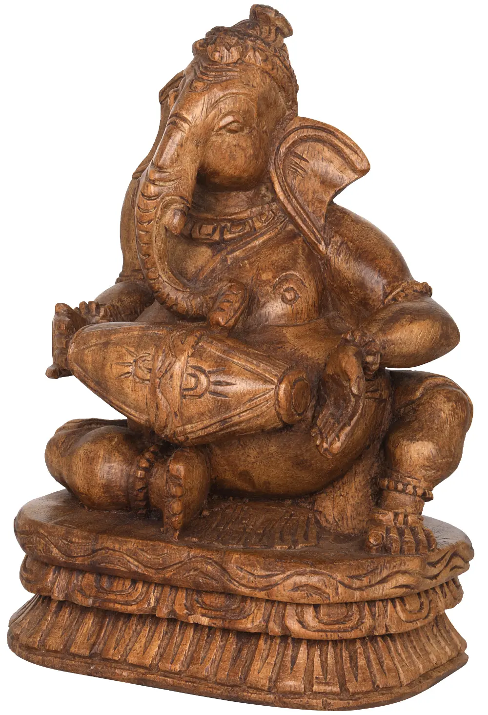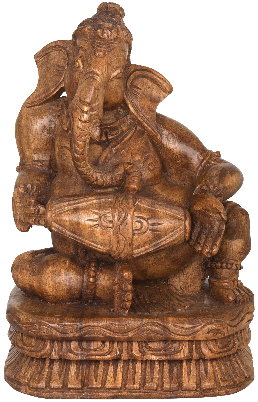 Immerse your space in the divine rhythm of devotion with this exquisite wood carving, depicting Lord Ganesha, the remover of obstacles and the bestower of wisdom, in a joyous mood as he plays the Dholak. This piece is a testament to the rich artistic heritage of South India, specifically drawing from the tradition of temple wood carving, where intricate craftsmanship meets profound spiritual significance. Each curve and contour of this carving speaks of skilled hands that have meticulously brought forth the form of the beloved elephant-headed deity from a single block of wood. The posture of Ganesha, seated in a relaxed yet engaged manner, with his trunk elegantly curved and his eyes conveying a sense of playful concentration, is captivating. The Dholak, a barrel-shaped hand drum, is held with evident skill, suggesting a melody that resonates with joy and auspicious beginnings. In Hindu mythology, music and dance are often associated with divine celebrations and expressions of divine presence. Ganesha, as the patron of arts and sciences, and the god invoked before any new venture, is here depicted as the conductor of a celebratory symphony, setting a tone of prosperity and good fortune.