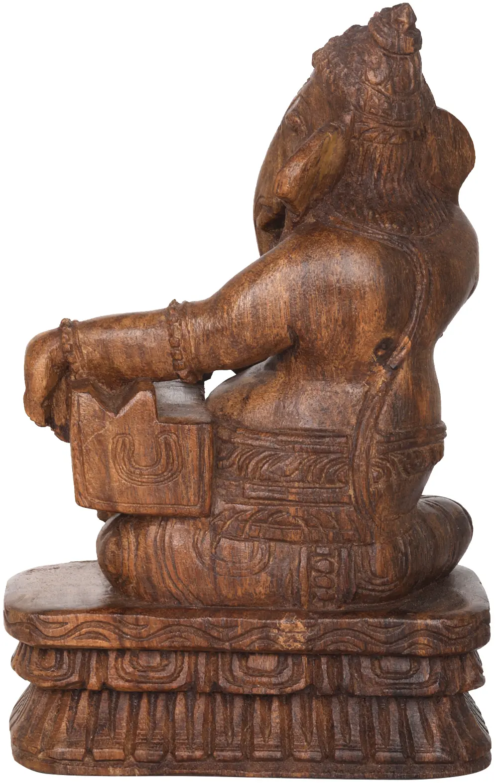 Invite the divine into your home with this exquisite wooden carving of Lord Ganesha, the beloved elephant-headed deity, immersed in the soulful act of playing the harmonium. This piece captures a rare and intimate portrayal of Ganesha, traditionally known for his wisdom, prosperity, and role as the remover of obstacles. Here, he is depicted in a moment of serene musical devotion, a testament to the divine's multifaceted nature and the joy that can be found in creative expression. The carving embodies the spirit of South Indian temple artistry, a tradition steeped in centuries of spiritual practice and craftsmanship. Each detail, from the gentle curve of Ganesha's trunk to the intricate patterns adorning his garments and the finely rendered keys of the harmonium, speaks of the artisan's dedication and skill. The rich, natural grain of the wood lends a timeless warmth and an organic beauty to the sculpture, making it a striking focal point in any room. The harmonium, a bellows-blown instrument producing a rich, sustained tone, becomes a symbol of harmony and resonance. In Hindu mythology, music, dance, and art are often seen as paths to spiritual enlightenment. By depicting Ganesha with this instrument, the carving suggests that even the most powerful deities appreciate and engage with the arts, finding solace and joy in their practice. It reminds us that divine blessings can be invoked through creative endeavors and the appreciation of beauty. ––––––––––––––––––––
