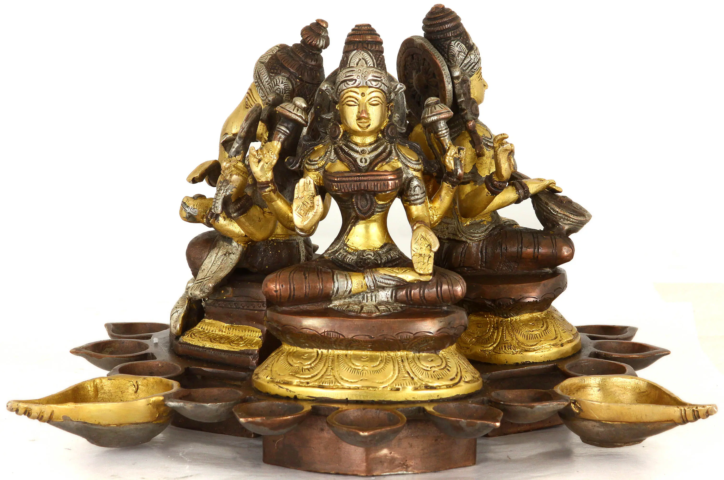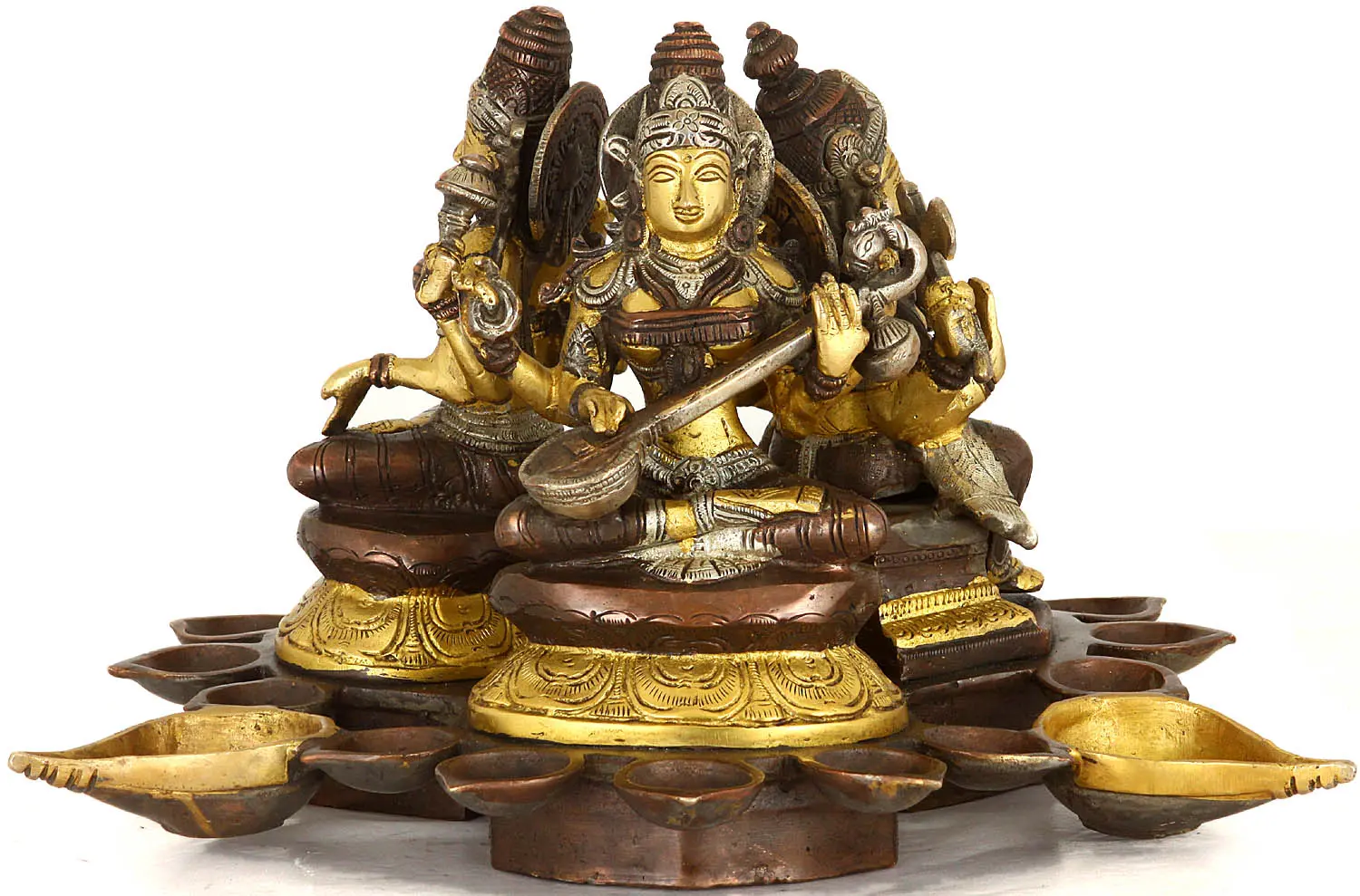 This carefully crafted brass sculpture brings together three of the most revered deities in the Hindu pantheon: Ganesha, the remover of obstacles; Saraswati, the goddess of knowledge, music, arts, wisdom, and learning; and Lakshmi, the goddess of wealth, prosperity, love, and fortune. Together, they represent a powerful confluence of blessings, encompassing success, wisdom, and abundance. The depiction showcases Ganesha centrally positioned, flanked by Saraswati and Lakshmi, all seated regally upon intricately detailed pedestals. This arrangement signifies the interconnectedness of these divine forces; true prosperity cannot be achieved without wisdom, and both are fostered by the removal of obstacles.
