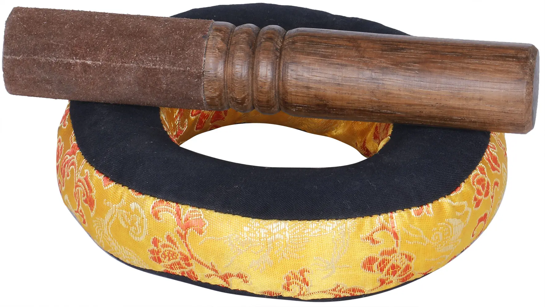 This singing bowl is a testament to the skilled craftsmanship of artisans who have preserved traditional techniques for generations. The aluminum construction ensures its longevity, while the thoughtfully applied black detailing of the Om symbols and decorative borders showcases a meticulous attention to detail. The bowl rests upon a beautifully embroidered cushion, a vibrant tapestry of golden yellow adorned with floral motifs, which not only provides a stable and elegant base but also adds a touch of opulence to the overall presentation. The accompanying wooden striker is perfectly sized for producing the bowl's signature clear and sustained tones. This ensemble creates a harmonious presentation, ready to be the centerpiece of your meditation space, yoga studio, or personal sanctuary.