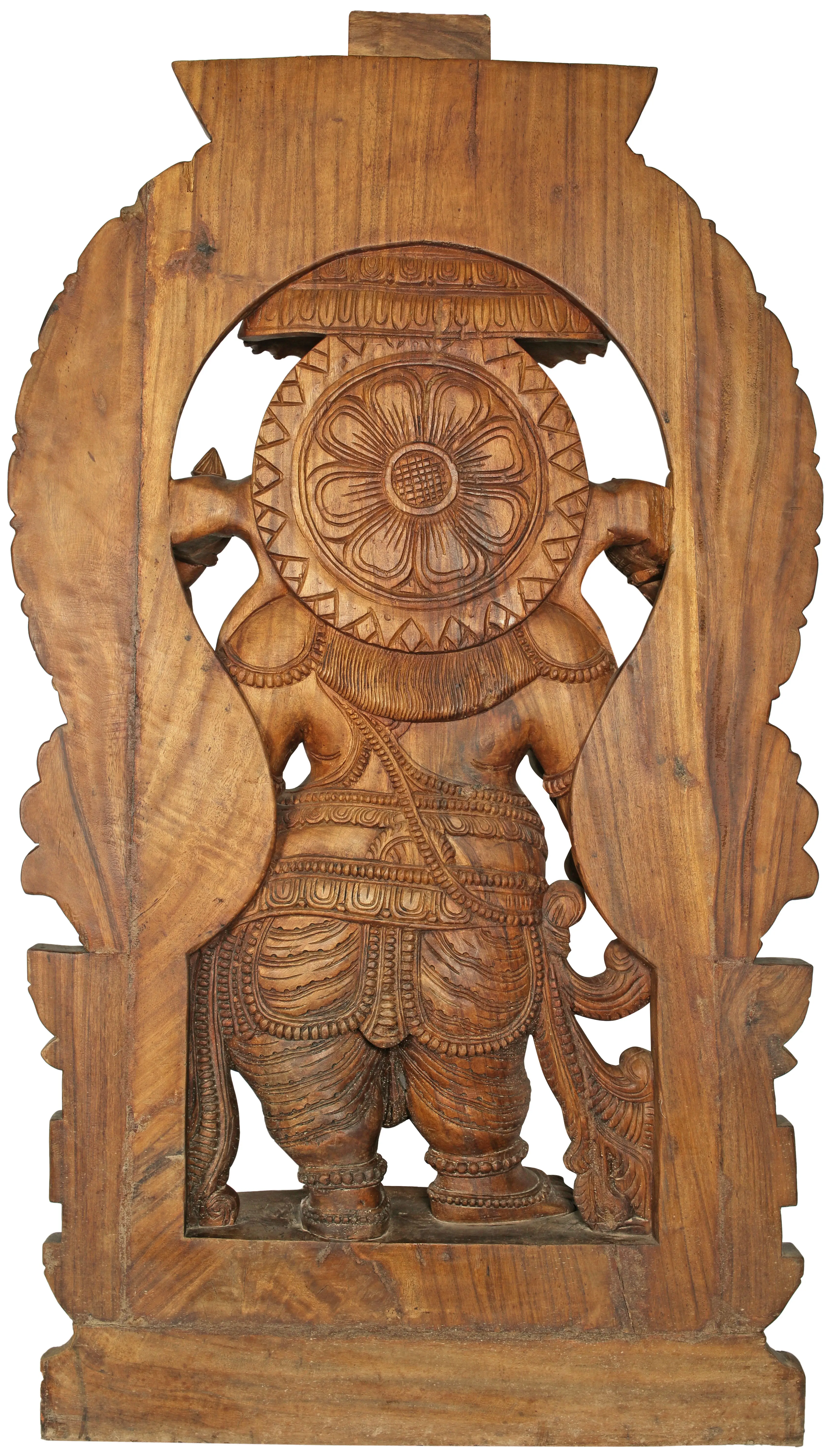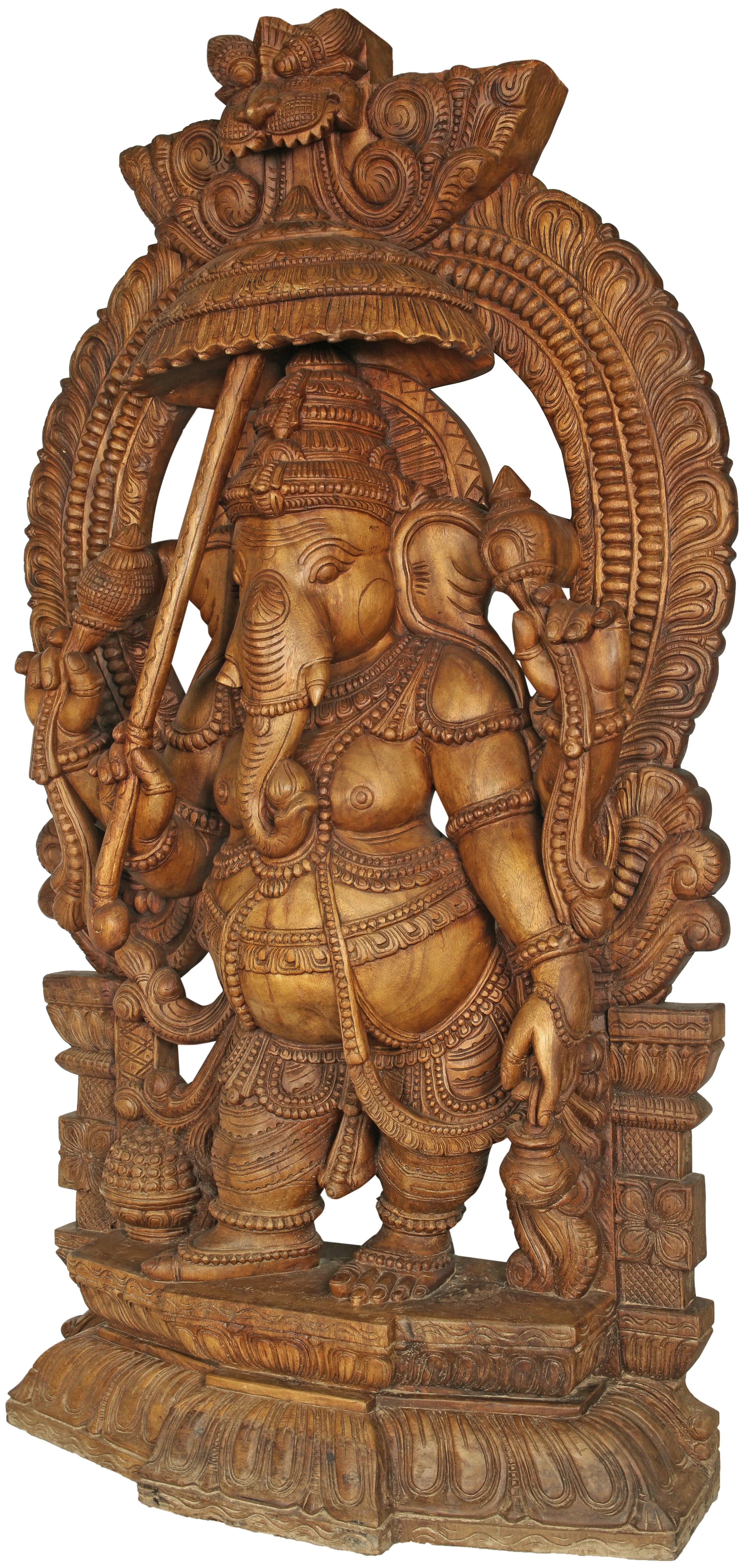 Indeed, no other deity of the Hindu pantheon could have made a better scribe for the greatest epic known to humankind. While His appearance is not on par with the characteristic handsomeness of Indian deities, it is His adorably boyish form that devotees love. His pot belly gives away His undying love of laddoos (He is holding one at the tip of His trunk). His chubby limbs are every ready to break into dance or to be raised in blessing. The innocent elephant-head stands for all the gentleness and wisdom associated with the mortal animal. This one-of-a-kind wood-cut sculpture of the Lord depicts Him in the midst of a walk along divine pathways, with a kamandalu in one anterior hand and an ornate parasol in the other. Lotuses about to bloom are in His posterior hands. His befitting silks and shringar are matched by the glamour of the Kirtimukha aureole that frames the composition and the grandeur of the pedestal on which the same is placed.