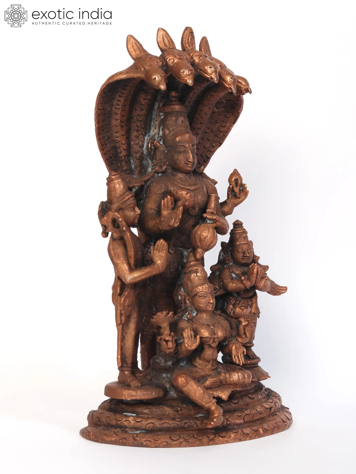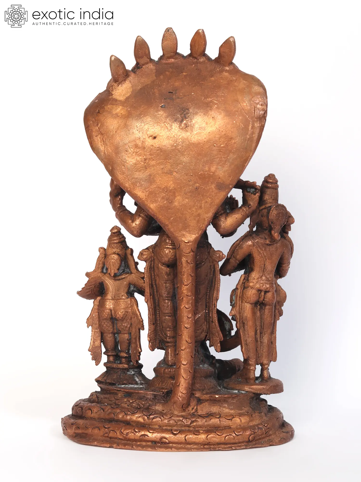 This breathtaking sculpture, carved in copper, captures the celestial moment where Lord Vishnu, adorned with majestic serenity, stands beneath the protective hoods of Sheshnaag, embodying cosmic balance. Seated in Lalitasana on the graceful coils of Sheshnaag, Goddess Lakshmi radiates eternal beauty and benevolence. Garuda and Narada, revered devotees, bow in humble obeisance. This magnificent ensemble conveys a powerful message of dedication, unity, and cosmic harmony.