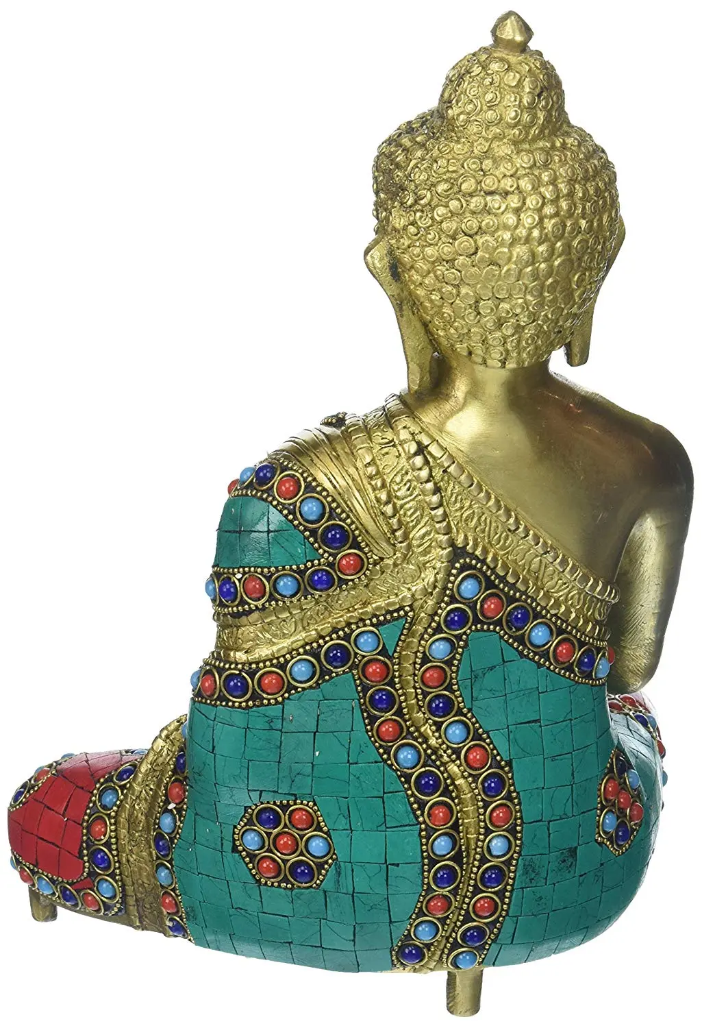 Crafted from high-quality brass, this statue possesses a timeless allure. The rich golden hue of the metal speaks of divinity and permanence. The intricate detailing extends to the Buddha's serene countenance, the perfectly rendered ushnisha (the cranial protuberance signifying his wisdom), and the delicate folds of his monastic robe. The robe itself is adorned with vibrant, inlaid stones of turquoise blue and coral red, interspersed with smaller blue accents and framed by ornate golden patterns. These embellishments not only add visual splendor but also symbolize the richness and diversity of the spiritual path. The red stones evoke grounding and passion, while the blues represent wisdom and peace, creating a harmonious balance within the artwork.