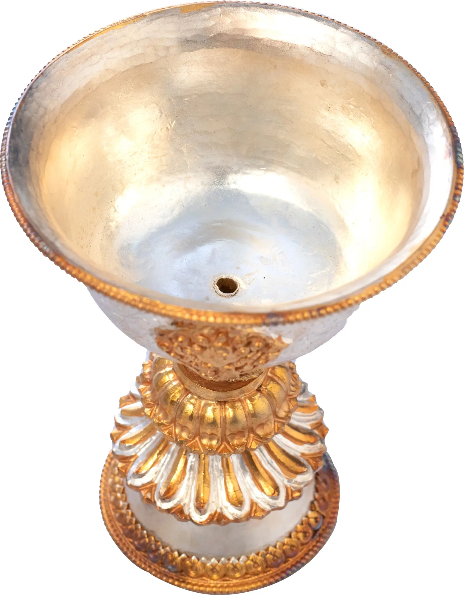 The body of the bowl is adorned with delicate, engraved floral motifs, suggesting the abundance and beauty of nature, and further enhancing its sacred aura. These patterns are not merely decorative; they are imbued with symbolic meaning, representing growth, prosperity, and the interconnectedness of all life. The prominent central elements, sculpted and gilded with pure 24-karat gold, are reminiscent of mandalas or auspicious symbols found in devotional art. These intricate designs are believed to represent the universe in its divine order and the pathways to spiritual realization. The entire piece is meticulously crafted from copper, a metal revered for its purity and its ability to conduct spiritual energies. The application of 24-karat gold gilding elevates this object to a realm of divine artistry. Gold, in many cultures, is associated with the sun, with divinity, and with immortality. Its radiant sheen amplifies the sanctity of the lamp, making it a truly auspicious object for any altar, meditation space, or sacred corner of your home. The tradition of offering ghee lamps extends back centuries, found in Hindu rituals where the lamp is central to *puja* (worship), and in Buddhist practices where it symbolizes the light of wisdom. It is believed that the act of lighting a ghee lamp generates positive energy and purifies the environment. This particular lamp, with its blend of traditional symbolism and masterful craftsmanship, is more than just an object; it is an invitation to connect with the divine, to cultivate inner peace, and to bring a radiant glow into your life.