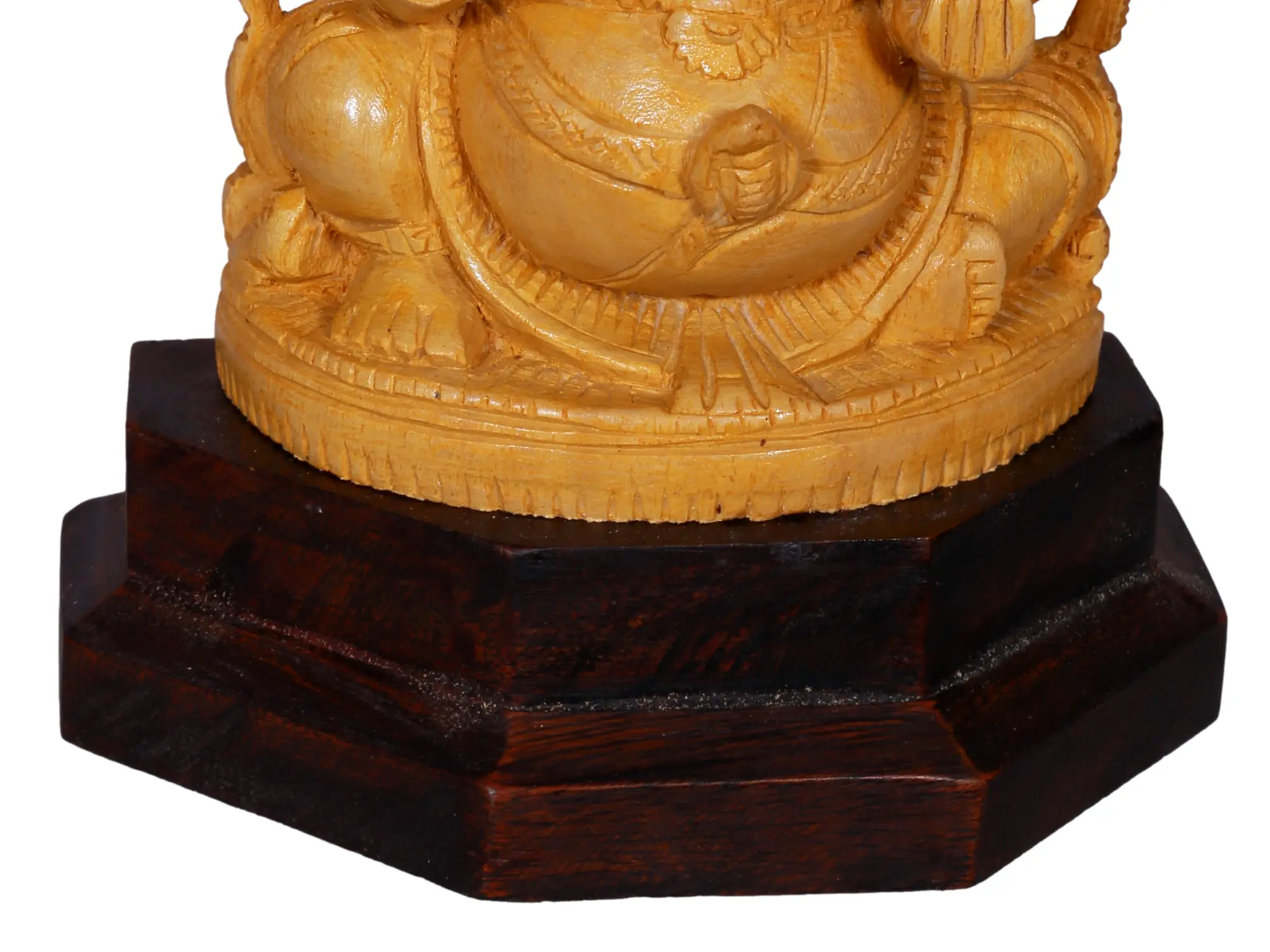 In this statue, Bhagwan Ganesha sits majestically in “Utkutaskasana”, his divine form a captivating embodiment of grace and power. In his upper hands, he carries a goad and a noose symbolizing his ability to guide and control life’s twists and turns, while his front right hand, adorned with the reassuring “Abhaya Mudra”, offers solace and protection. The elephant-headed deity relishes a Modak, the sweet nectar of life, his eyes gleaming with wisdom. A serpent lovingly winds around his generous belly, a symbol of kundalini energy and life’s cycles. His regal crown bestows him as the divine ruler of obstacles, embodying resilience, wisdom, and boundless compassion. A tribute to Ganesha’s enduring significance in overcoming life's challenges, this wooden masterpiece grants us the courage to face the unknown.