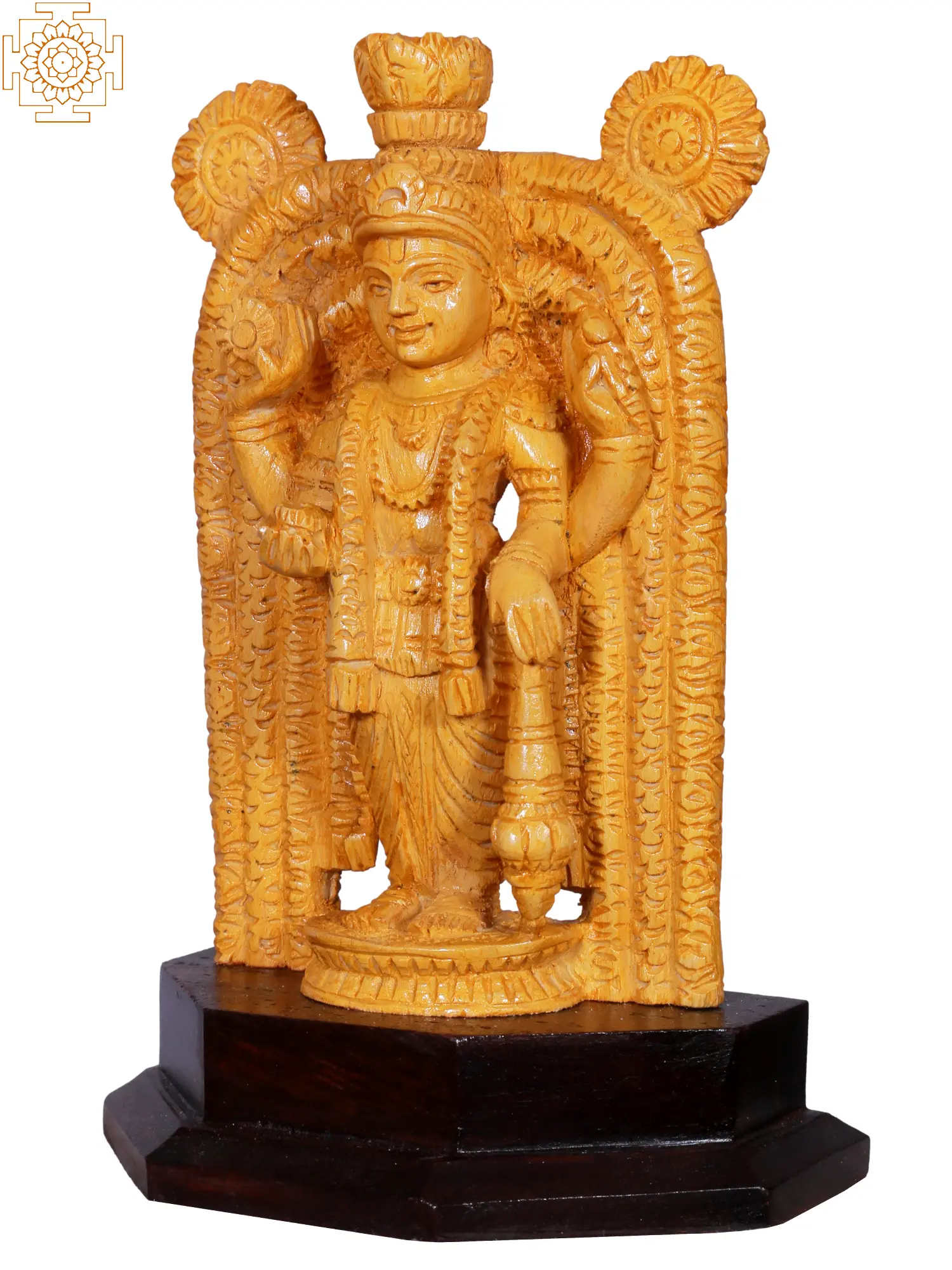 Invite the divine grace of Guruvayurappan into your home with this exquisite wooden statue. Crafted with meticulous detail, this representation captures the serene and benevolent form of Lord Vishnu, specifically as He is worshipped in the famous Guruvayoor Temple in Kerala, India. The warm, natural hue of the wood enhances the spiritual aura of the deity, making it a perfect centerpiece for your altar, puja room, or any space where you seek peace and blessings. The craftsmanship of this statue speaks volumes about the artisan's dedication and skill. Each element, from the gentle smile on Guruvayurappan's face to the intricate folds of his dhoti and the divine ornaments adorning him, is rendered with an artistic touch. The accompanying arch behind the deity is a beautiful testament to traditional craftsmanship, with its textured surface and symbolic motifs that often represent celestial radiance or divine protection. This arch creates a sense of sacred space around the deity, amplifying the spiritual energy it emanates. ––––––––––––––––––