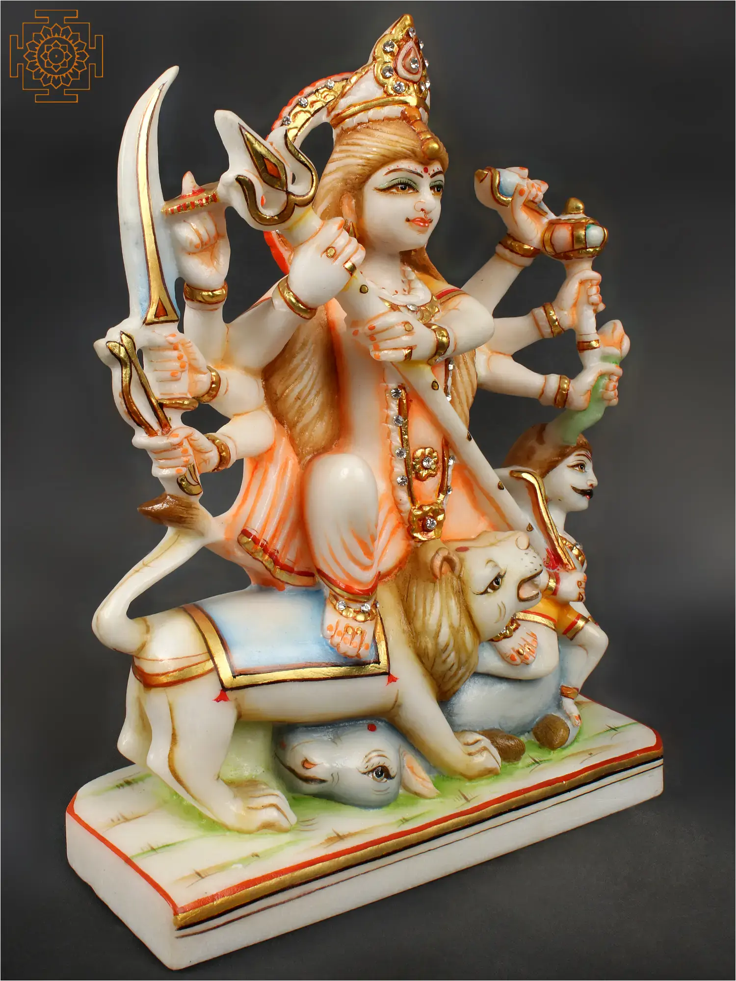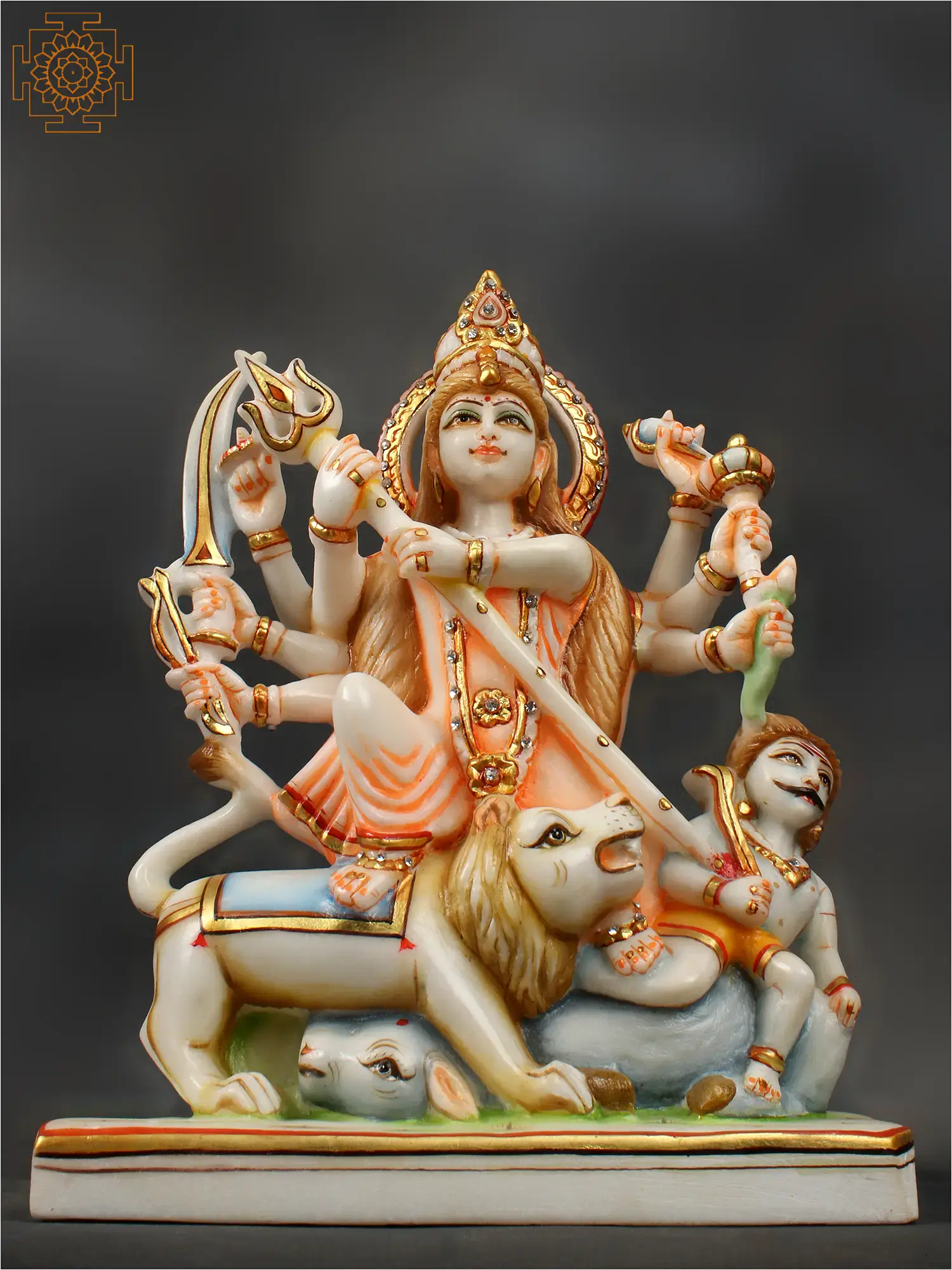 Mahishasura Mardini was an epithet given to Goddess Durga, when she killed the Buffalo demon Mahishasura. This demon waged a war against devas and as the asuras and devas were in conflict, Mahishasura gained a boon that no man could kill him which caused the defeat of devas. Therefore for the victory of good over evil, all devas combined their powers to create Goddess Durga (killer of Mahishasurmardini). This white marble statue aptly depicts the same with the Devi in action of killing the demon. The sculptor has beautifully carved the statue depicting each and every action, features and expressions in a précised and smooth carve.