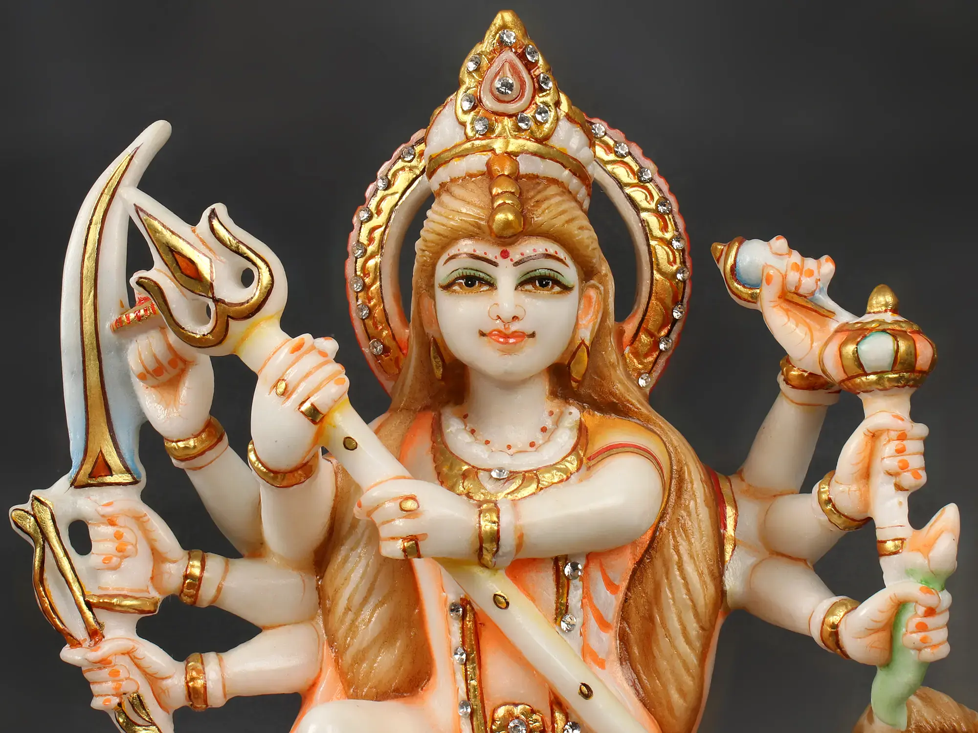 Goddess has her one leg supported by her vahana, Lion and the other placed on Mahishasura’s lap, with the anterior hands holding the killing weapon, Trishul that hits the demon in his chest explained here with the red blood stains. Durga in her eight handed form represents the eight directions and holding all the iconic weapons symbolizes her presence in every direction to safeguard the worshippers. She is garbed in bright peach shade silk and gold treasures embellishing her body complement with the stylized gold haloed crown that glorifies on her long golden-brown hair.