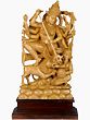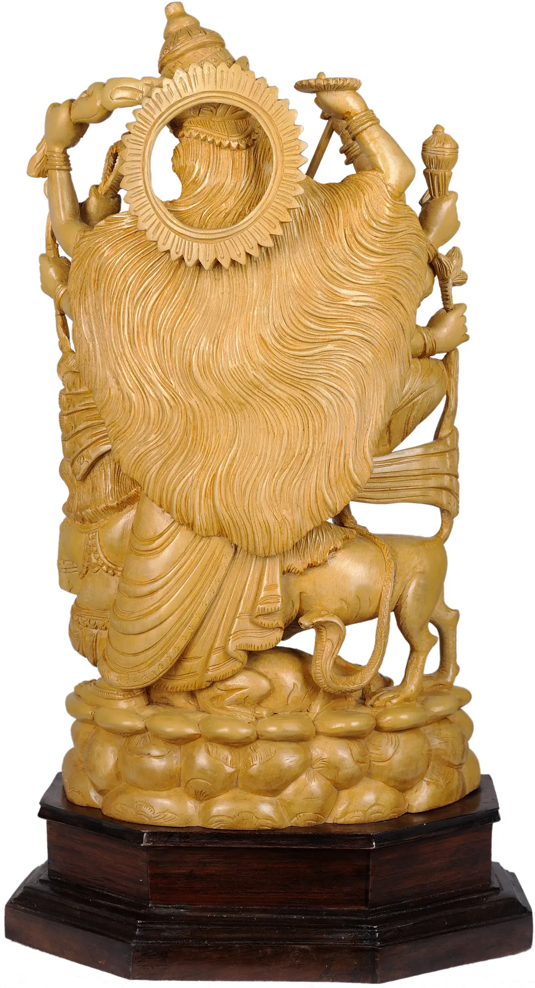 This exquisitely carved statue, rendered in the warm tones of white cedar wood, is a testament to the skill and artistry of craftsmen from Trivandrum. The intricate details, from the goddess's flowing garments to the dynamic pose as she confronts the demon, showcase the mastery of traditional wood carving techniques. Each curve and contour is carefully sculpted, bringing the mythological scene to life with remarkable realism and depth. The choice of white cedar wood lends a natural elegance to the sculpture, its subtle grain adding texture and visual interest. The statue showcases Durga with multiple arms, each wielding a different weapon – a symbol of her multifaceted power and ability to combat evil in all its forms. She is depicted in the midst of slaying Mahishasura, her foot firmly planted on his buffalo form, while a lion, her vahana (mount), joins in the fray. The demon, often shown in a partially human, partially buffalo form, is depicted mid-transformation, symbolizing the fluidity and deceit of evil. The details extend to the base, which mimics a bed of clouds, which adds to the divine aesthetic. The rich, dark finish of the bottom-most base provides a striking contrast to the natural hues of the cedar wood, grounding the dynamic scene with a sense of stability. Bring this remarkable piece into your home and be reminded daily of the strength of the divine feminine and the enduring power of good.