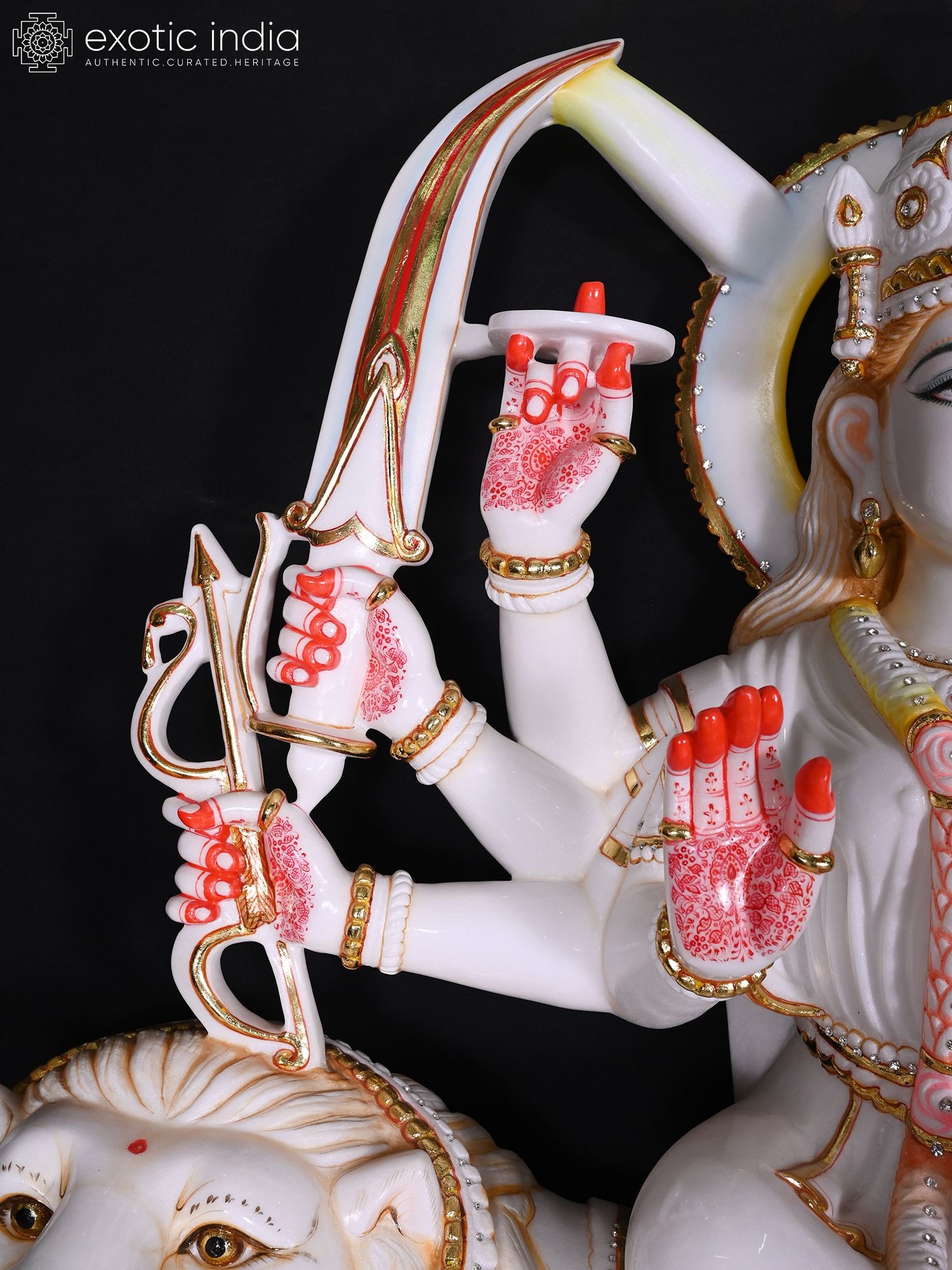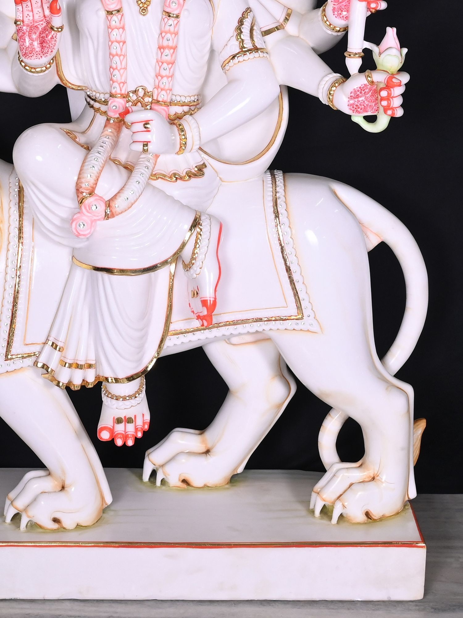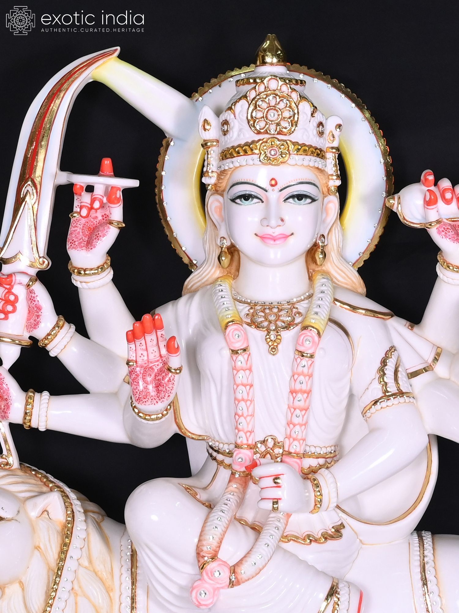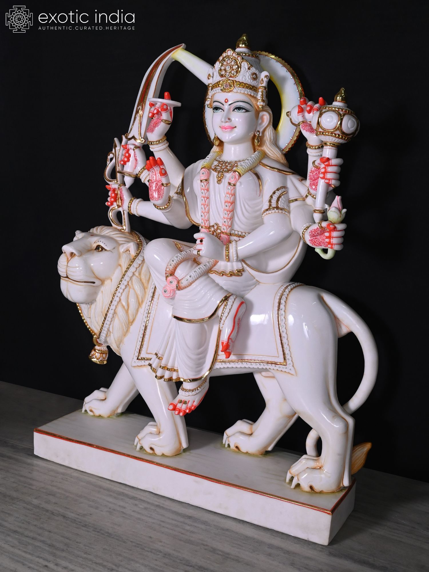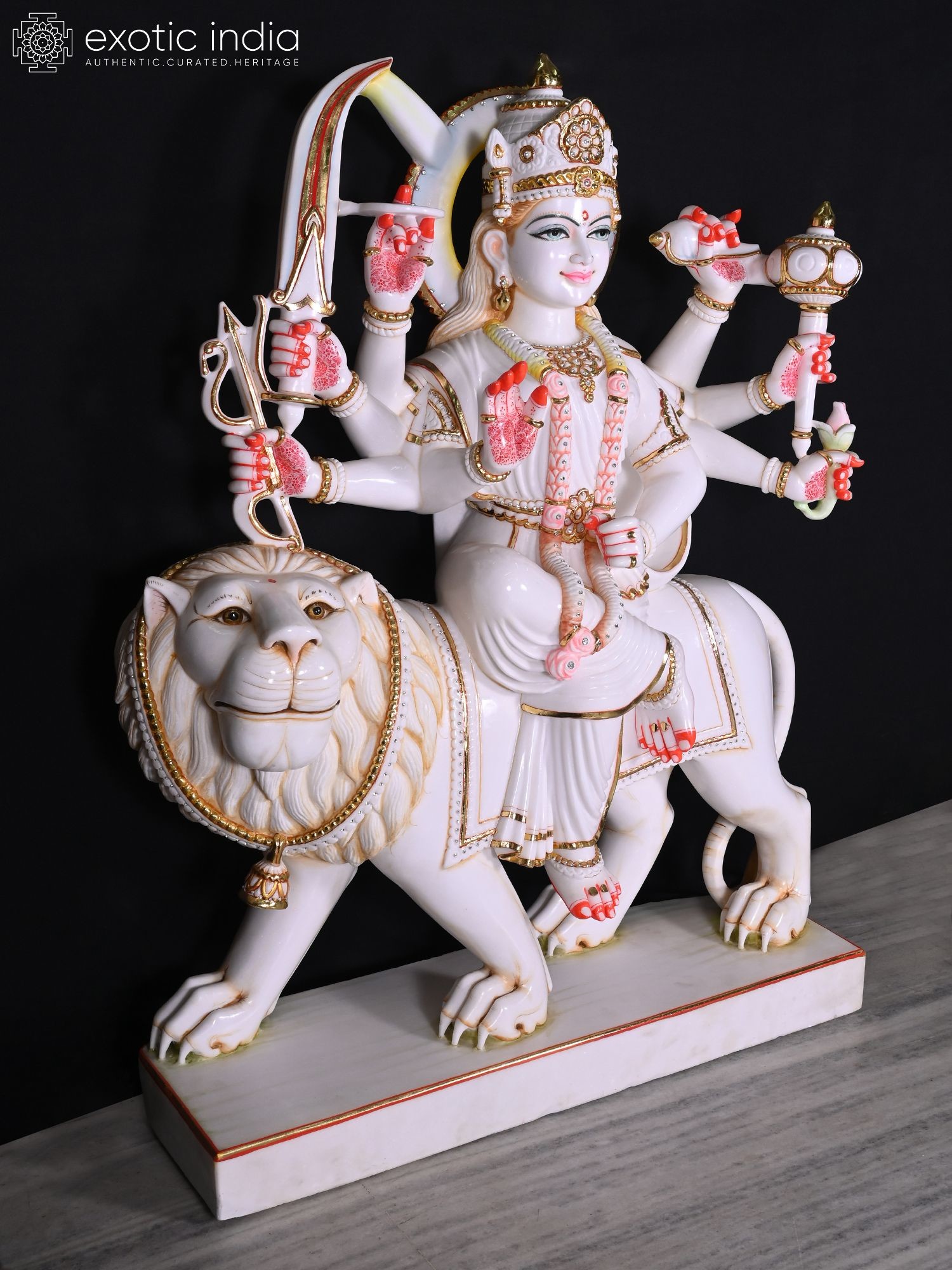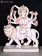 Majestic 48-inch marble statue depicting Goddess Durga, the divine mother and warrior.