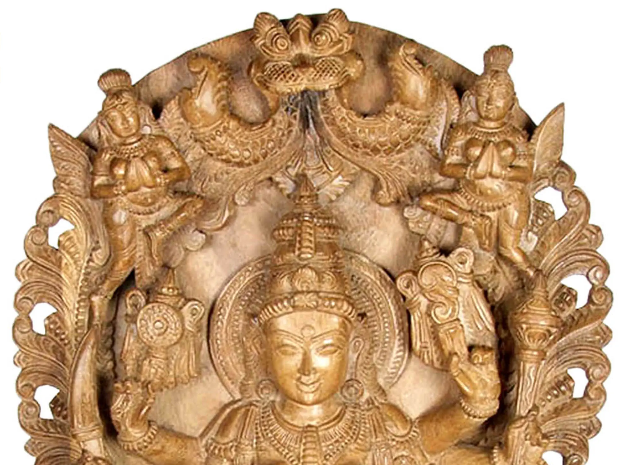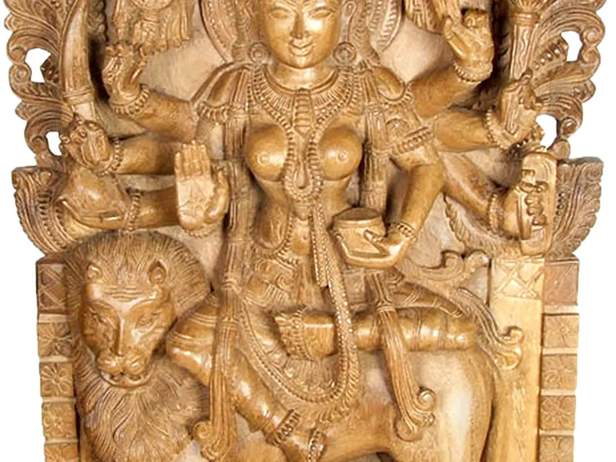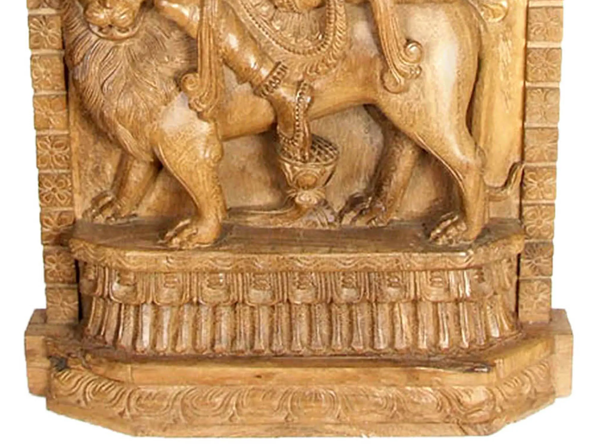 This piece is a testament to the skill of the artisans who created it, showcasing the techniques and traditions passed down through generations. The intricate details, from the ornamentation adorning the goddess to the flowing manes of the lion, and the delicate floral patterns, demonstrate their mastery of wood carving. The natural wood finish adds a touch of earthy warmth, enhancing the overall appeal and bringing a sense of authenticity to the sculpture. The substantial dimensions, at 38 inches tall, make this a significant piece that will command attention and become a treasured centerpiece of any collection. Display this piece with reverence and allow the presence of Durga to fill your space with strength, protection, and divine grace.