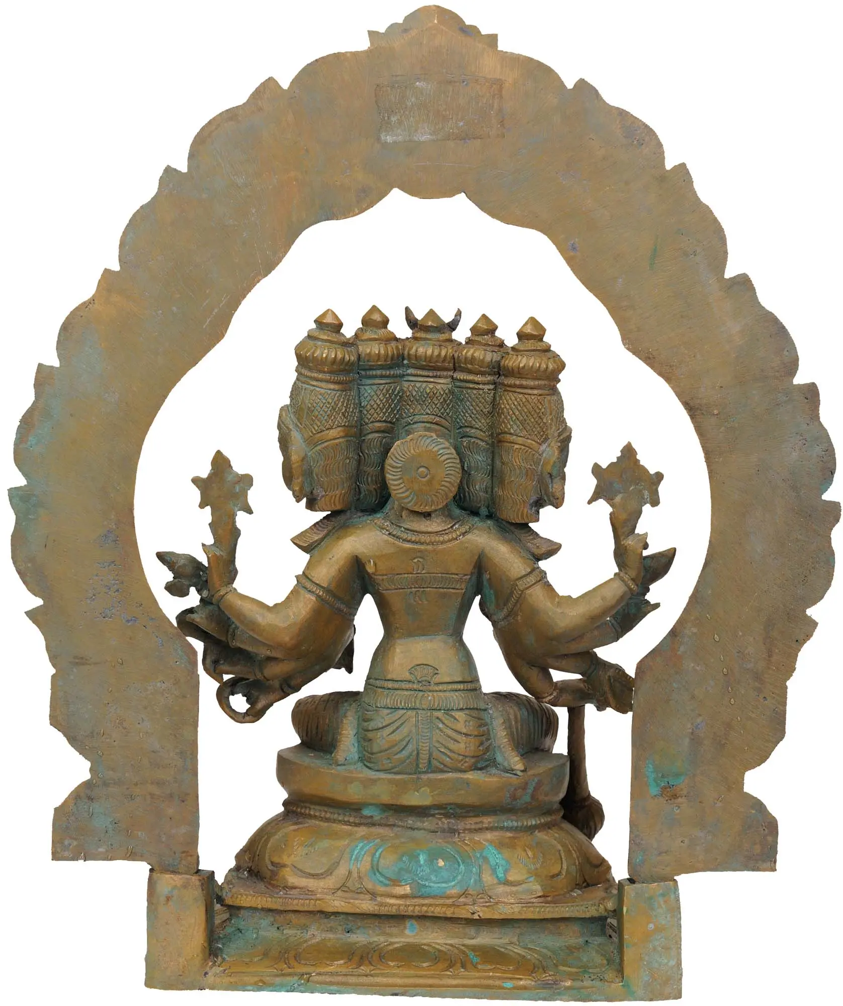 This exquisite bronze statue, meticulously crafted in the traditional style of Swamimalai, South India, captures the multifaceted essence of Goddess Gayatri. She is a revered deity in Hinduism, often invoked for knowledge, spiritual illumination, and the dispelling of ignorance. Her iconography is rich and symbolic, conveying profound theological concepts. The statue depicts her with multiple heads, each representing a different aspect of consciousness or a cardinal direction, signifying her omnipresence and all-encompassing nature. The serene expressions on each face invite contemplation and a sense of divine peace. Her numerous arms, each holding symbolic implements, further emphasize her power and ability to manage the complexities of the universe.