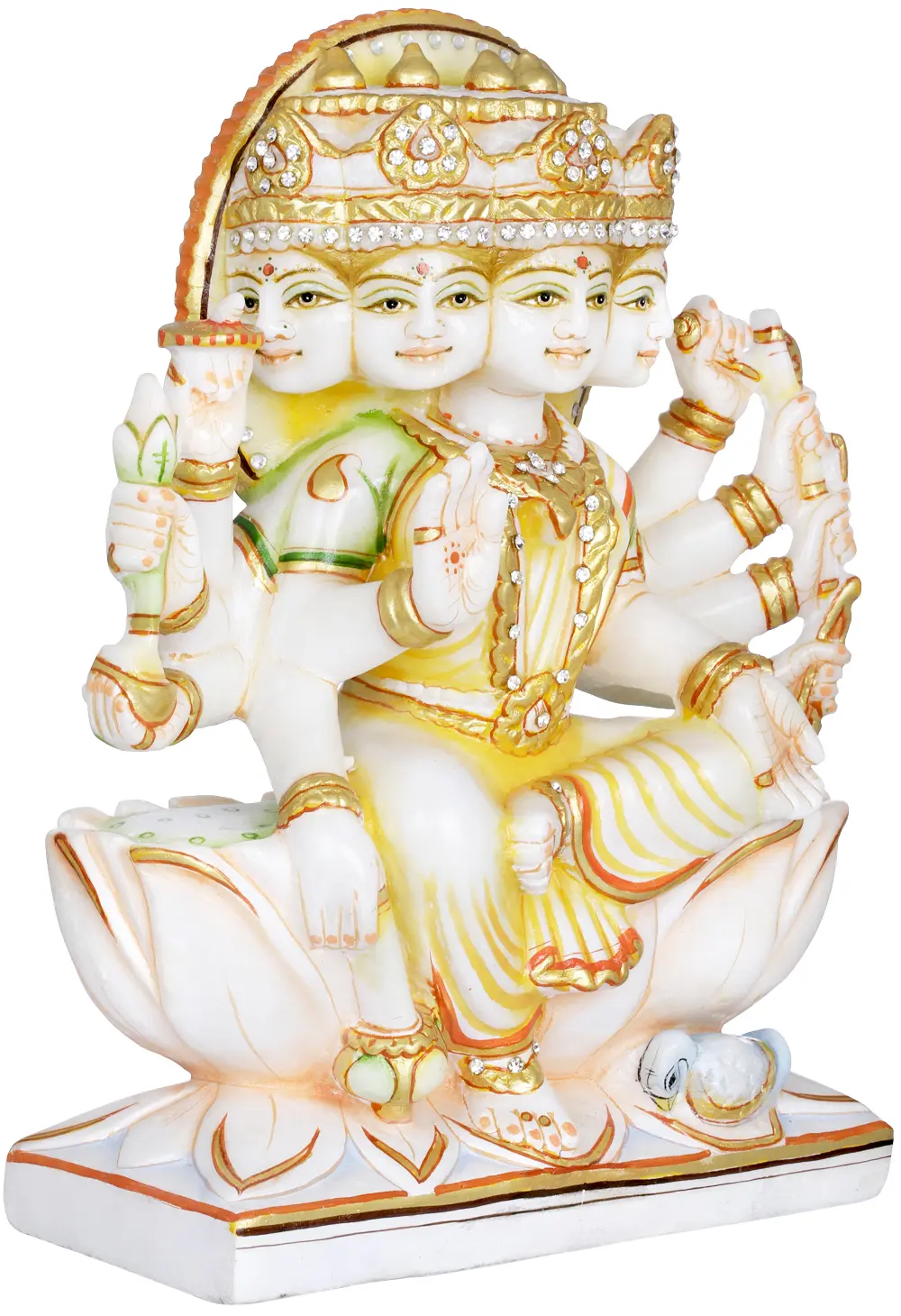 This exquisite statue captures the radiant essence of Goddess Gayatri, a revered deity in Hinduism, symbolizing purity, knowledge, and spiritual enlightenment. Crafted from pristine white marble, the sculpture exudes an aura of divine grace and serenity. Goddess Gayatri is depicted with her iconic five faces, each representing different aspects of cosmic awareness: the west for *prithvi* (earth), the north for *jala* (water), the east for *agni* (fire), the south for *vayu* (air), and the upward-facing face for *akasha* (ether or sky). This polycephalic form signifies her omnipresence and her mastery over the fundamental elements that constitute the universe.
