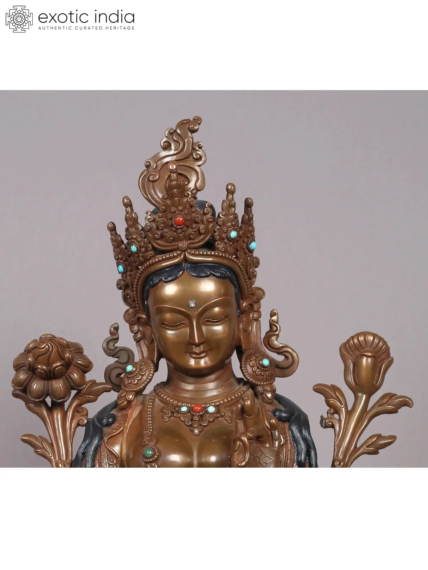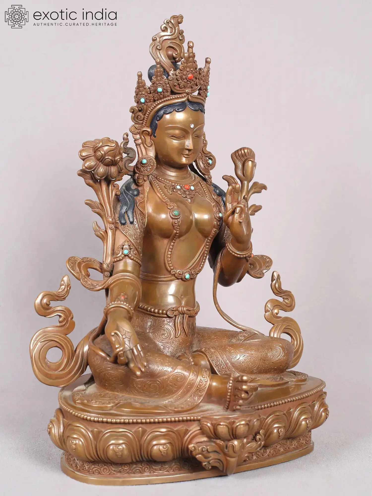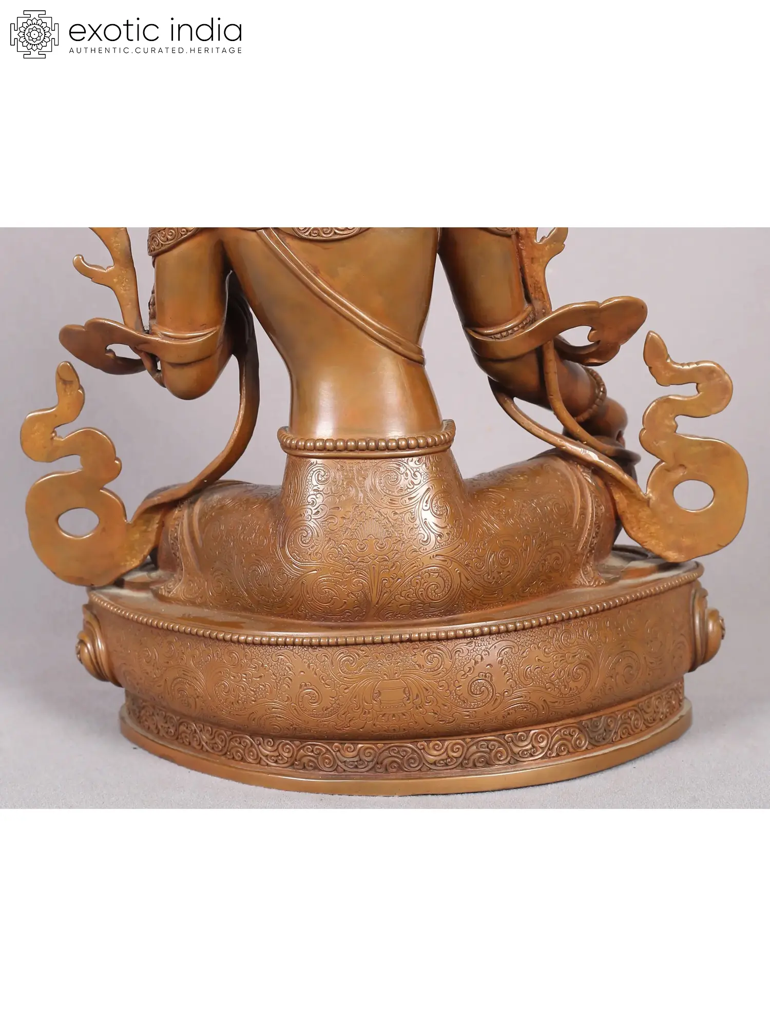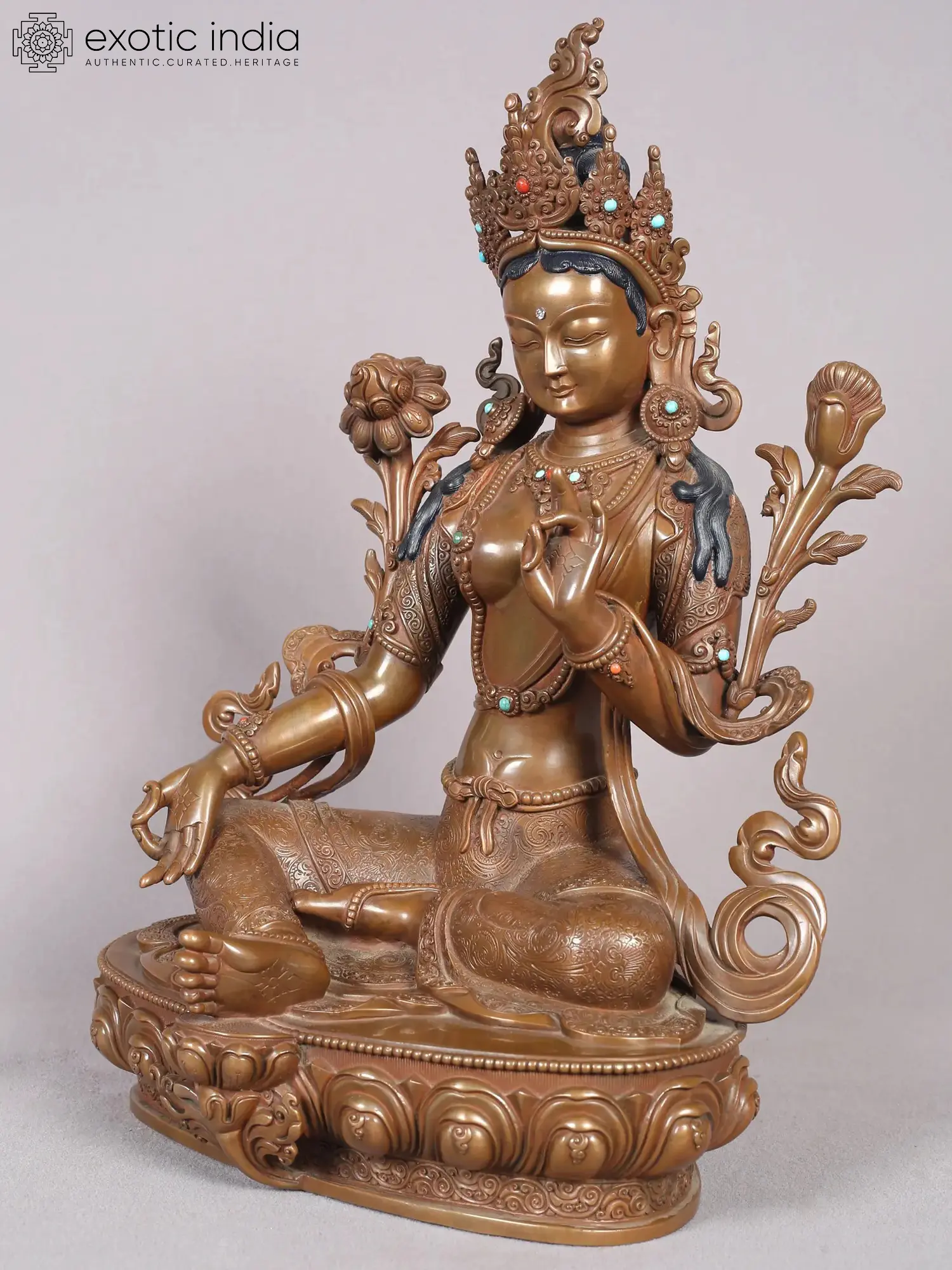 Breathtakingly sculpted as an earthly representative of goddess Green Tara’s mystical presence, this copper statue from Nepal has been infused with life sculptor. On a delicately shaped lotus, the lithesome form of Green Tara appears, holding lotuses in her hand and smiling inwardly. She is adorned by exquisite Nepalese ornaments and attired in a brocaded skirt that clings to her form. A diaphanous scarf around her torso forms dreamy waves on her sides. The aura of goddess Green Tara in this icon is mesmerizing, assuring the heart of her benevolence and enlightened state.