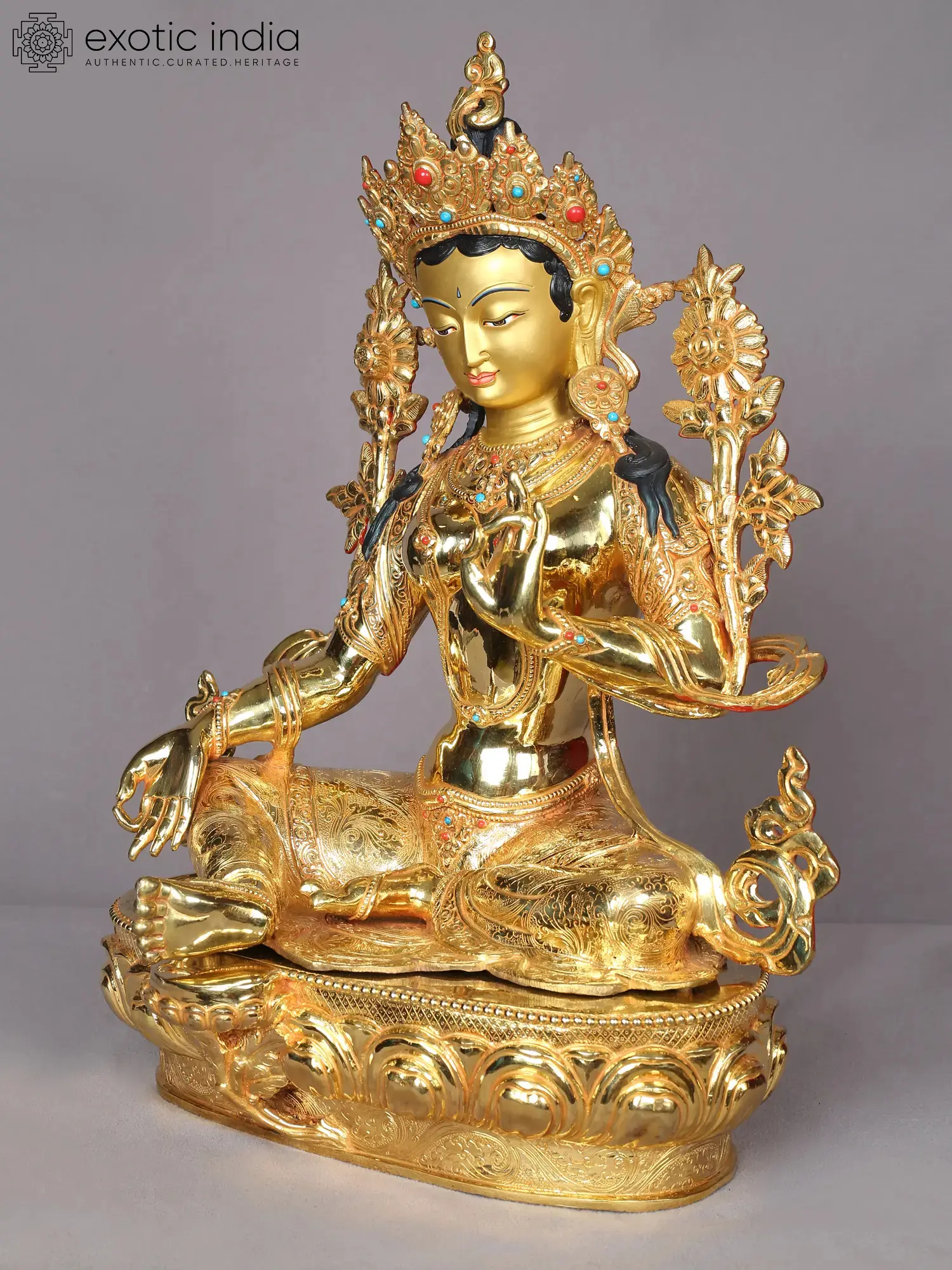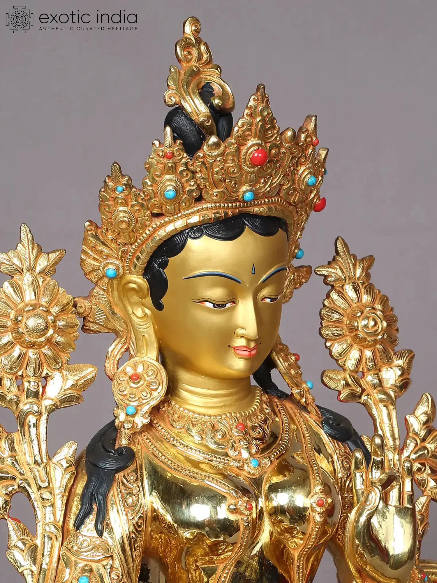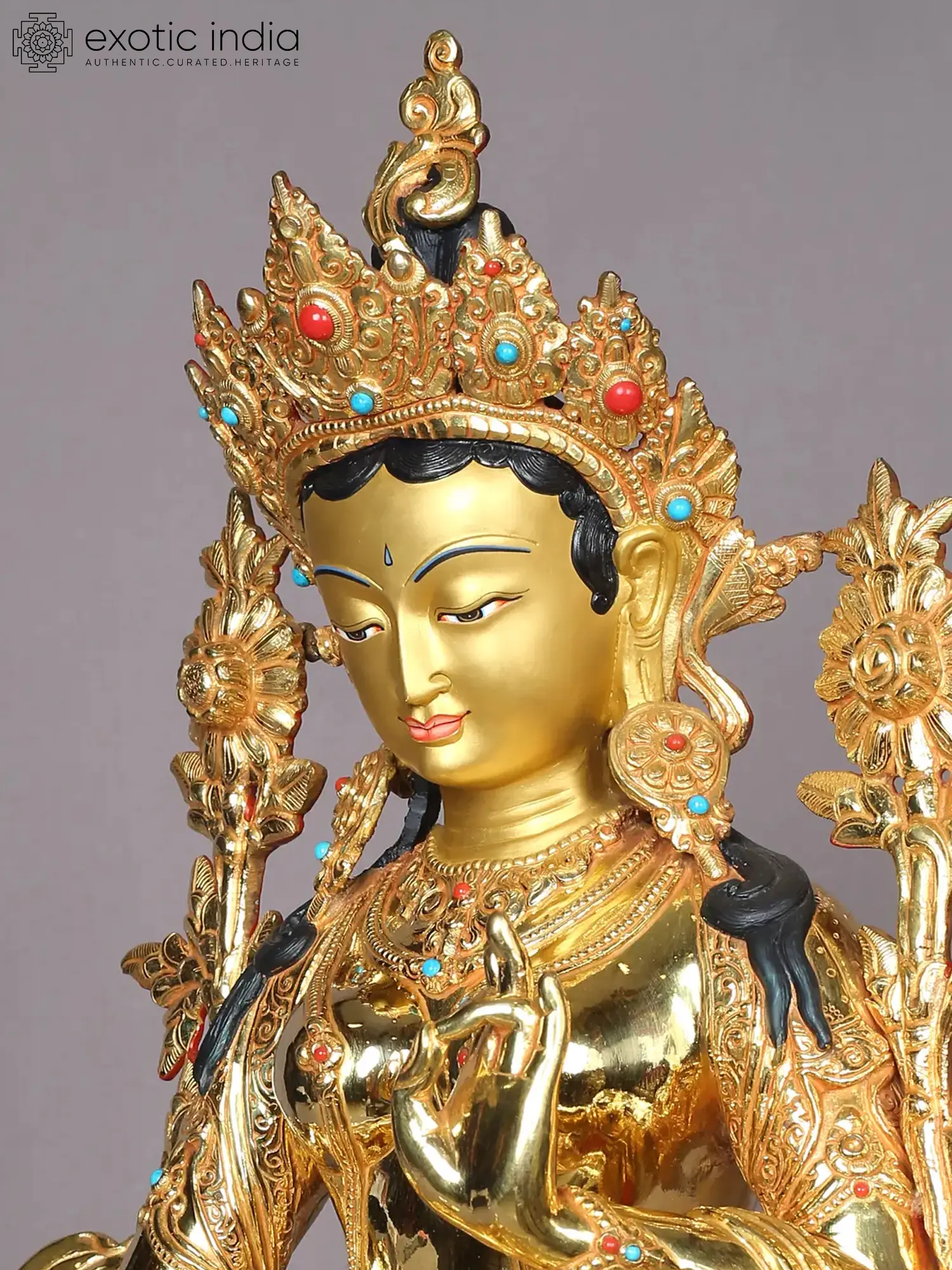 As if goddess Tara chose this icon for her appearance on the earth, the gilded copper statue brims with a serenity that washes over you. Majestically adorned, the brocaded attire of Green Tara is adjusted in lyrical waves around her which speak for the sculptor’s ability to mold hard metal masterfully. The eyes, mouth, fingertips, torso, toes- each aspect of Tara in this icon makes us believe that the goddess is illuminating the statue herself. The layered platform is splendidly adorned and is a fitting seat for the glorious goddess.