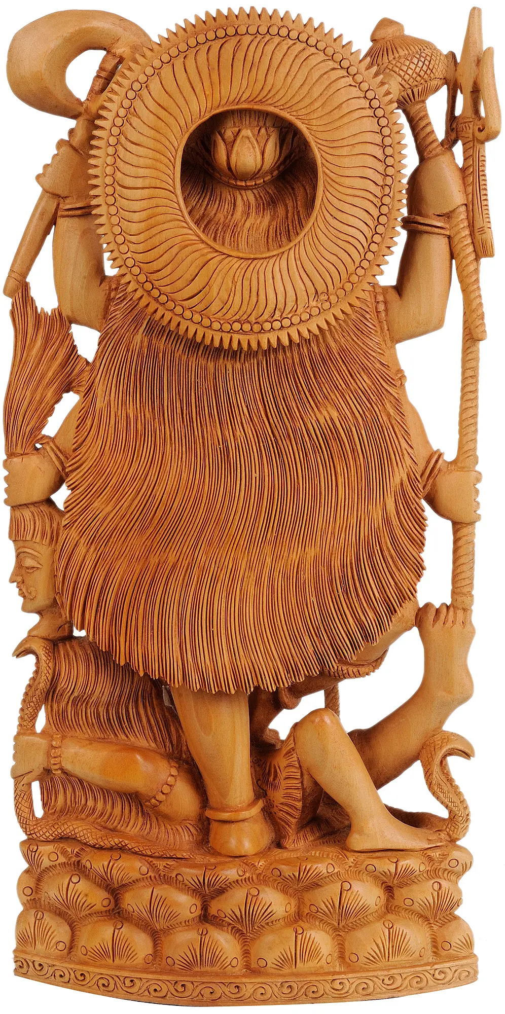 This exquisitely crafted statue invites you to connect with the formidable energy of a powerful Hindu goddess. The sculpture, carved with precision from Kadamba wood, showcases a deity revered for her fierce protection, boundless compassion, and transformative power. Every detail, from the flowing hair to the multiple arms wielding symbolic weapons, speaks to her dynamic nature. The artisans in Jaipur, India have masterfully breathed life into the wood, capturing the potent essence of a goddess who embodies both destruction and creation. This is more than just a carving; it’s a tangible representation of an ancient and enduring spiritual force.