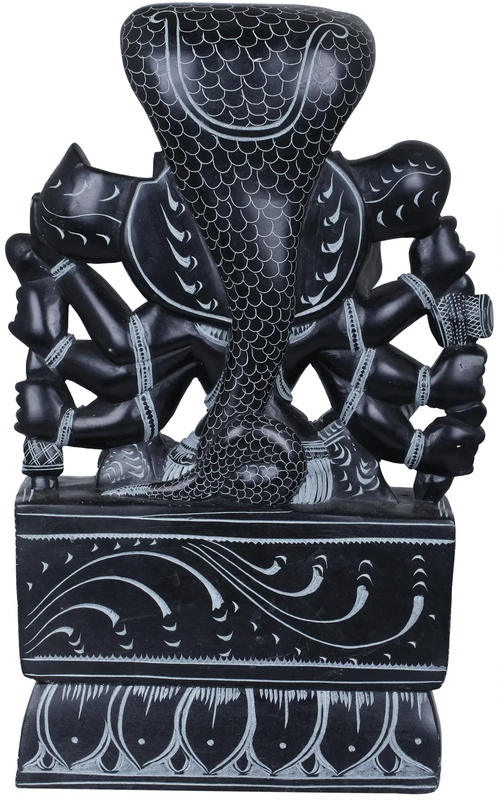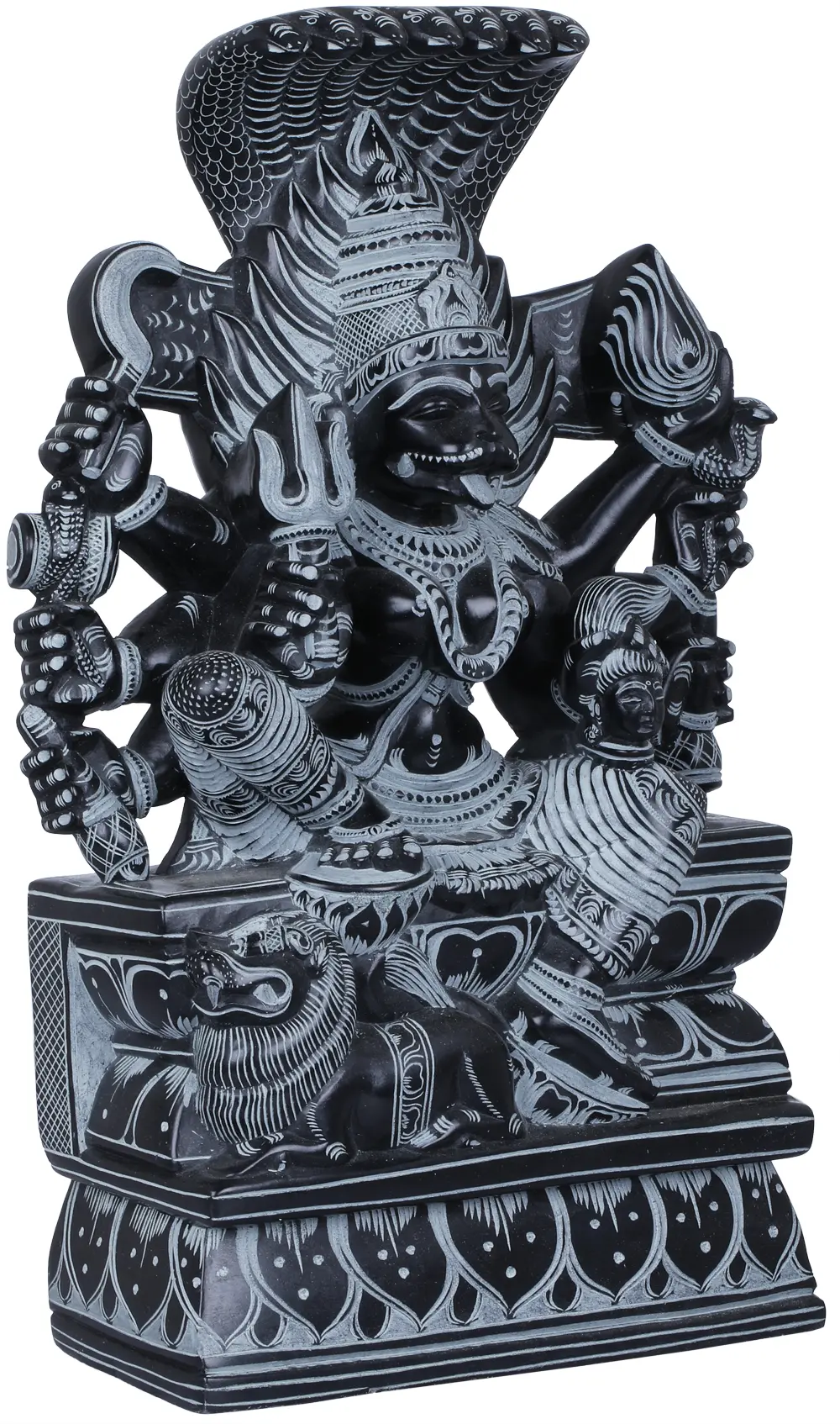 In this statue, Bhadrakali sits in a dreadful posture with eight hands holding her various sacred weapons and flames burning out from her head. Her face is that of the ferocious lion with a protruding tongue, one also sits on the pedestal complementing her terrible form. The unique multilayered crown resembles the structure of a South Indian temple and the Sheshnag peeping out above her head. The sculpture is exceptionally scored applauding the sculptor’s hardwork, patience and tenuity.
