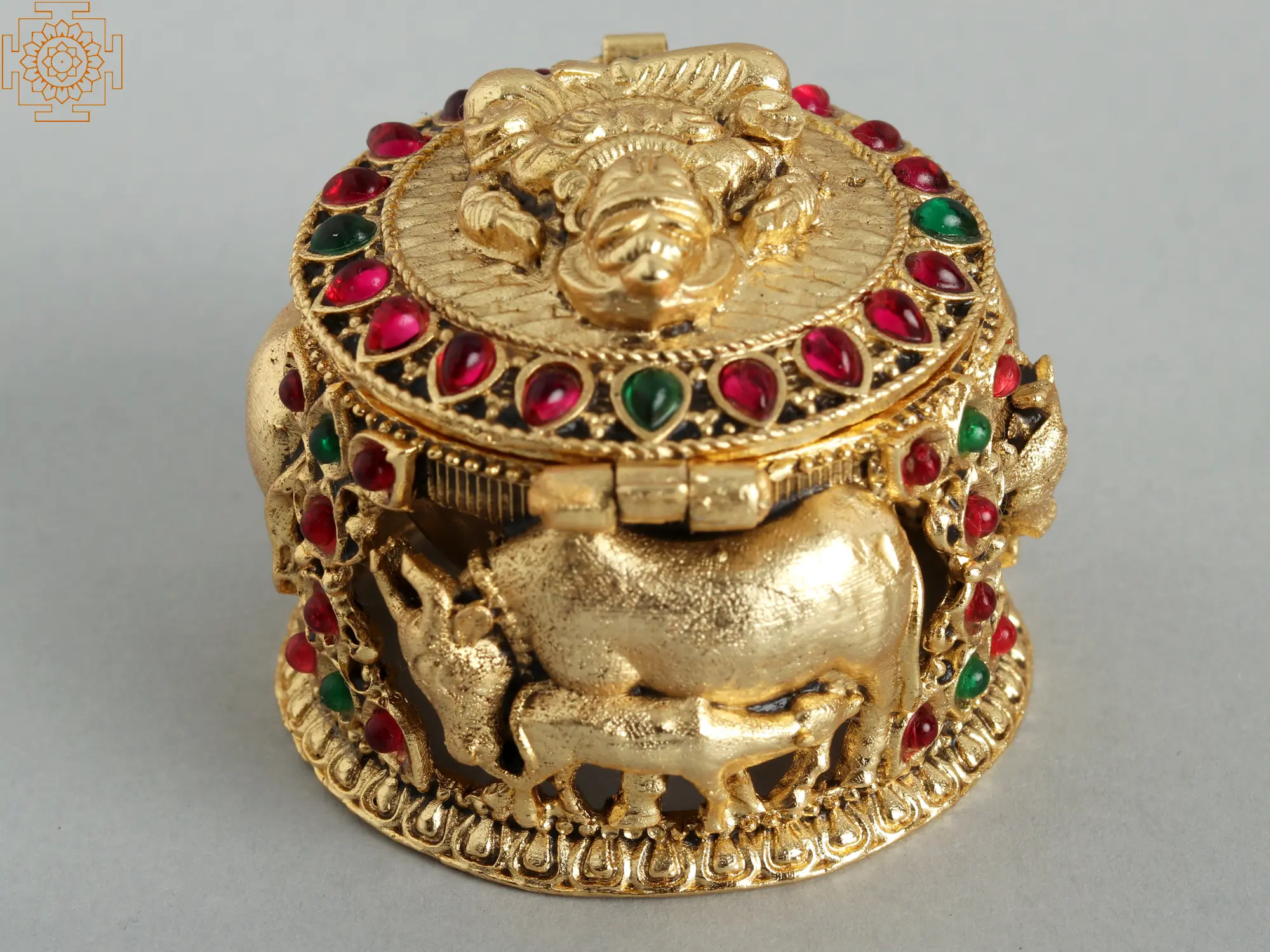 This lovely Kumkum box, also known as Kumkuma Chimil or Kumkum Chimiz, oozes elegance and sanctity. The Kumkum or Sindoor, which is frequently used in Hindu ceremonies as a gift to the deities, is required to be kept in boxes or tiny receptacles that have been cleaned and are appropriately made to store it. This ritual object is made of brass, a metal known for its toughness and associated with good fortune. It is adorned with red and green semi-precious stones. The lid of the box has the sacred sign of Goddess Lakshmi, while the body is adorned with representations of a cow and her calf. Both pictures emphasize holiness. This container is additionally adorned with a gleaming golden tint, which adds to its regal aspect and makes it a perfect complement to spiritual practices. Keeping the holy powder in this Kumkum box would instill hope and devotion.