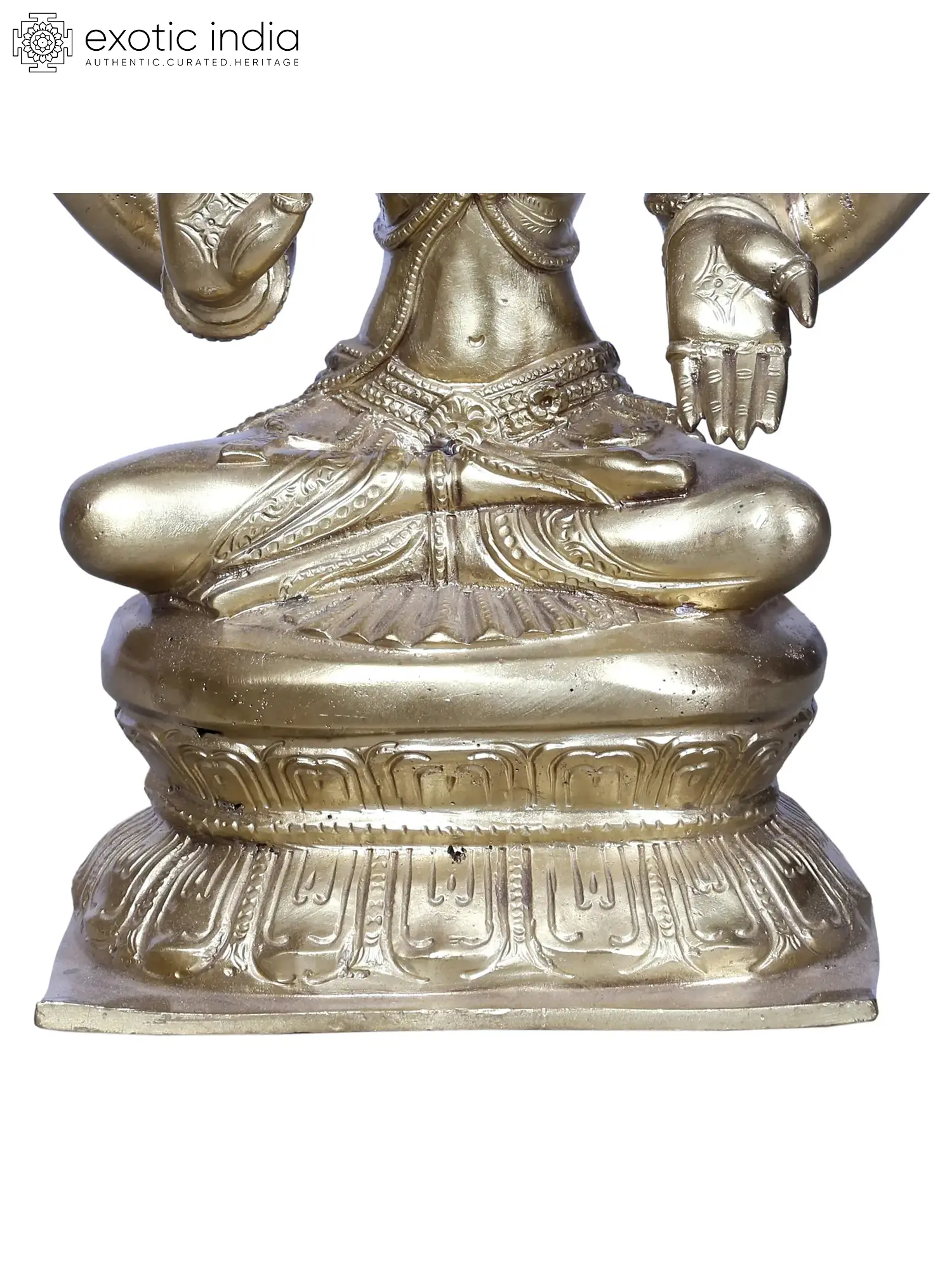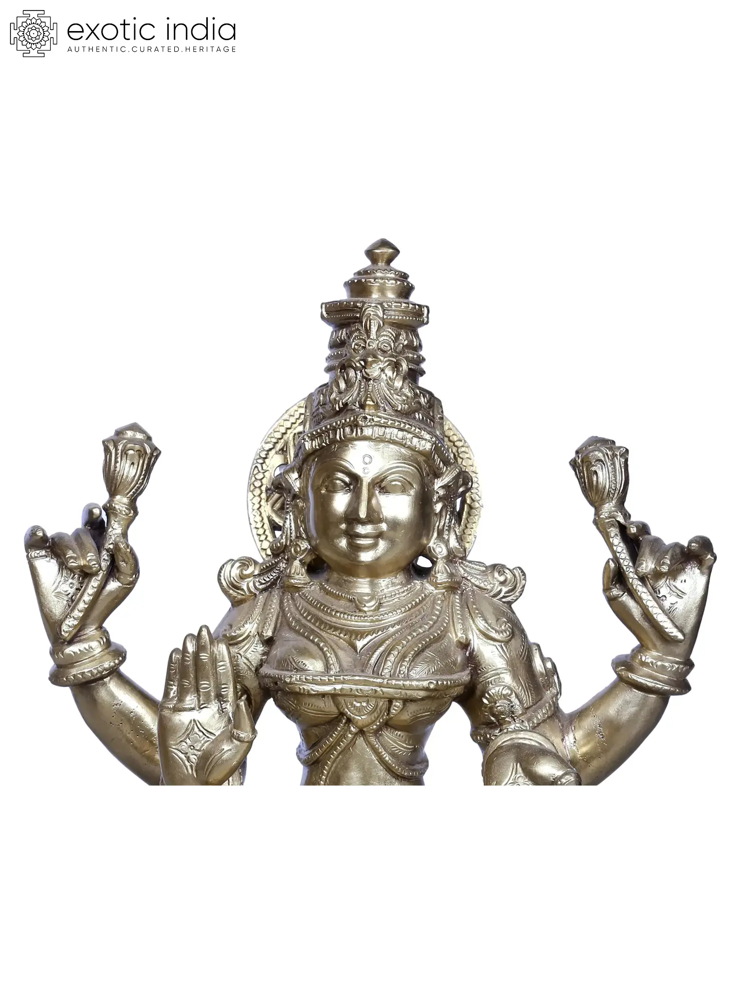 This exquisite brass statue captures the serene and benevolent presence of Goddess Lakshmi, the divine bestower of wealth, fortune, and auspiciousness in Hindu tradition. Seated in a posture of perfect balance and tranquility, the Goddess emanates an aura of peace and abundance that will transform any space into a sanctuary of good fortune. Her four arms, a common depiction symbolizing her multifaceted nature and ability to bestow blessings in all directions, are adorned with intricate bracelets and hold symbolic objects. In two hands, she holds lotus buds, representing purity, spiritual growth, and the unfolding of prosperity. The other two hands are raised, one in a gesture of blessing (abhaya mudra) offering protection and dispelling fear, and the other gently resting, perhaps signifying her nurturing presence.