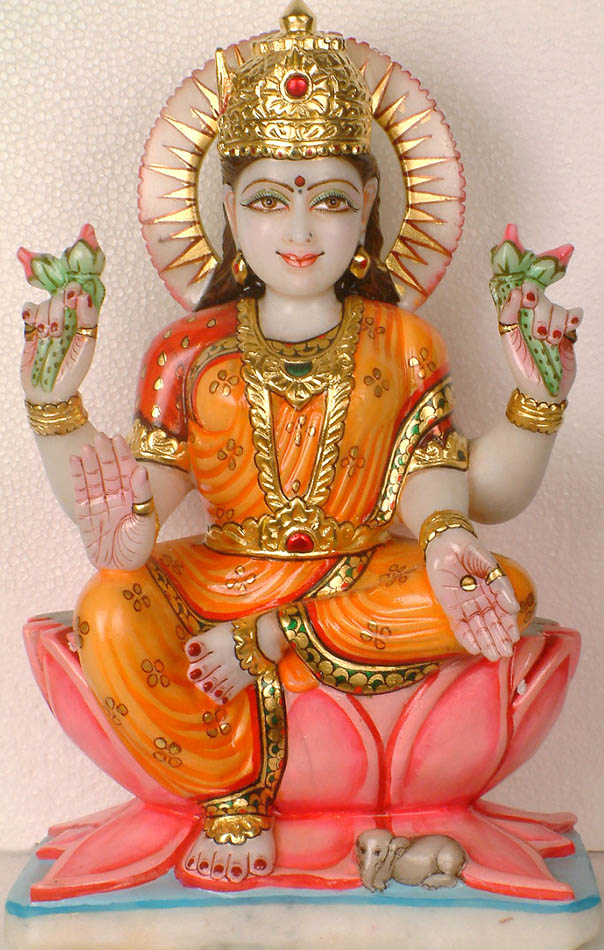 Iconographically, Goddess Lakshmi is described as a fair lady, generally with four arms, seated or standing on a lotus, dressed in fine garments and precious jewels. She has a benign countenance, is in her full youth and yet having a motherly appearance.